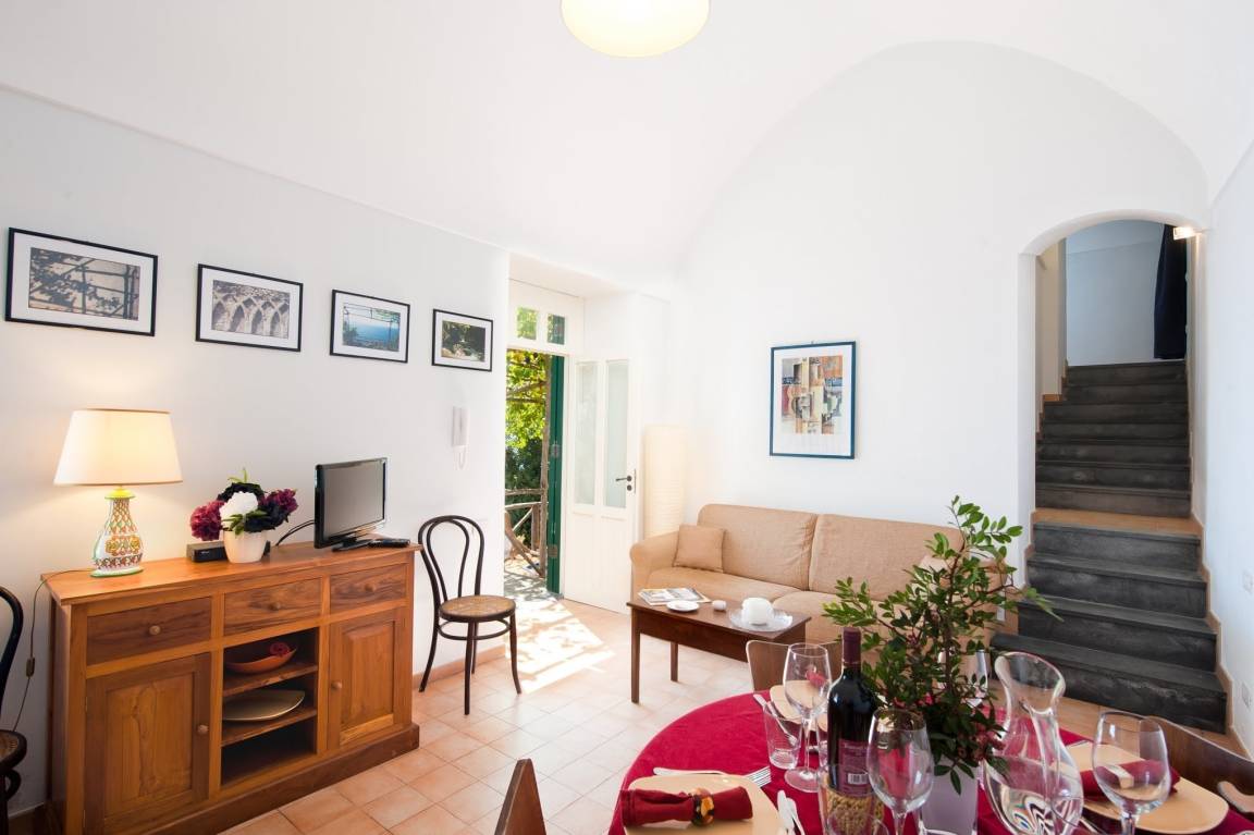 Im 1. Stock finden Sie ein weiteres Bad, ein Schlafzimmer mit zwei Einzelbetten und das Herzstück des Hauses, nach dem es auch benannt ist: das Doppelzimmer, in dem die gewölbeartige Decke aufwendig bemalt und mit Geigen verziert ist. Wenn Sie des Morgens erwachen, blicken Sie durch ein kleines Fensterchen auf Amalfi oder durch das Fenster zu Ihrer Rechten auf die seichten Wellen des Meeres.