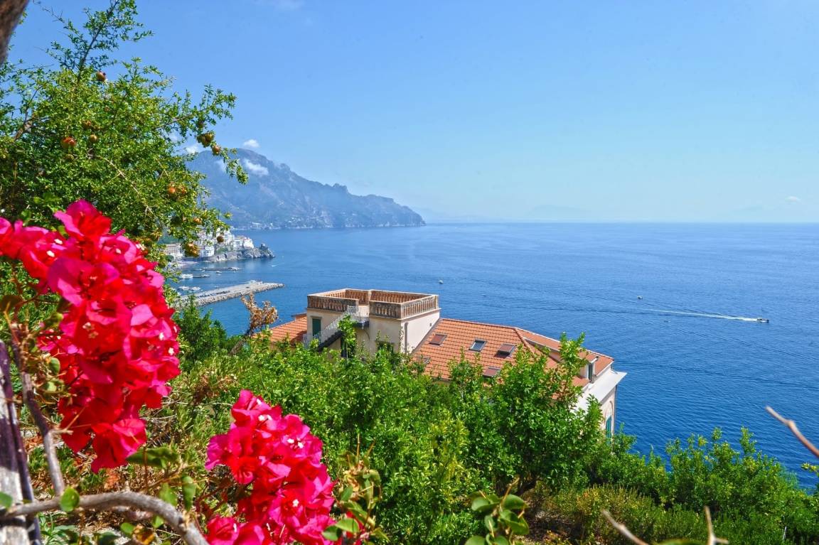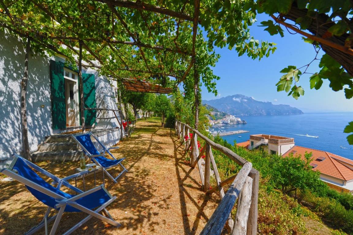 Eine atemberaubende Aussicht auf das strahlend blaue Mittelmeer und einen faszinierenden Blick auf Amalfi selbst genießen Sie von allen Zimmern sowie der Terrasse des Ferienhauses Villino dei Violini, das etwas abseits des Zentrums liegt und perfekt für all diejenigen ist, die das bunte, geschäftige Treiben der Amalfiküste erleben und gleichzeitig ein angenehmes, ruhiges Urlaubsambiente genießen möchten.