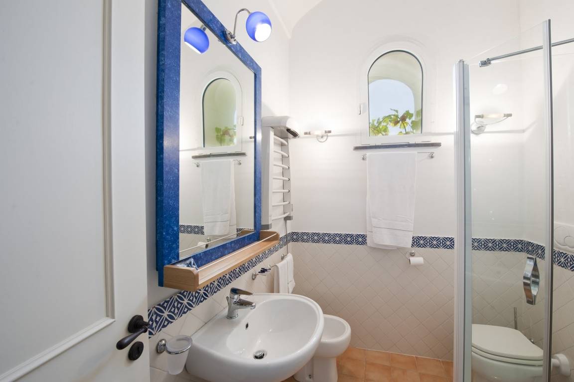 A half-bath, a twin bedroom and a double bedroom are located on the 1st floor. The double, which Villino dei Violini has been named for, with its elaborately painted vaulted ceiling adorned with violins might well be called the centerpiece of the house. After waking up in the morning, you can start into your day by looking out onto Amalfi from the small window and onto the shallow waves of the sea from the other window.