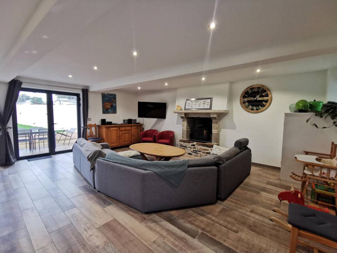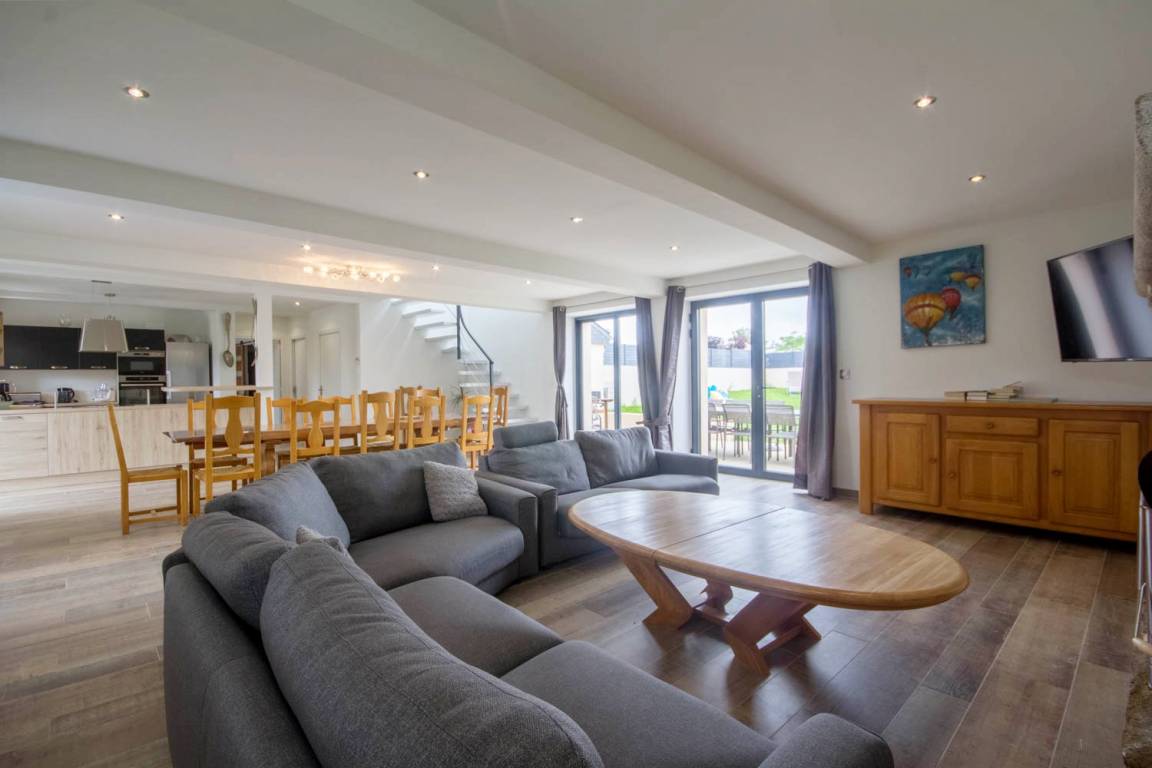 Diese Ferienwohnung bietet im Erdgeschoss ein sehr großes, helles und komfortables Wohnzimmer mit moderner und voll ausgestatteter Küche, ein Wohnzimmer und eine Lounge, die sich nach außen öffnen. Ein Schlafzimmer (1 Bett 140) zugänglich für Rollstuhlfahrer mit Dusche und WC. Wäschekammer.