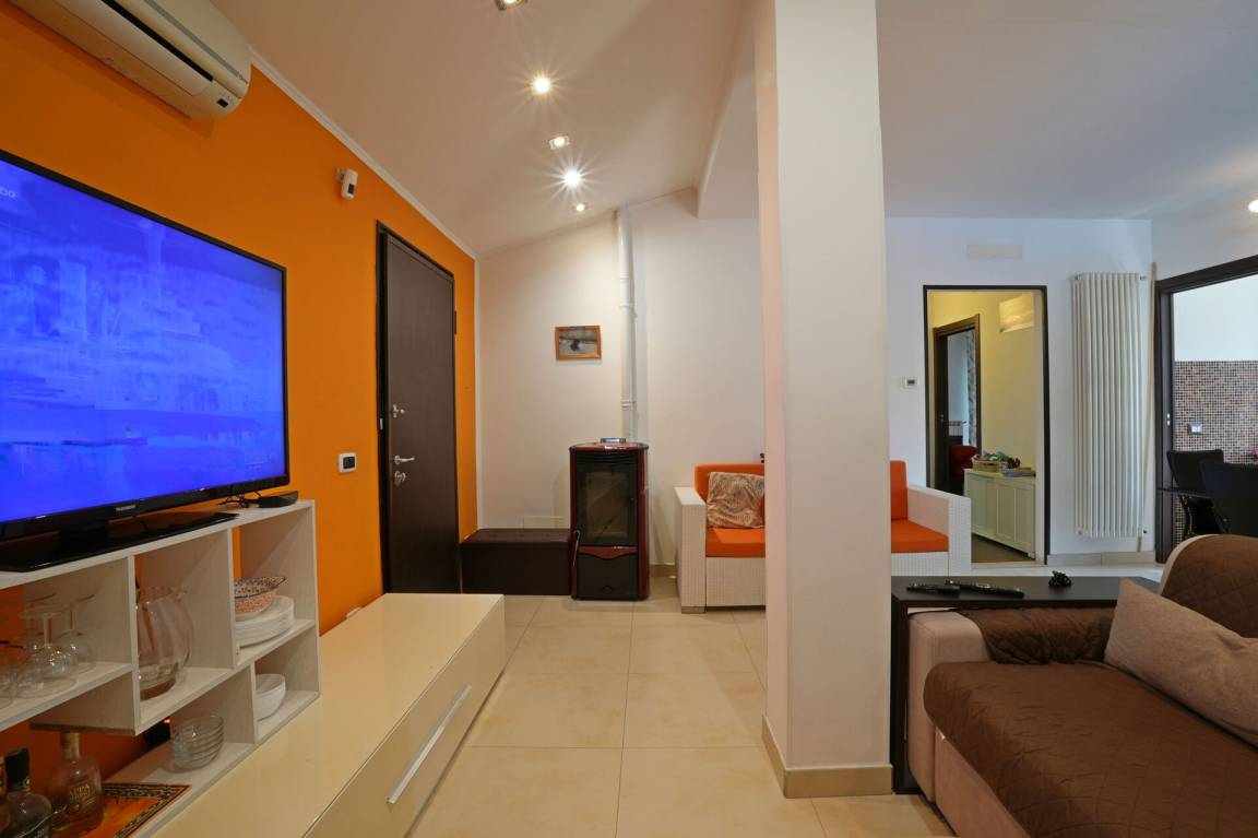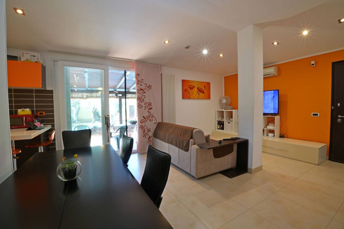 Wohnküche: Esstisch (Personen: 5), Spülmaschine, Kühlschrank, Tiefkühler, Herd, Ofen, Italienische Kaffeemaschine, Doppel-Schlafsofa, WiFi Internet, Klimaanlage, TV, Ausgang auf die Veranda.