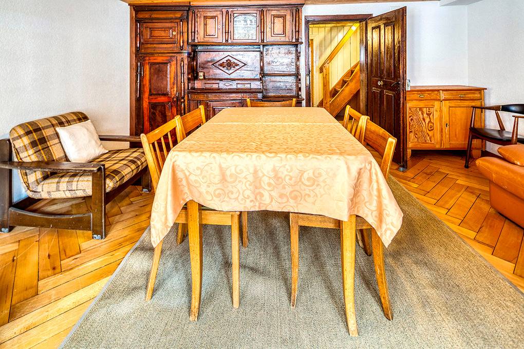 Haus: Regionaltypisches Ferienhaus mit funktionaler Ausstattung. Zwei Chalethälften, die einzeln oder gemeinsam gebucht werden können. 4 1/2-Zimmer-Chalethälfte mit 75 qm Wohnfläche über 3 Etagen. Uriges Holzhaus mit schon älterer aber gepflegter, gemütlicher Einrichtung, niedrigen Zimmerdecken (ca. 1,90 m). Internetzugang über W-Lan. Jede Haushälfte verfügt über einen eigenen Eingang, Waschmaschine, Trockner, Skiraum. Zentralheizung. Nichtraucherhaus. Nur ein reservierter Pkw-Stellplatz für beide Haushälften, Verfügbarkeit kann nicht garantiert werden. Öffentliche Tiefgaragenplätze im Ort (Gebühr) oder kostenfrei parken im Nachbarort Hospental.