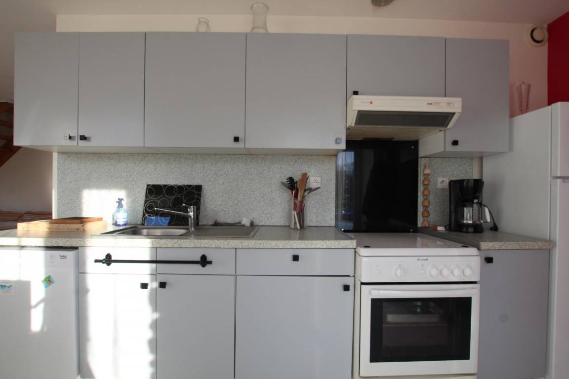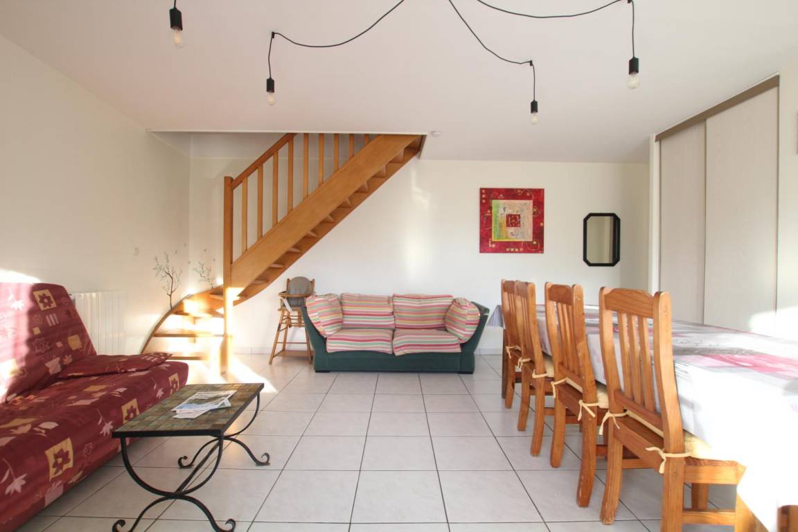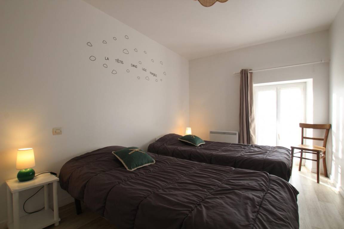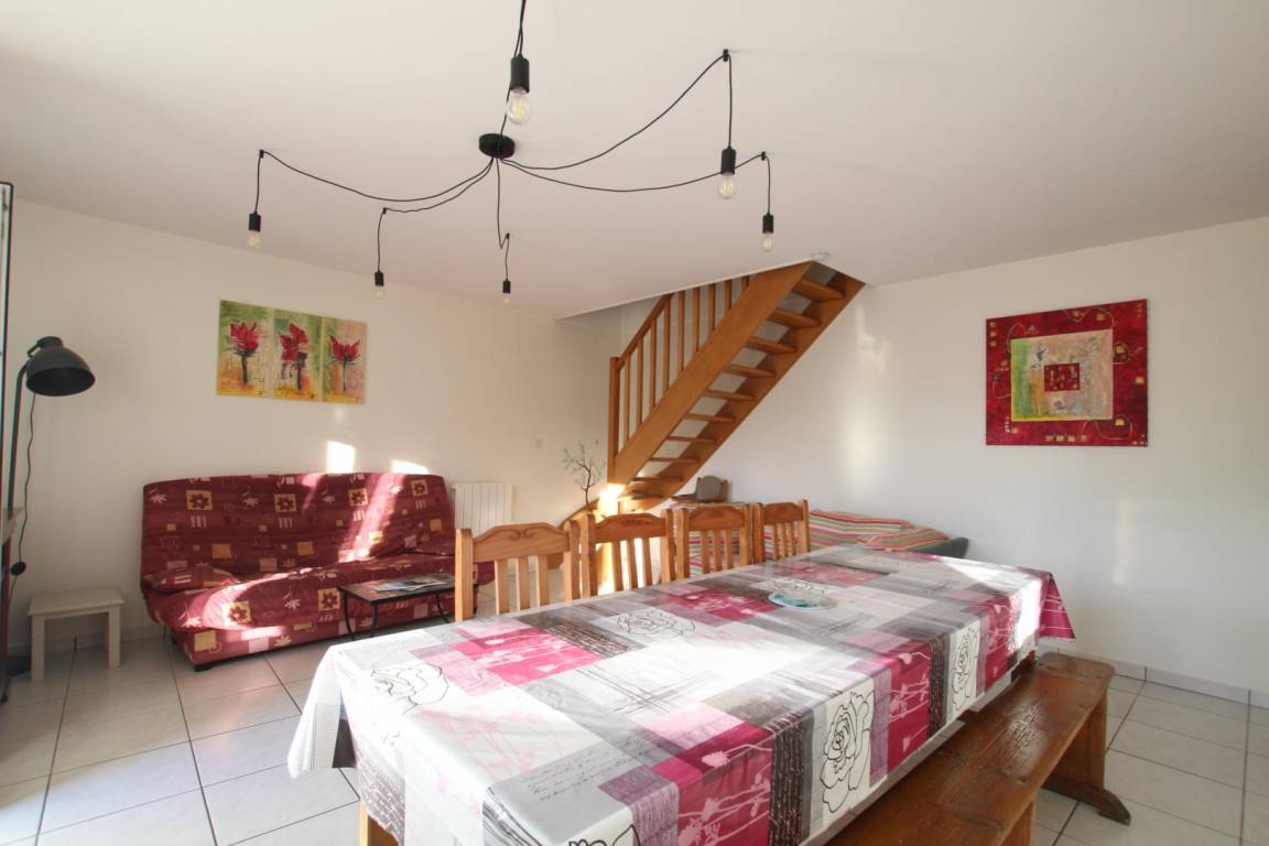 Haus, das an eine andere Mietunterkunft angrenzt. Wohnzimmer (TV). Kochnische (Backofen, Geschirrspüler, Kühlschrank mit Gefrierfach, Mikrowelle). Duschraum (Waschmaschine). Toilette. Im Obergeschoss: Schlafzimmer 1 (1 Bett 140x190). Schlafzimmer 2 (2 Betten 90x190). Schlafzimmer 3 (1 Bett 140x190). Toilette. Kinderbett und Hochstuhl auf Anfrage. Bettwäsche kann gemietet werden. Haushaltswäsche wird nicht gestellt. Elektroheizung gegen Aufpreis. Reinigungsservice auf Anfrage. Gemeinsames, nicht eingezäuntes Grundstück. Private Terrasse. Gartenmöbel. Grill. Schaukel.