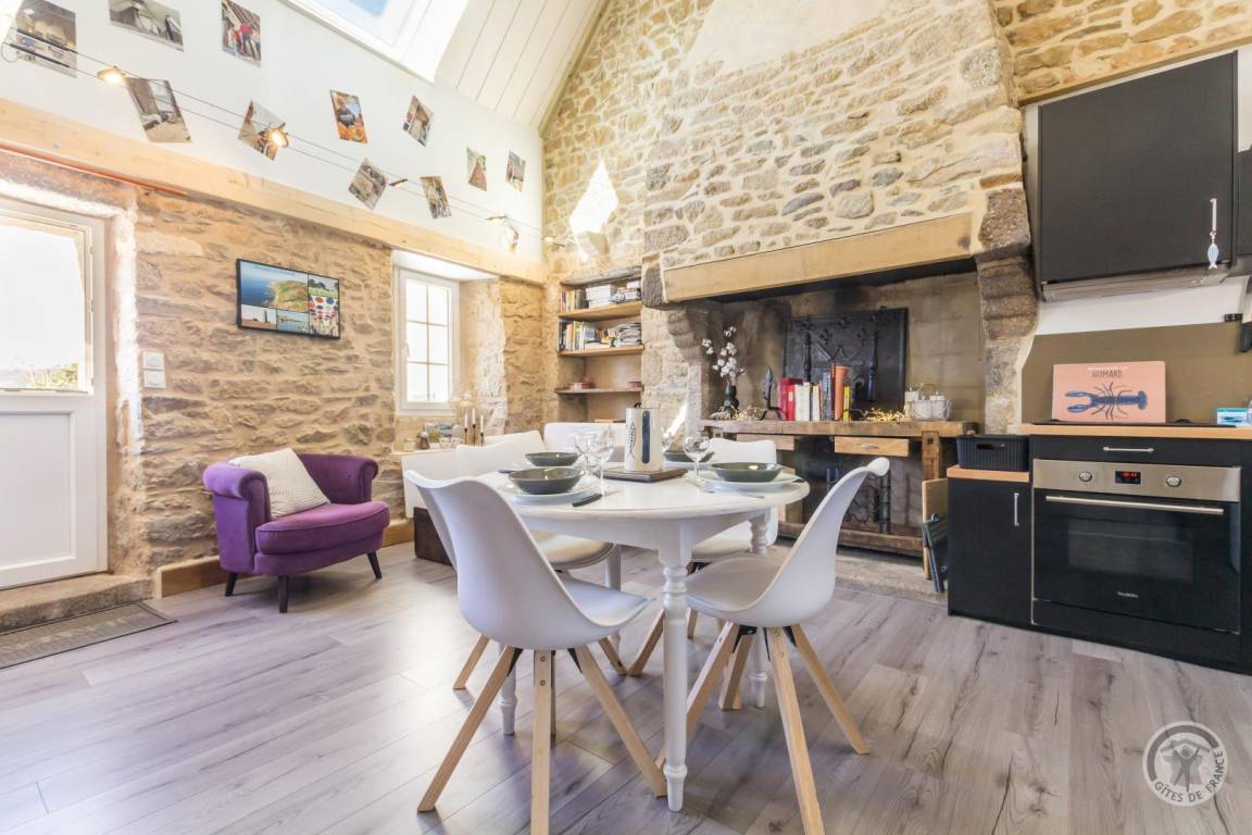 Zwischen Saint-Vaast-la-Hougue und Barfleur gelegen, empfängt Sie dieses Ferienhaus in einem friedlichen Dorf im Herzen des Val de Saire. Das komplett renovierte Haus vereint modernen Komfort mit dem Charme vergangener Zeiten. Lassen Sie sich von den erhaltenen authentischen Details wie dem großen Kamin und den freigelegten Steinwänden verzaubern, die dem Haus eine warme und einladende Atmosphäre verleihen. Draußen lädt eine geräumige, nach Südwesten ausgerichtete Terrasse zum Genießen sonniger Tage und zum Bewundern des Ausblicks auf den Hügel Pernelle ein. Dank seiner idealen Lage zwischen Meer und Landschaft ist dieses Ferienhaus ein perfekter Ausgangspunkt, um die unberührten Landschaften der Halbinsel Cotentin, ihre malerischen Häfen und Küstenwege zu erkunden.