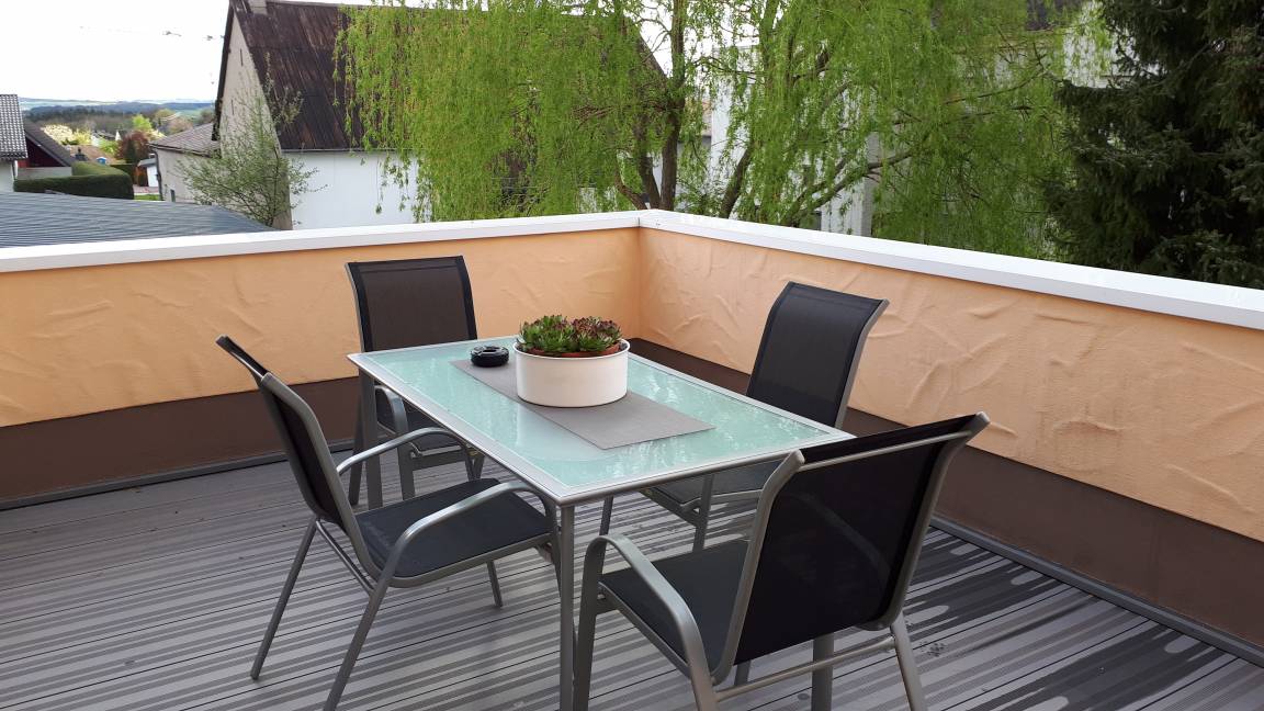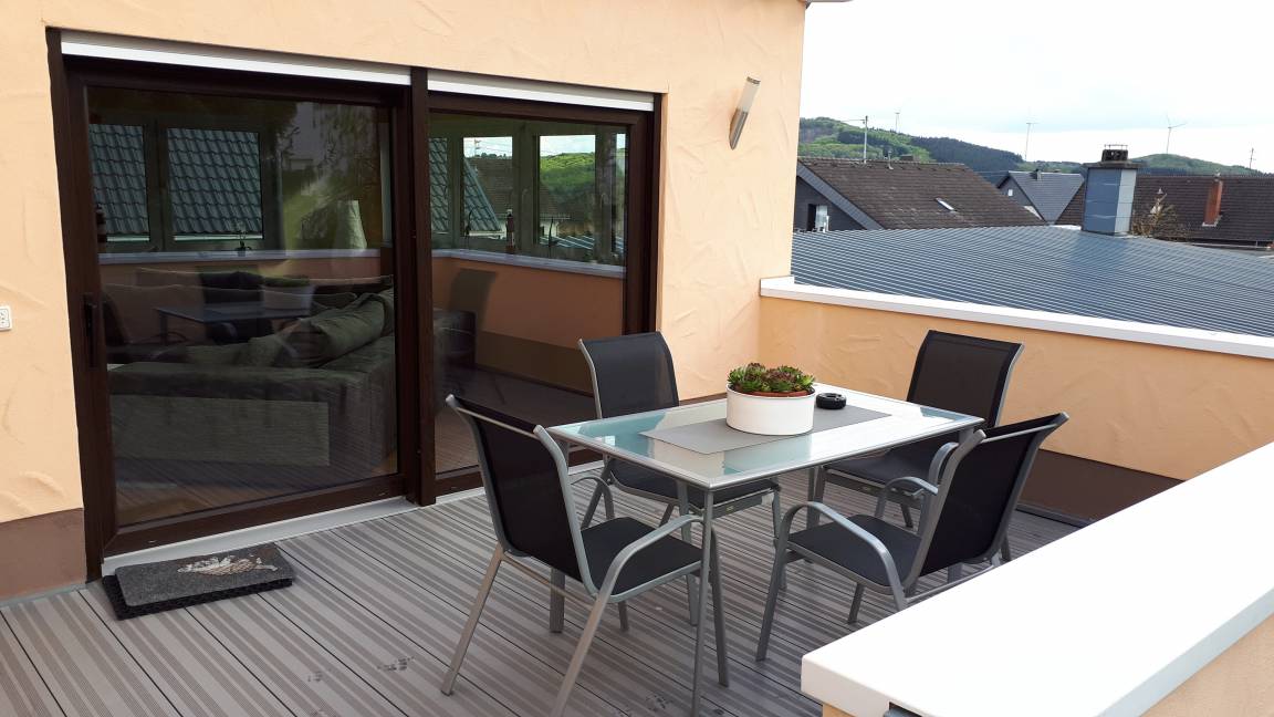 1. OG: Wohnküche, großes Wohn-/Esszimmer mit Kaminofen, ein Schlafzimmer, ein Gäste-WC und die Terrasse mit Gartenmöbeln.
