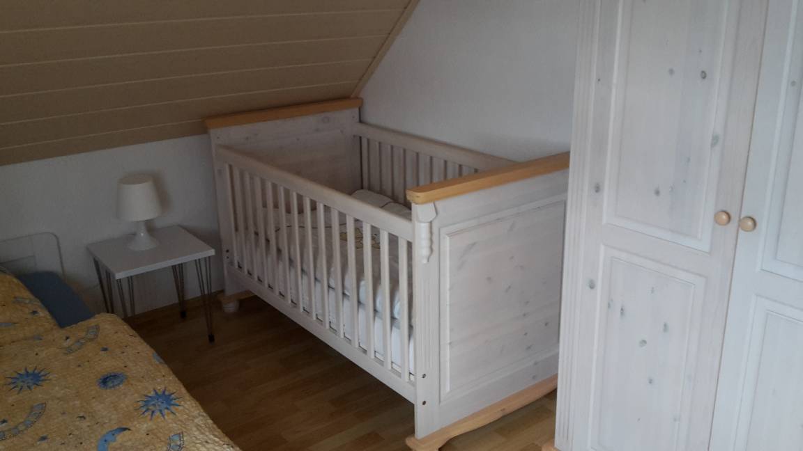Baby-/Kinderbett und Wickelkommode vorhanden.