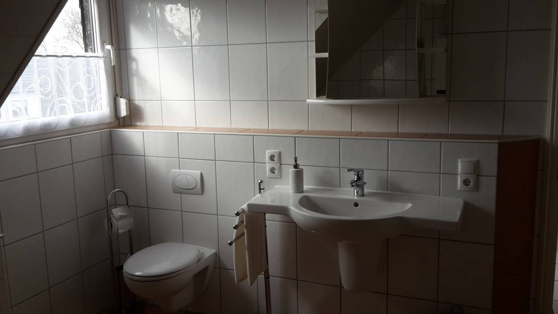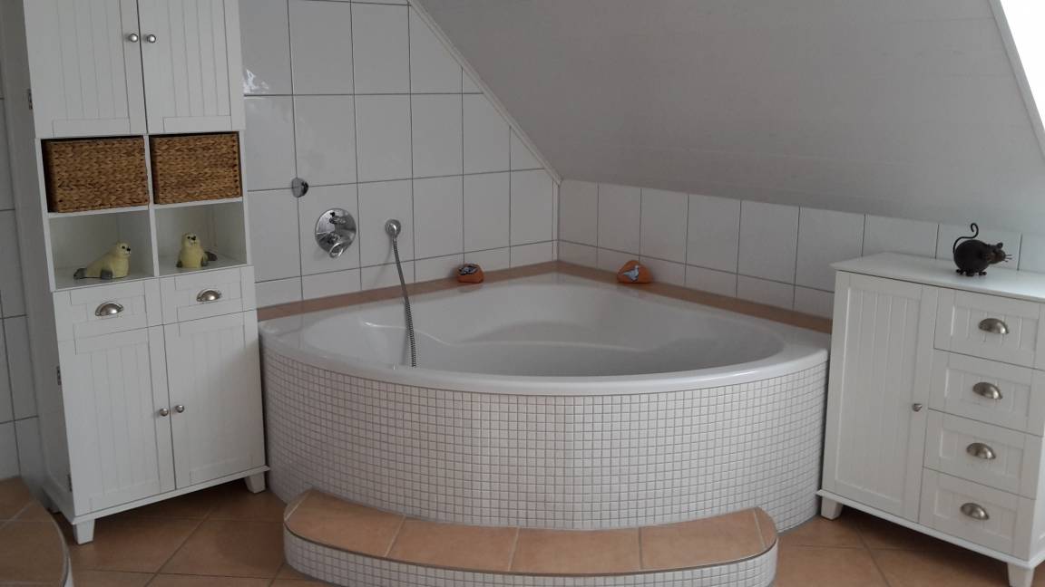 Bad: Eckbadewanne, Eckdusche, Waschbecken und WC.