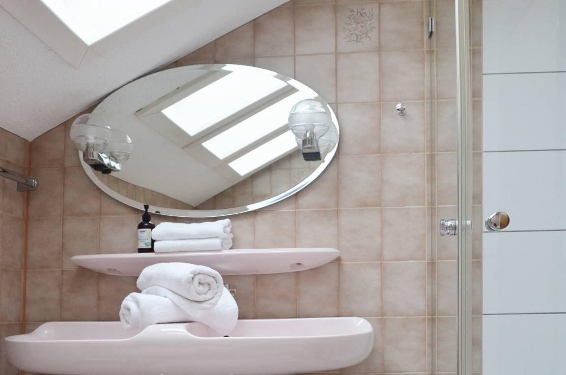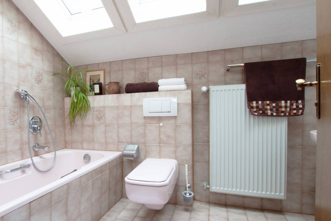 Bad: Das Bad mit Doppelwaschbecken, Badewanne, Dusche und WC ist dank der drei großen Dachflächenfenster herrlich lichtdurchflutet.