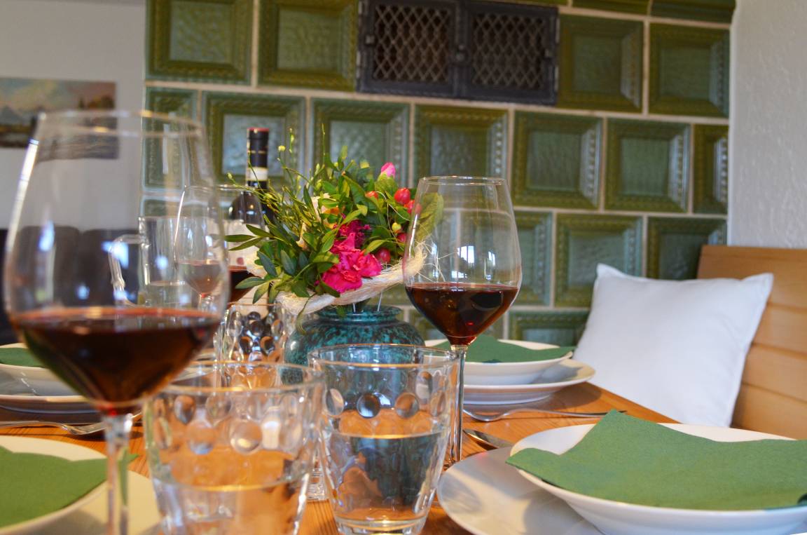 Küche: Die Küche ist mit Ceranfeld, Abzughaube, Elektro-Ofen, Spülmaschine, Kühlschrank, einem Wasserkocher, Kaffeemaschine und Toaster ausgestattet. Am gemütlichen Jogl-Holztisch können Sie die erste Tasse Kaffee oder Tee des Tages mit Blick in den Garten genießen.