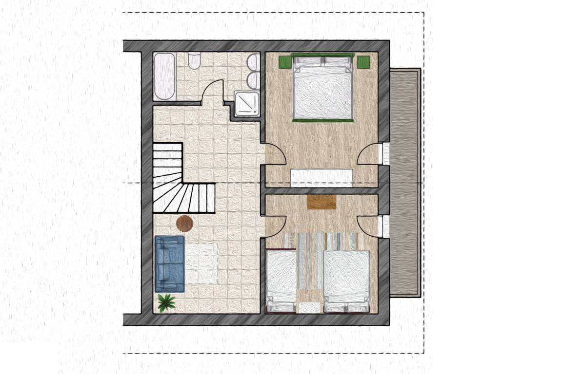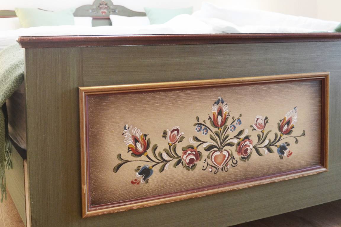 Schlafen: Das erste Schlafzimmer mit seinem liebevoll bemalten Doppelbett (1,85x2,00m) lädt zum Träumen ein. Die passenden Nachttische, der Spiegel und die Stühle machen das Ensemble komplett. Im großen Schrank ist ausreichend Platz. Das zweite Schlafzimmer bietet mit einem Doppelbett (1,45x2,00m) und einem Einzelbett (0,90x2,00m) Platz für 3 Personen. Die Sofas im Wohnzimmer und Obergeschoss können jeweils als weitere Schlafmöglichkeiten (je 1,40x2,00m) für 4 weitere Personen genutzt werden.