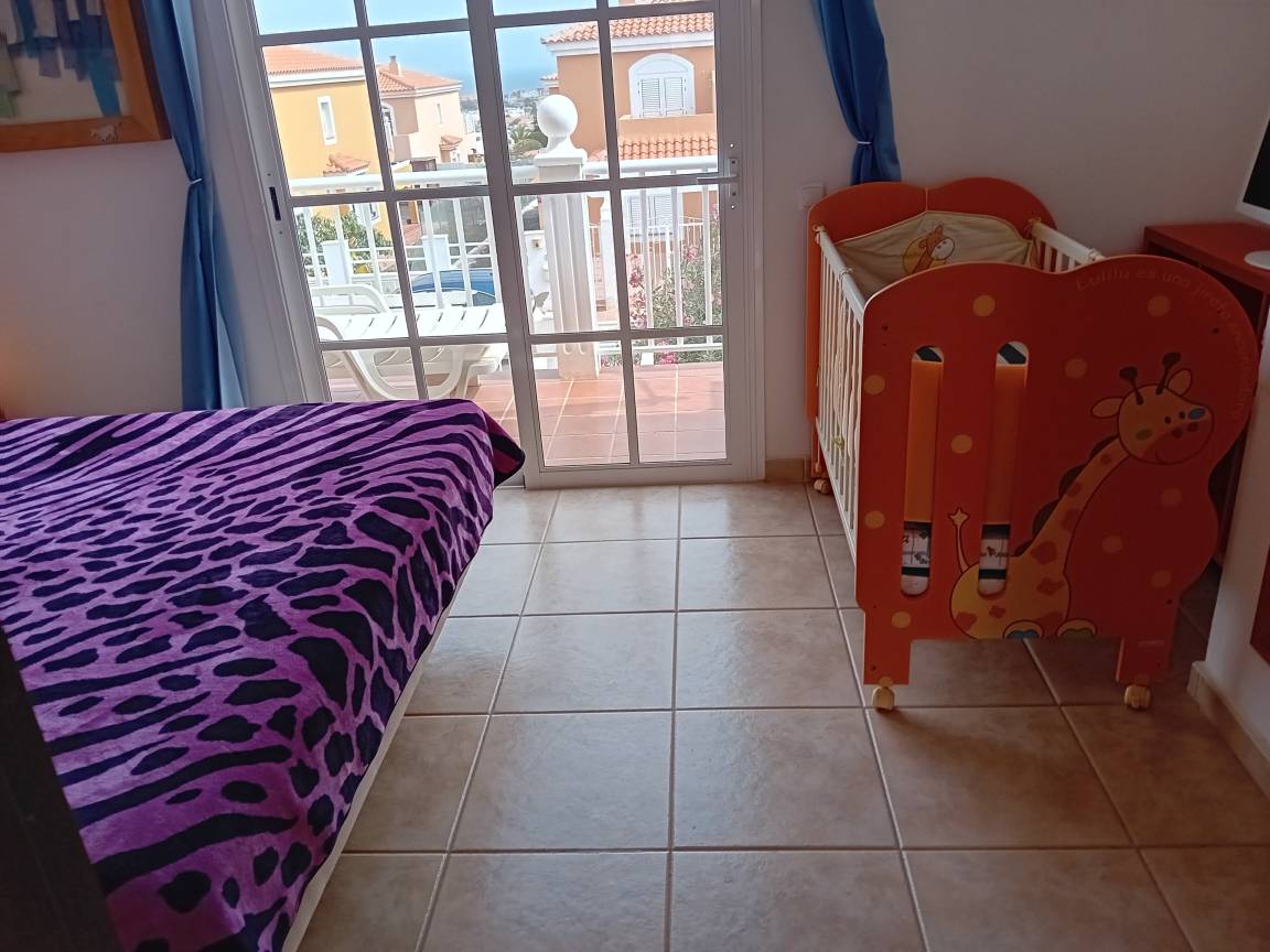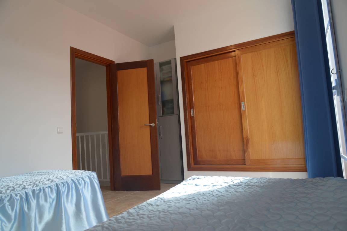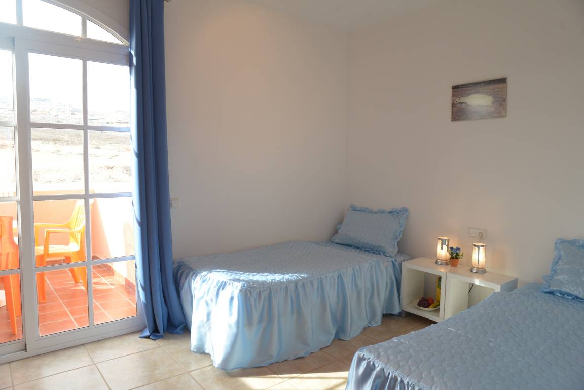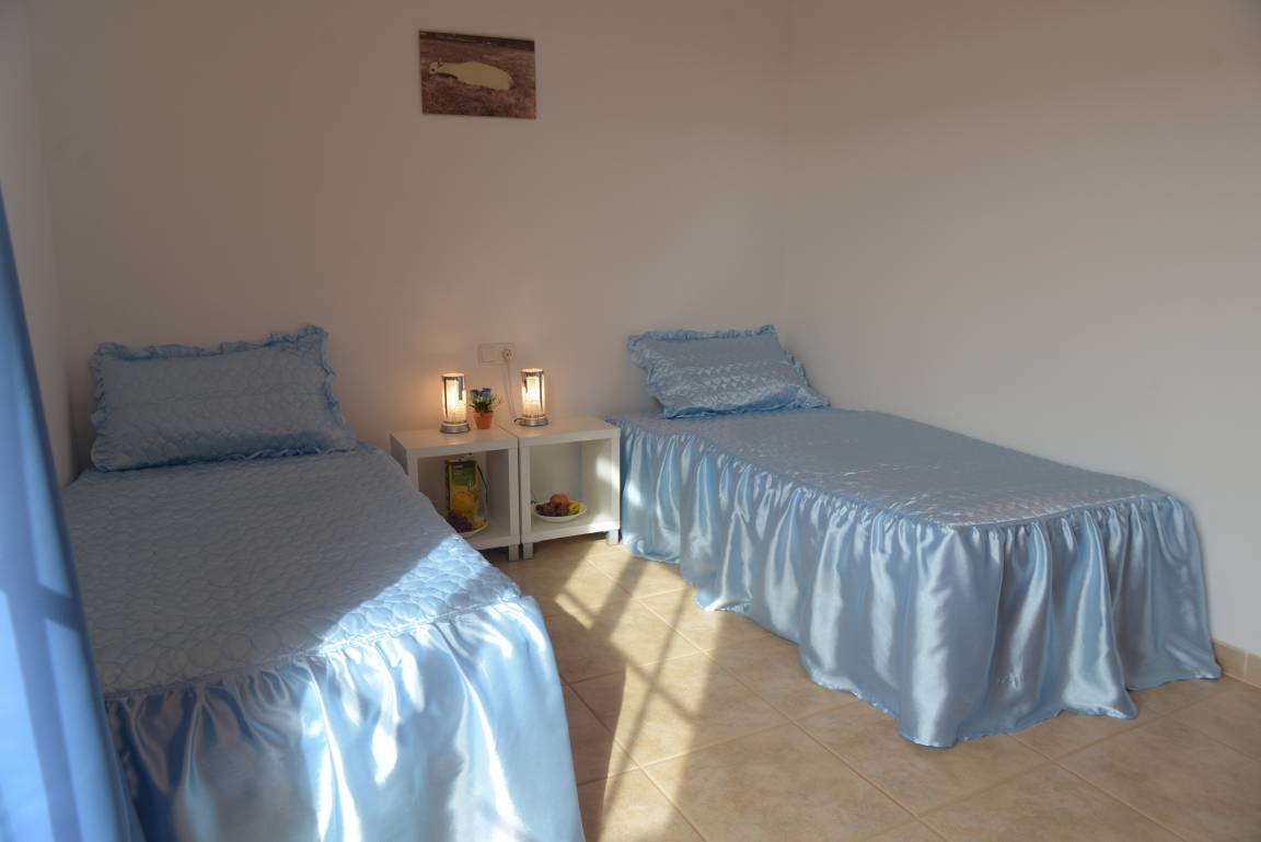 Das Haus bietet in der ersten Etage zwei große Schlafzimmer, jeweils mit Einbaukleiderschränken. In einem Zimmer ist ein Doppelbett, in welchem sich auch ein Babybett befindet, im anderen sind zwei Einzelbetten vorhanden. Das Doppelbettzimmer ist ausgestattet mit zwei Schiebeglastüren zum Balkon, der über einige Häuser der Ferienanlage hinweg Blick auf das Meer bietet. Der Balkon des Einzelbettenzimmers lädt mit Blick auf die vulkanische Landschaft zum Verweilen ein. Das große Bad befindet sich ebenfalls in der ersten Etage, zwischen den beiden Schlafzimmern gelegen. Dieses ist mit Badewanne, Bidet, WC, Waschmaschine, Fön, etc. ausgestattet.