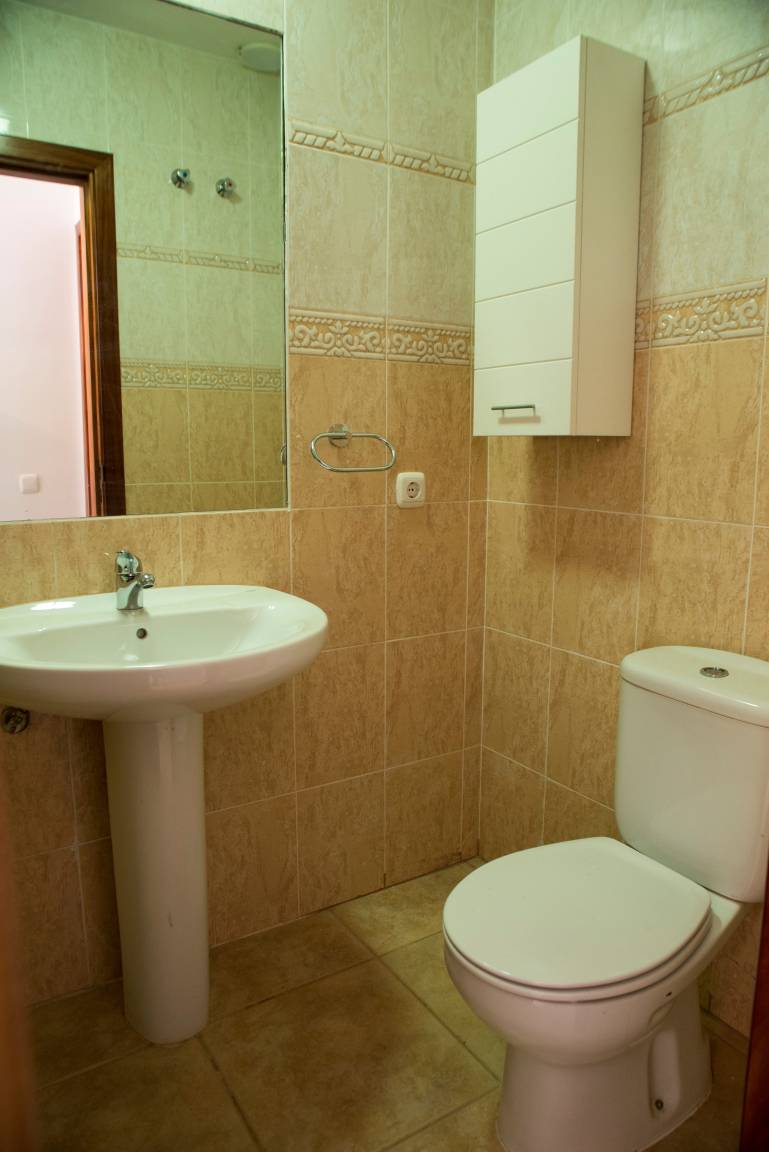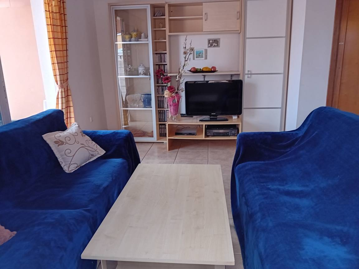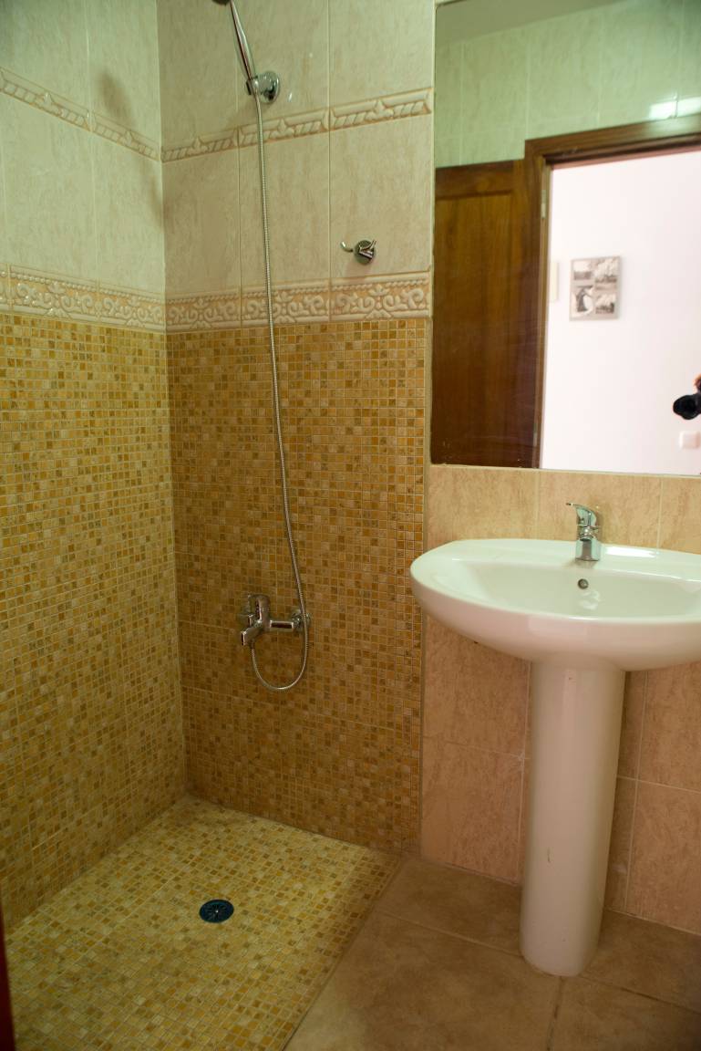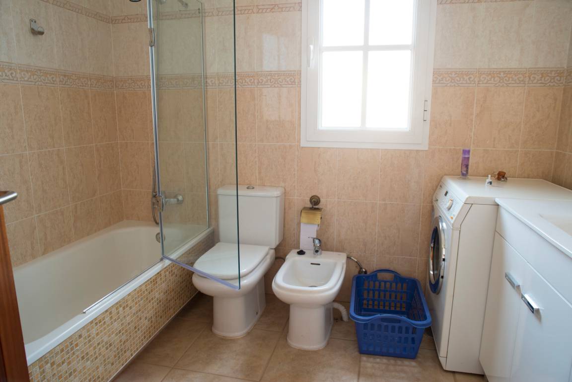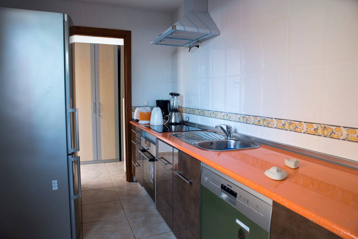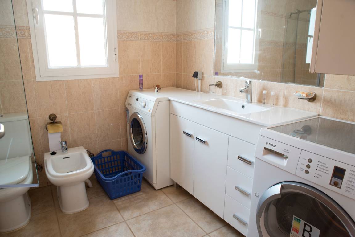Im Erdgeschoss befindet sich die moderne Küche mit Kühl-/Gefrierschrank, 3 Cerankochfelder, Mikrowelle, Toaster und Backofen. Daneben liegt das gemütliche Wohnzimmer mit Zugang zur Terrasse. Hier kann der Gast über Smart-TV eine Reihe von deutschen, englischen, spanischen, französischen und italienischen Fernsehprogrammen empfangen. Zudem hat er die Möglichkeit, den WLAN-Internet-Anschluss mit sehr guter Geschwindigkeit zu nutzen. Weiterhin gibt es im Erdgeschoss ein kleines Bad mit bodengleicher mosaikgefliester Dusche, Waschbecken und WC.