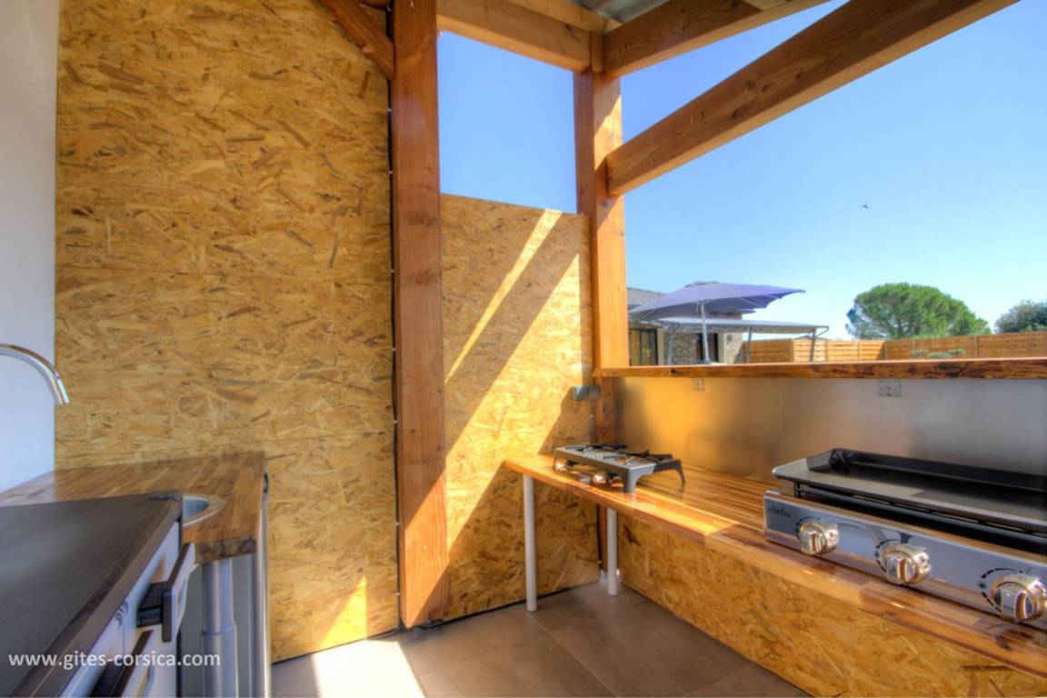 - Sommerküche mit Gasplancha, 2 Gaskochstellen, Spüle und Kühlschrank.