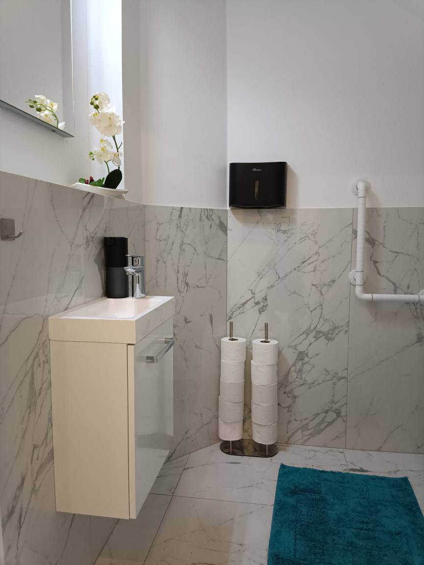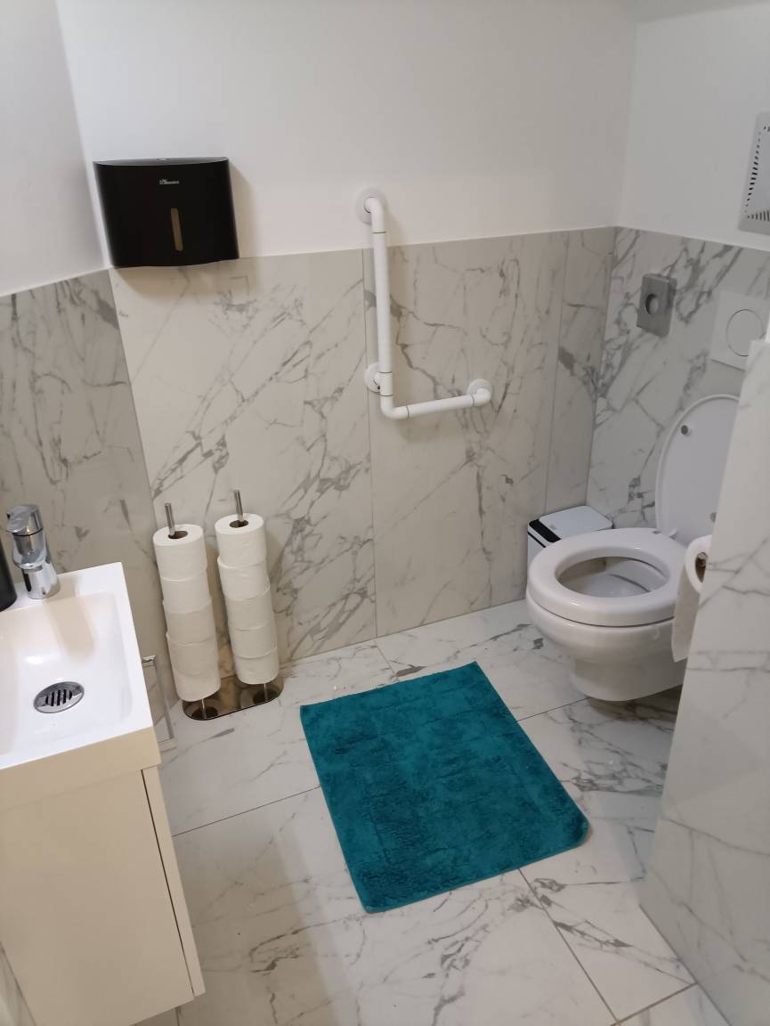 Alle Wohnräume sind mit einem Rollstuhl befahrbar und Bad und WC verfügen über Haltegriffe, zusätzlich ist in der Dusche ein Duschsessel.