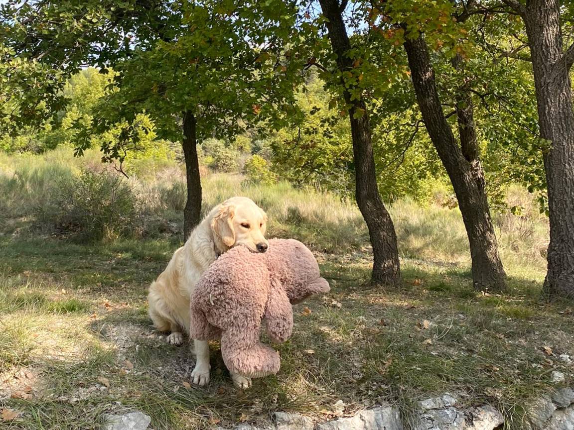 Hausbeschreibung : Schönes Natursteinhaus auf einem schieferreichen Gelände in der schönen Umgebung des Luberon. Das Haus liegt ca. 100 m von einer Chambre d'hôte mit großem Gemeinschaftspool (9x4m) und parkähnlichem Garten entfernt. Das Haus ist geschmackvoll und tadellos eingerichtet. Perfekter Ausgangspunkt für Ausflüge in die Region oder einfach nur zum Faulenzen und Lesen auf Ihrer Liege an einem der schönen Plätze im Garten, wo auch der freundliche Hund (Bild) des Eigentümers gelegentlich vorbeikommt!