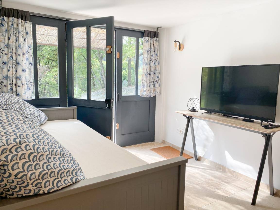 Terrasse(alleinige Nutzung), Garten(Gemeinschaftliche Nutzung mit dem Eigentümer und anderen Gästen , nicht umzäunt, 9000 m²), Gartenmöbel, 2x Liegen, 2x Parkplatz(auf dem Gelände), Pool(Gemeinschaftliche Nutzung mit anderen Gästen, im Garten, 9 x 4 m., Tiefe: 1.4m, geöffnet von Mitte Mai bis einschließlich Mitte Sep)