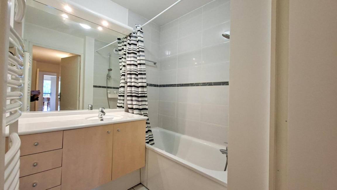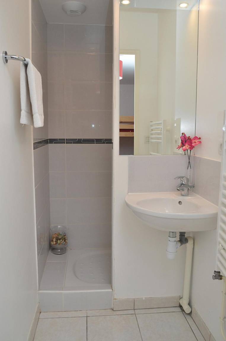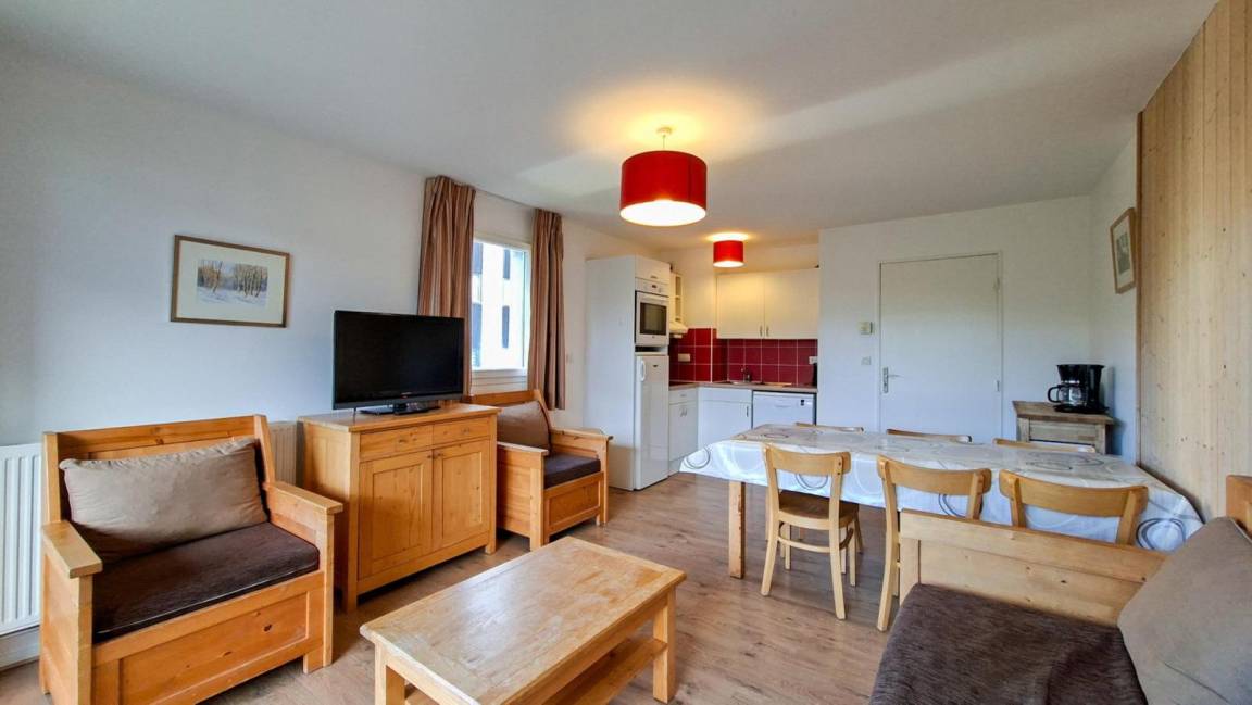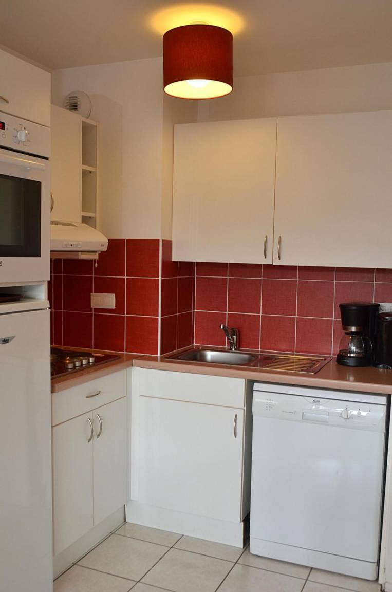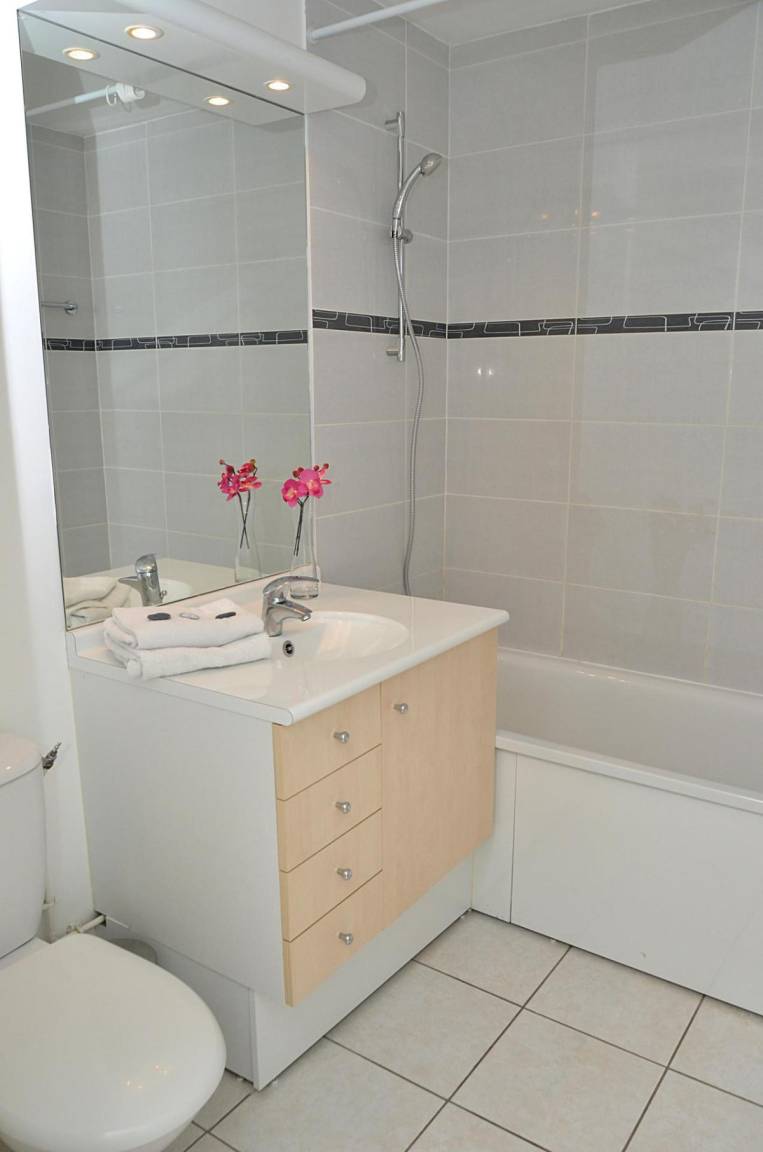 Fläche von ungefähr 60 m². 2te Etage. Orientierung : Süd. Wohnzimmer mit 2 Ausziehbetten. offener Schlafbereich mit 2 Stockbetten. Schlafzimmer mit Doppelbett. Schlafzimmer mit 2 Einzelbetten. Kochnische mit Multifunktions-Backofen, Geschirrspülmaschine, Mikrowellenherd, Glaskeramikkochfelder, Kühlschrank. Waschräume. Badezimmer. 2 separate WCs. Balkon. Die oberen Betten sind nicht für Kinder unter 6 Jahren geeignet.