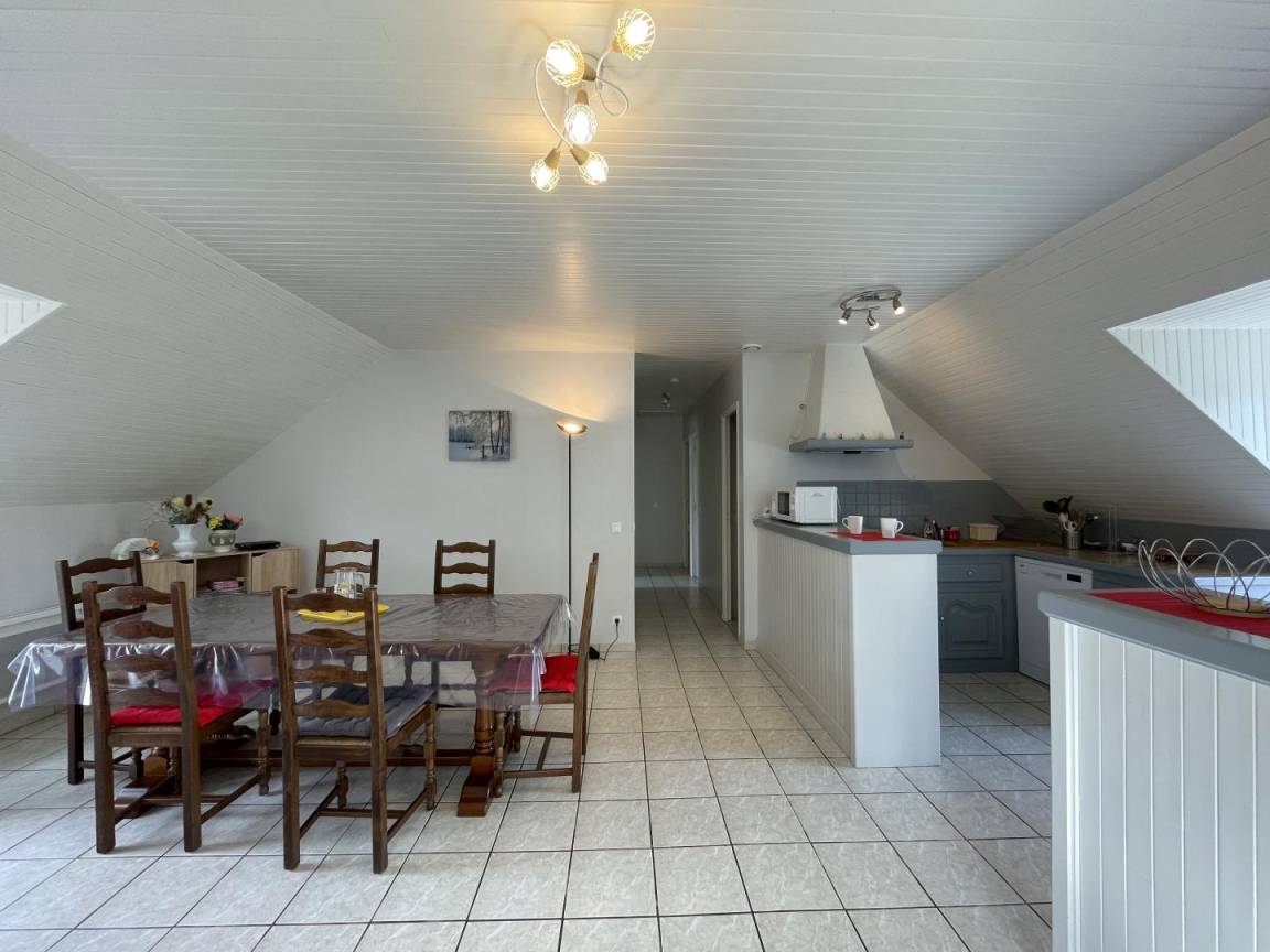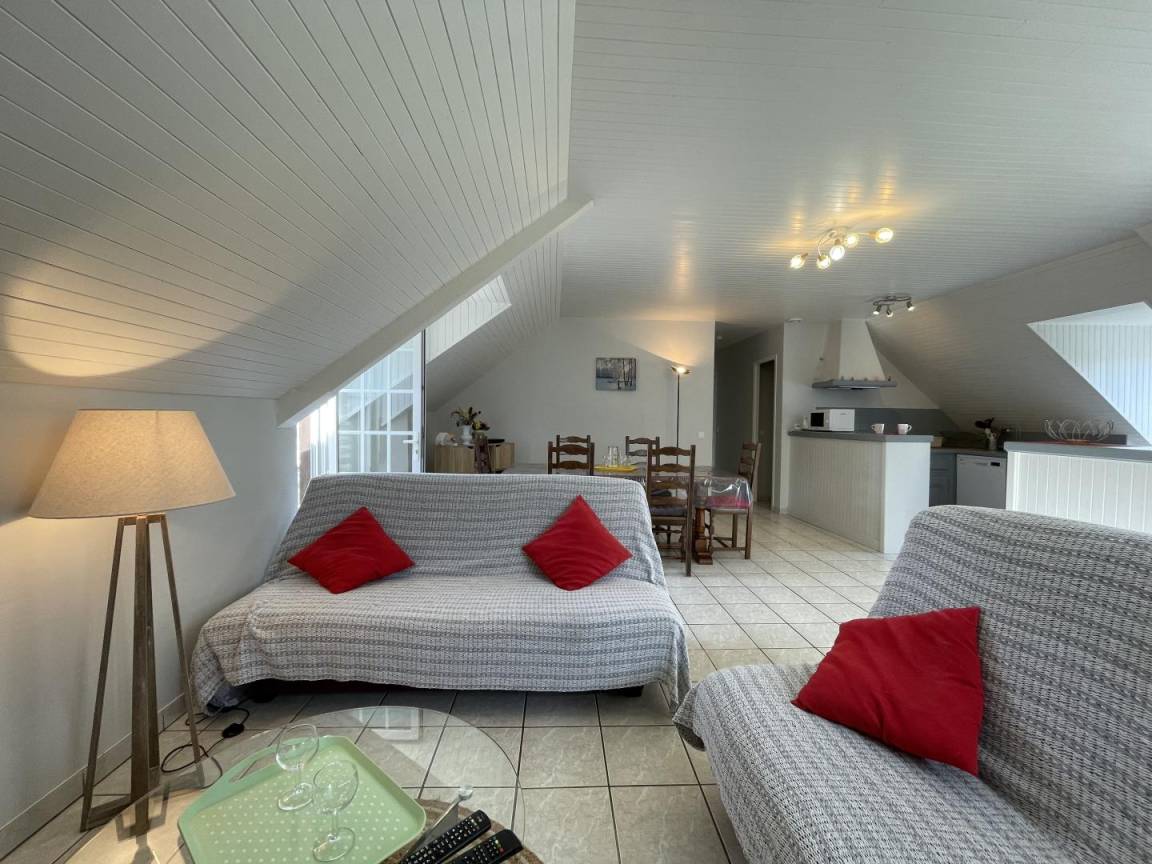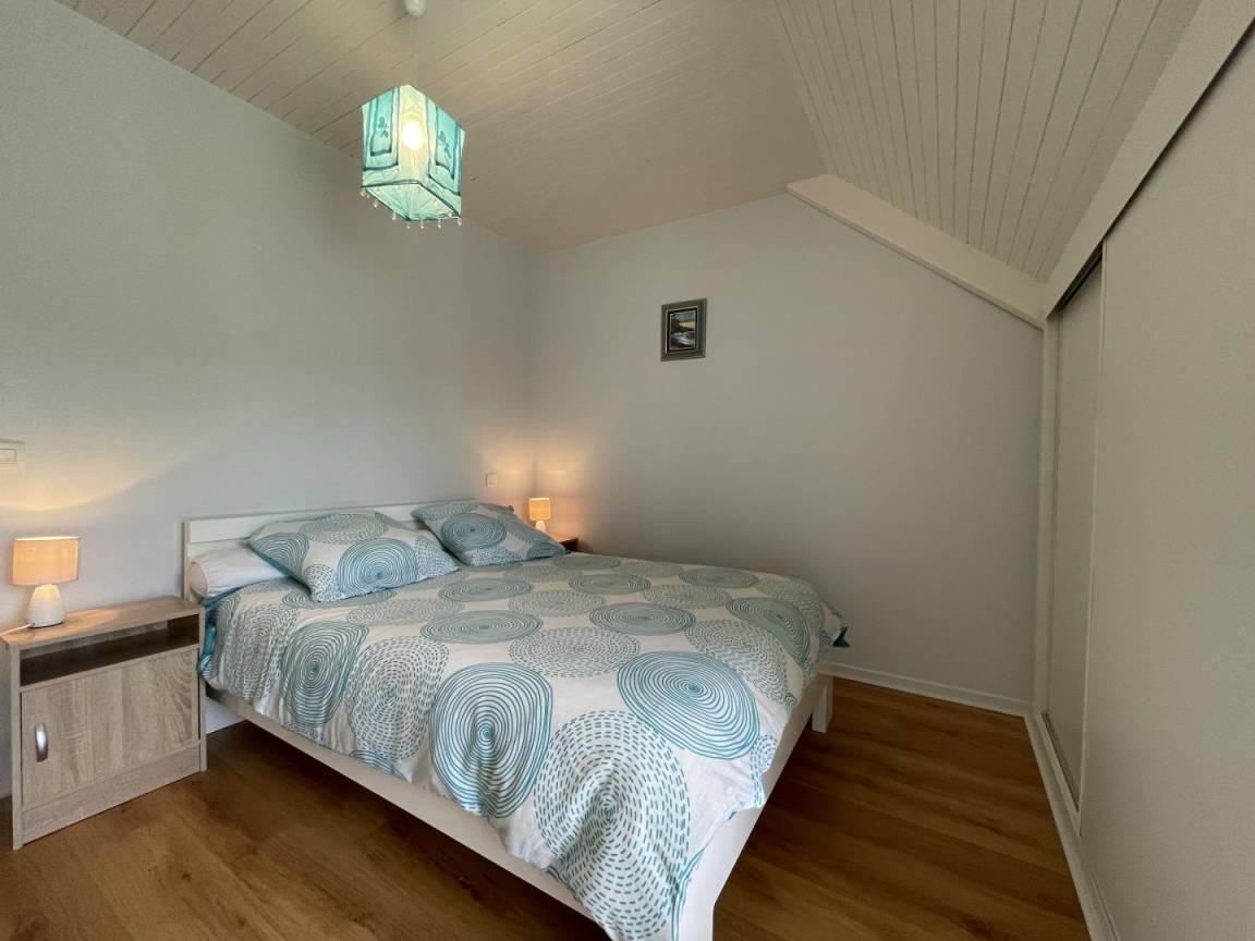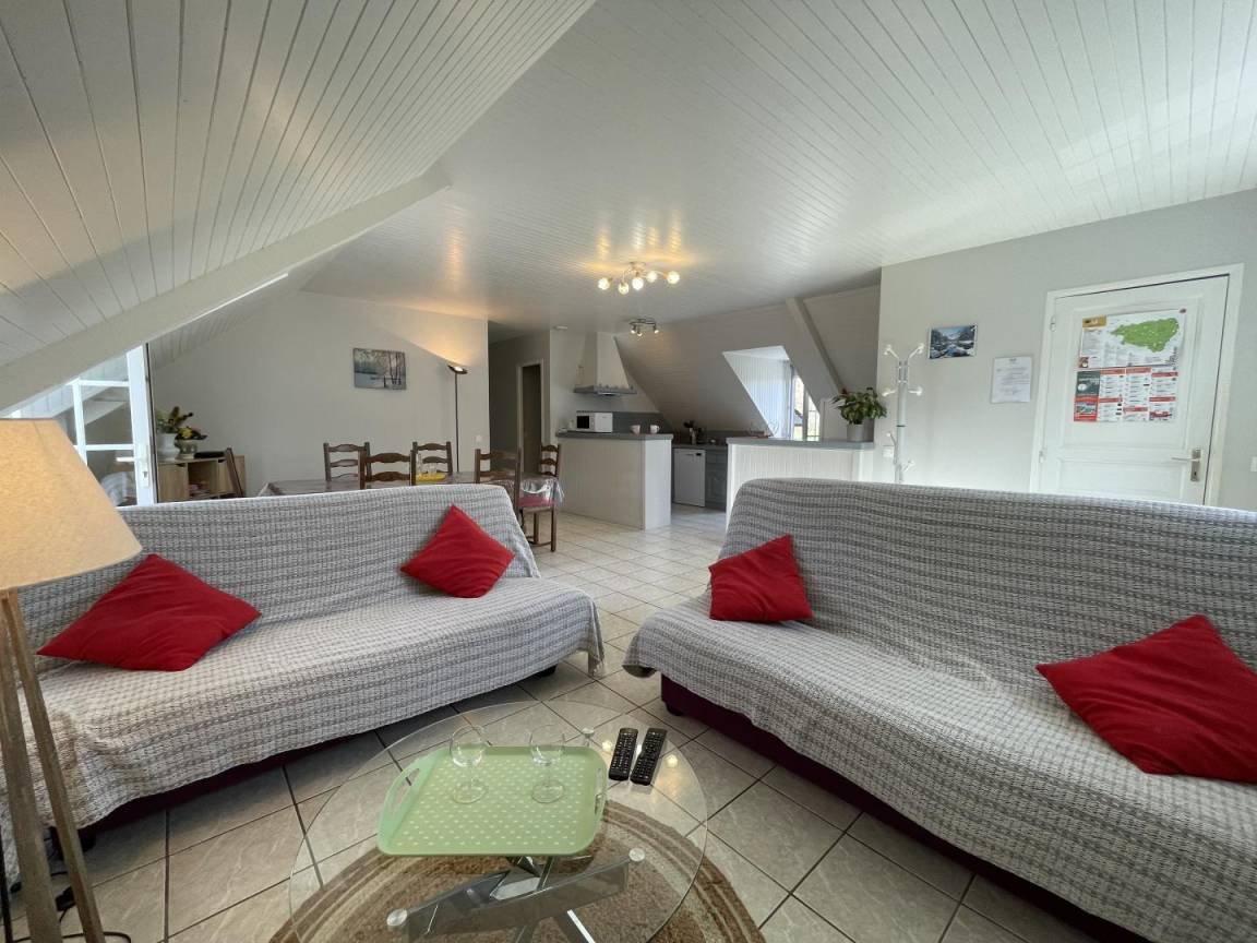 Dachgeschoss: Wohnzimmer, Sitzecke (TV), Küchenbereich (Mikrowelle, Backofen, Geschirrspüler, Kühlschrank mit Gefrierfach), 3 Schlafzimmer (2 Doppelbetten, 2 Einzelbetten), Badezimmer, WC. Möglichkeit, Bettwäsche zu mieten.