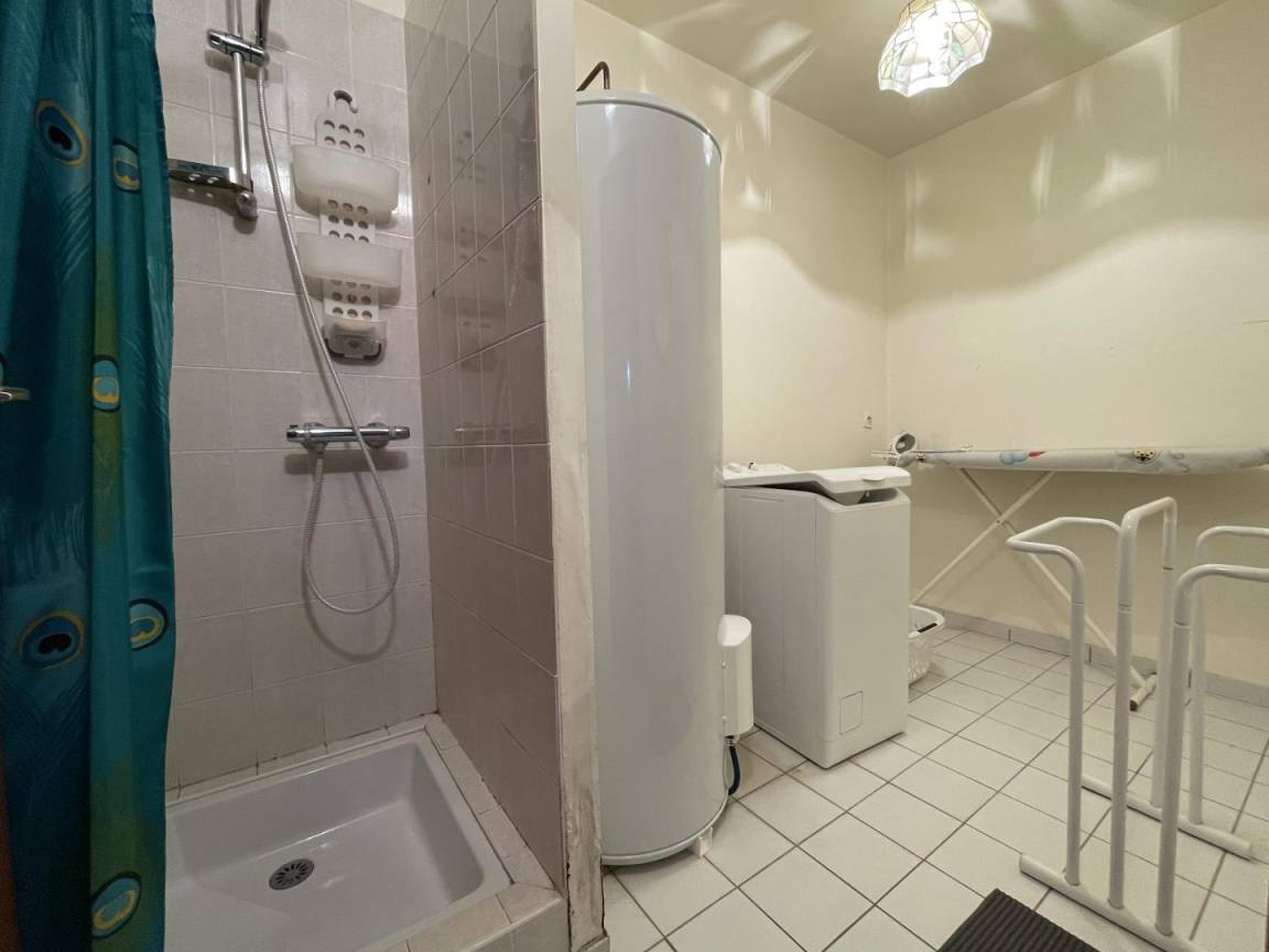 Erdgeschoss: Große Garage (Tischtennis, Fahrräder) mit Einbautoiletten/Waschküche (Dusche, WC, Waschmaschine).