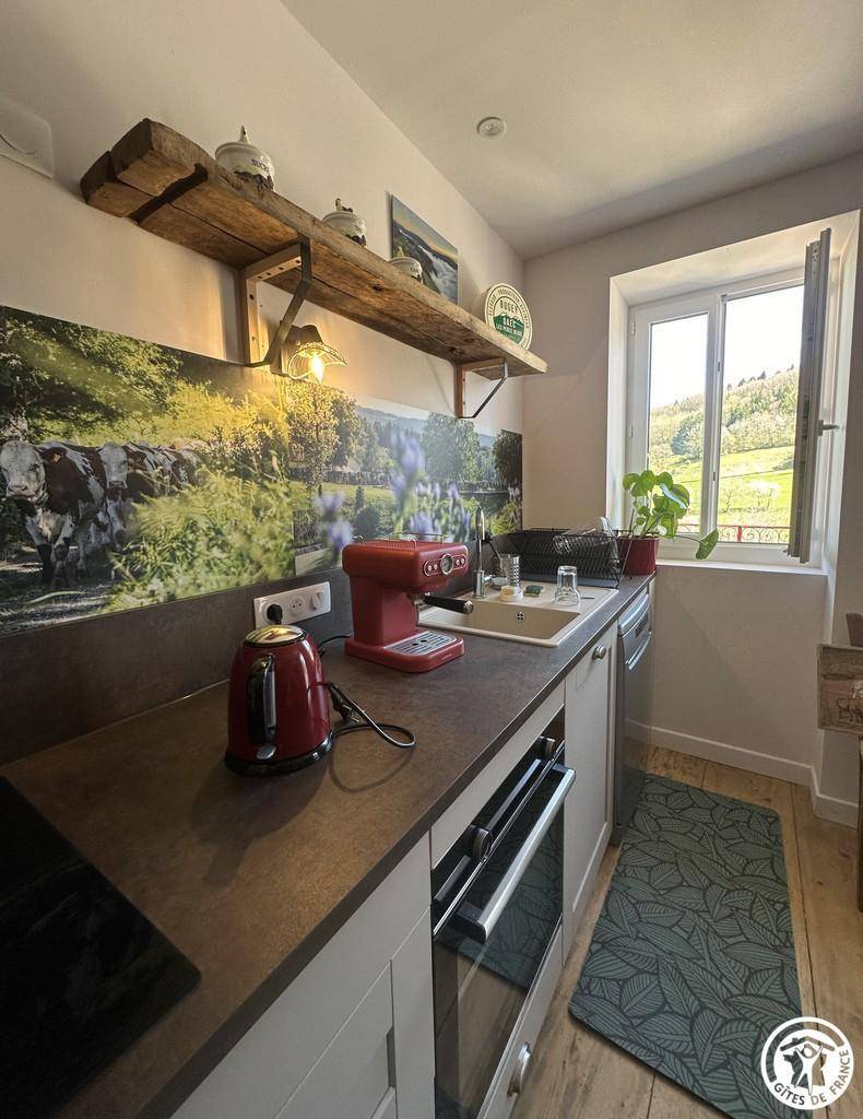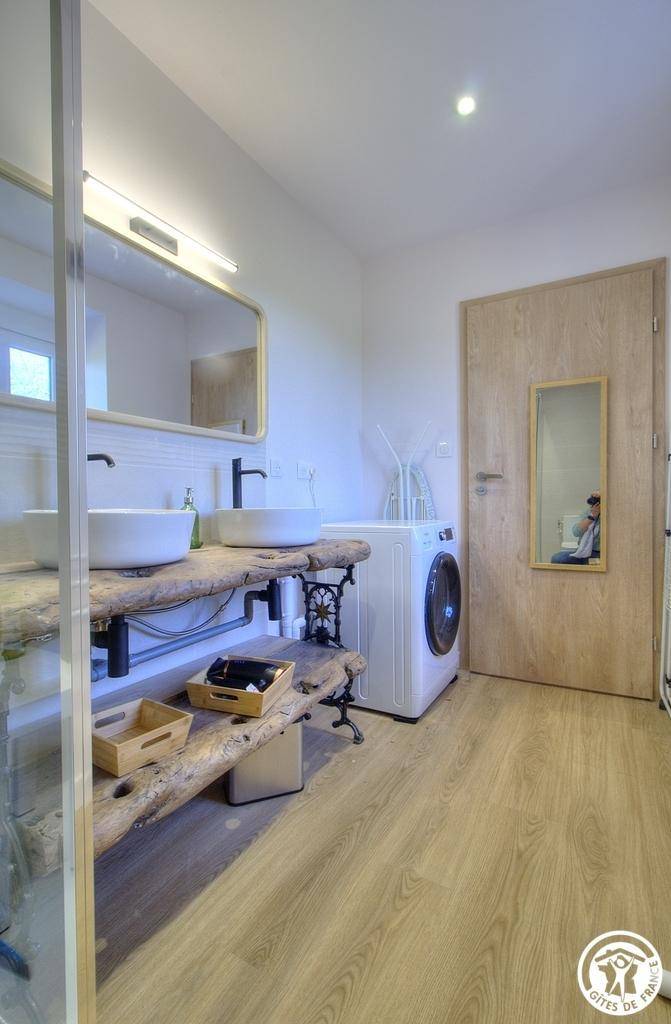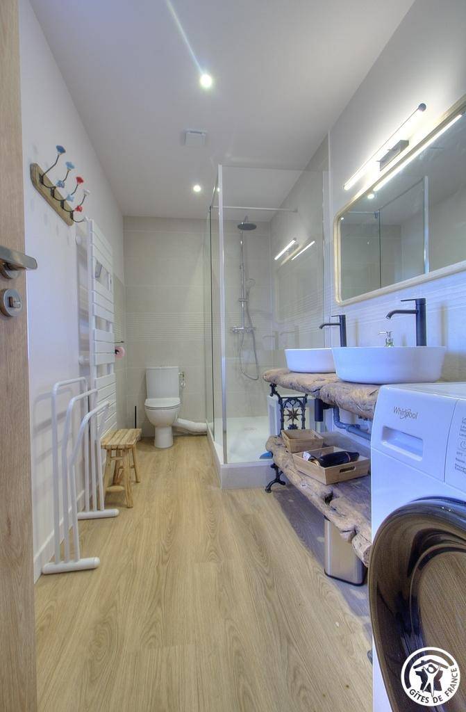 Der Eingang befindet sich auf der Terrassentreppe. Willkommen in Amédée! Die voll ausgestattete Küche, die sich zum Wohn- und Essbereich hin öffnet, schafft einen hellen und einladenden Wohnraum. Das Ambiente vereint Schlichtheit, Komfort und Authentizität mit einer funktionalen Raumaufteilung, die für jeden Aufenthalt geeignet ist. Ein Duschbad rundet diese erste Ebene ab.