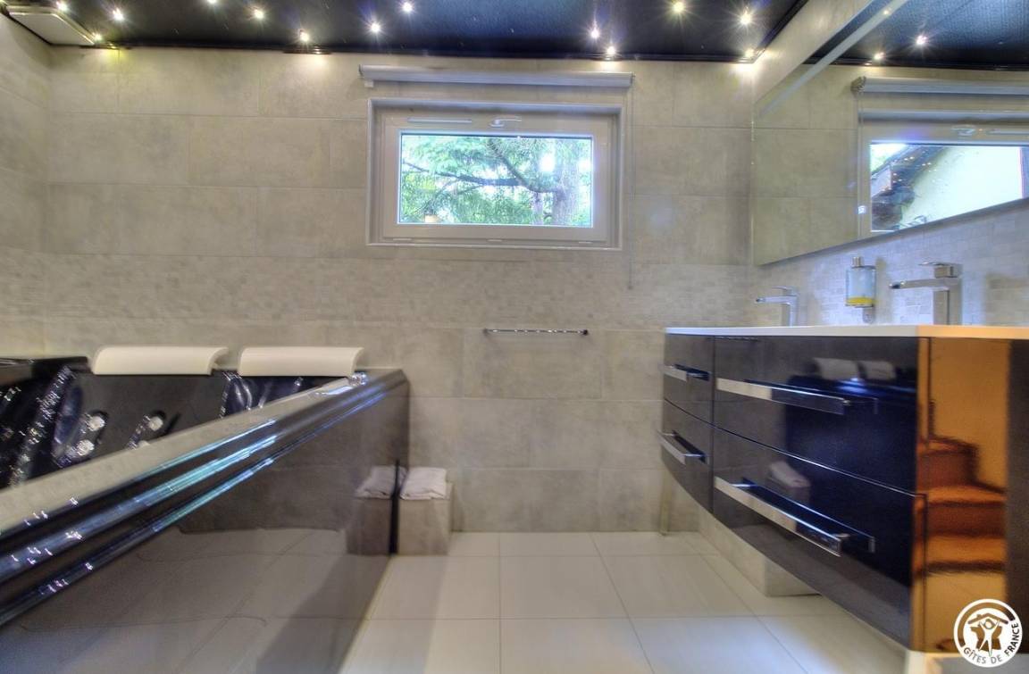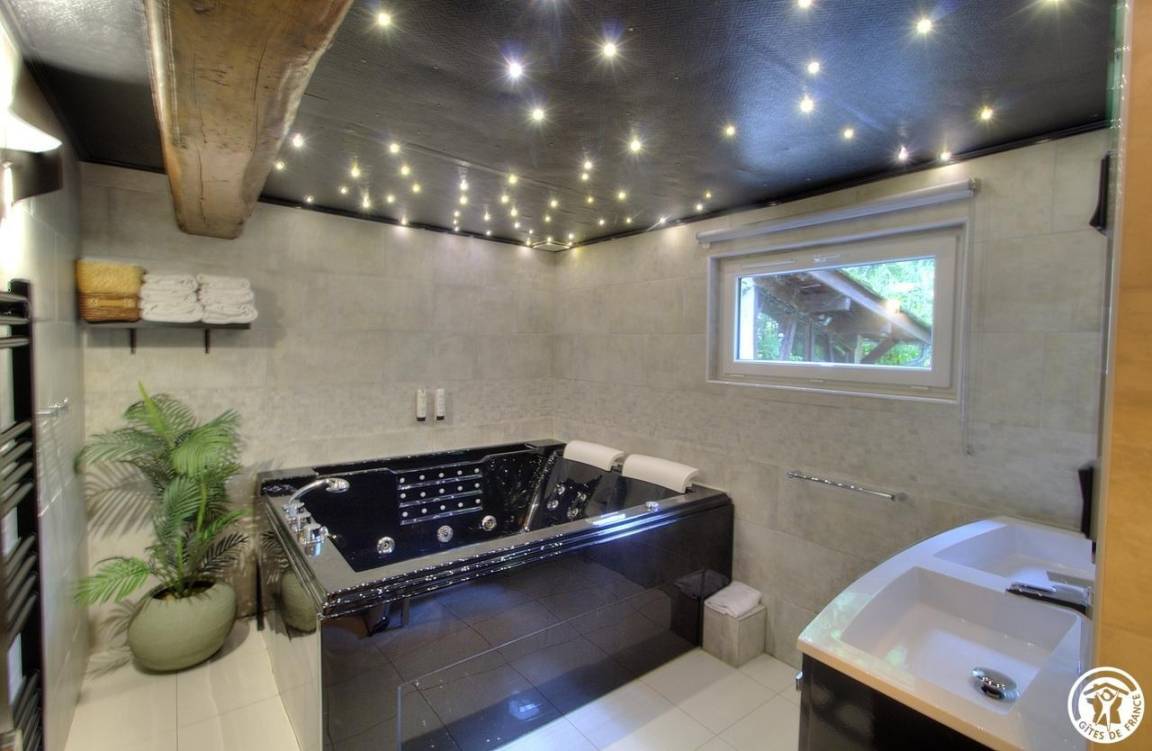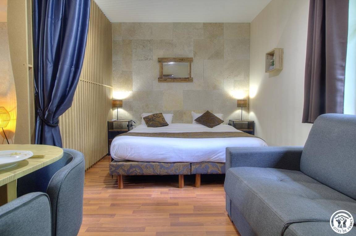 Ihre Unterkunft: großes Studio mit Wohnküche, zwei Einzelbetten im Schlafbereich und einem Schlafsofa. Vier Stufen führen hinunter zum Badezimmer mit Whirlpool, Lichttherapie und Musik sowie einem Sternenhimmel für wahre Wohlfühlmomente. Separates WC.