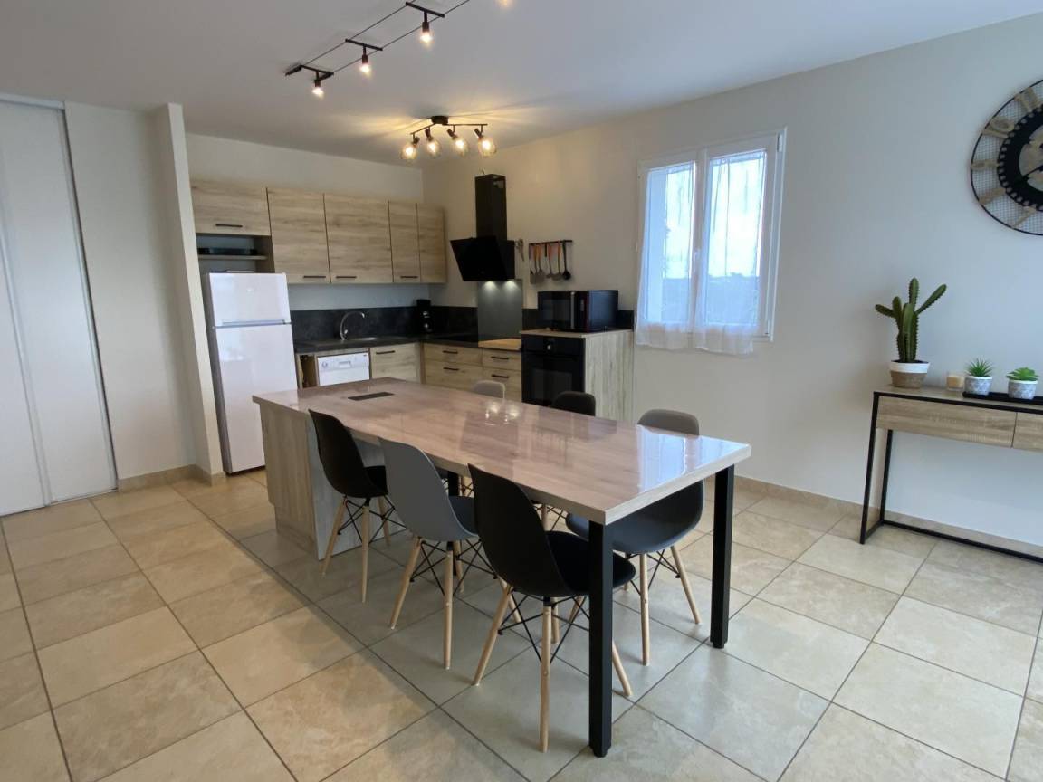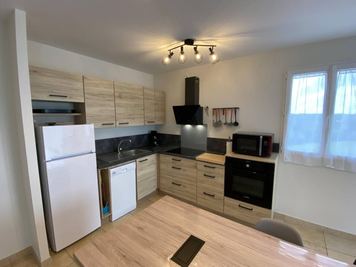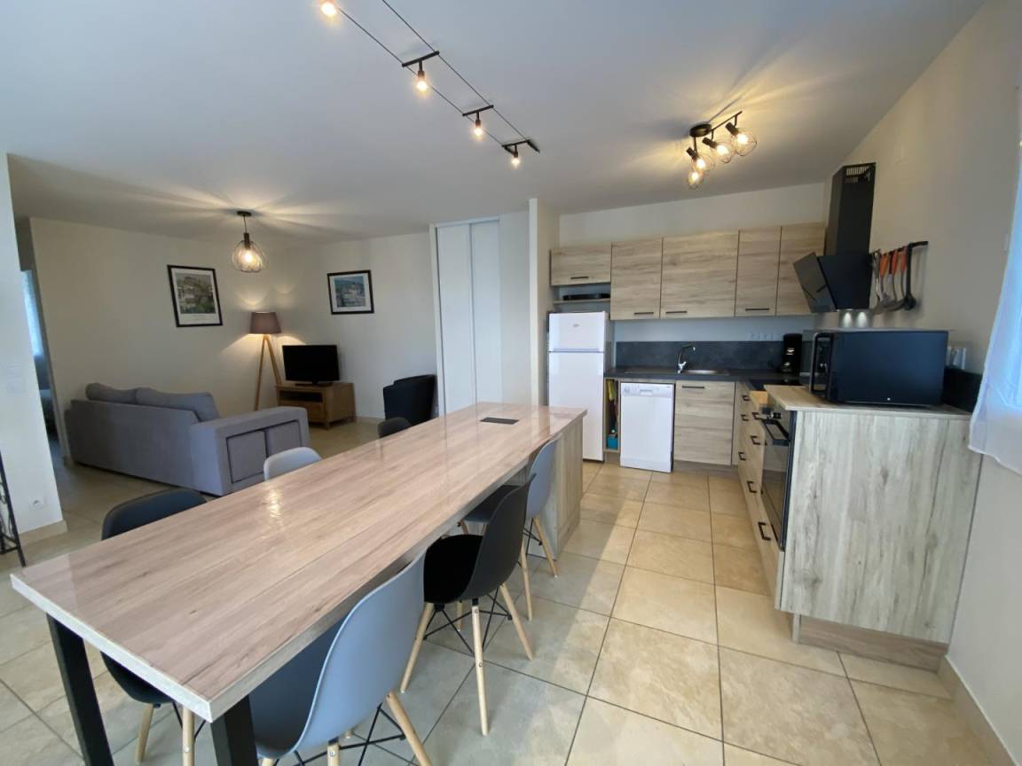Ausgestatteter Küchenbereich (Kühlschrank mit Gefrierfach, Mikrowelle, Cerankochfeld, Senseo-Kaffeemaschine), großes Wohnzimmer, Wohnzimmer (Schlafsofa), 2 Schlafzimmer (2 Doppelbetten), Duschbad. TOILETTE.
