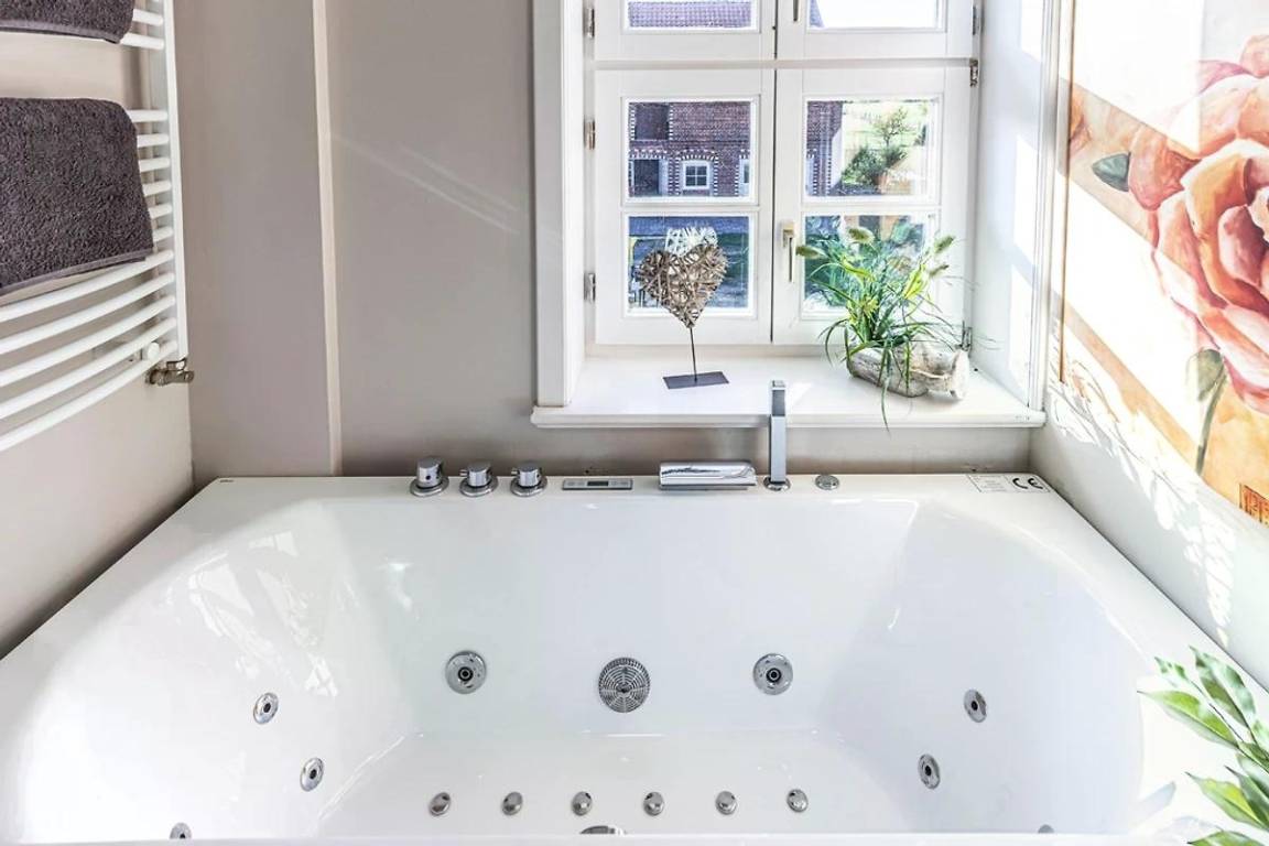 Im Badezimmer ist eine große Dusche, ein Waschtisch, eine Waschmaschine und eine luxus Whirlpool Badewanne mit Whirl- Air- und Farblichttherapie in der man so richtig entspannen kann.