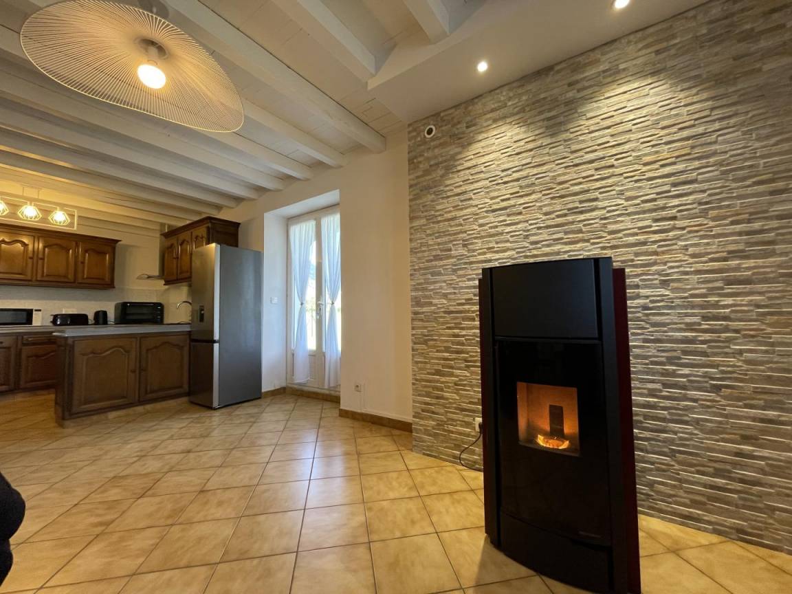 Erdgeschoss: Ausgestatteter Küchenbereich (Mikrowelle, kleiner Elektroherd, Cerankochfeld), Wohnzimmer, Sitzecke (Pelletofen, TV).
