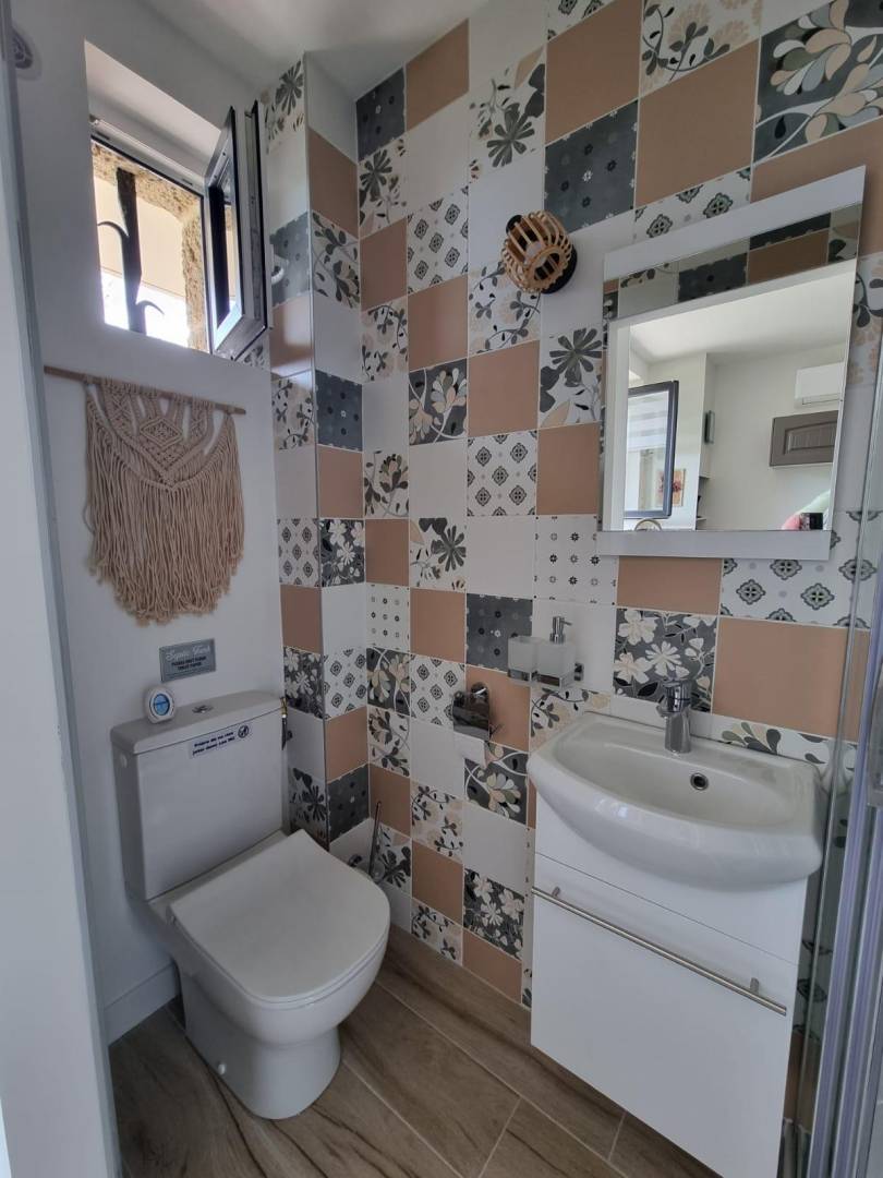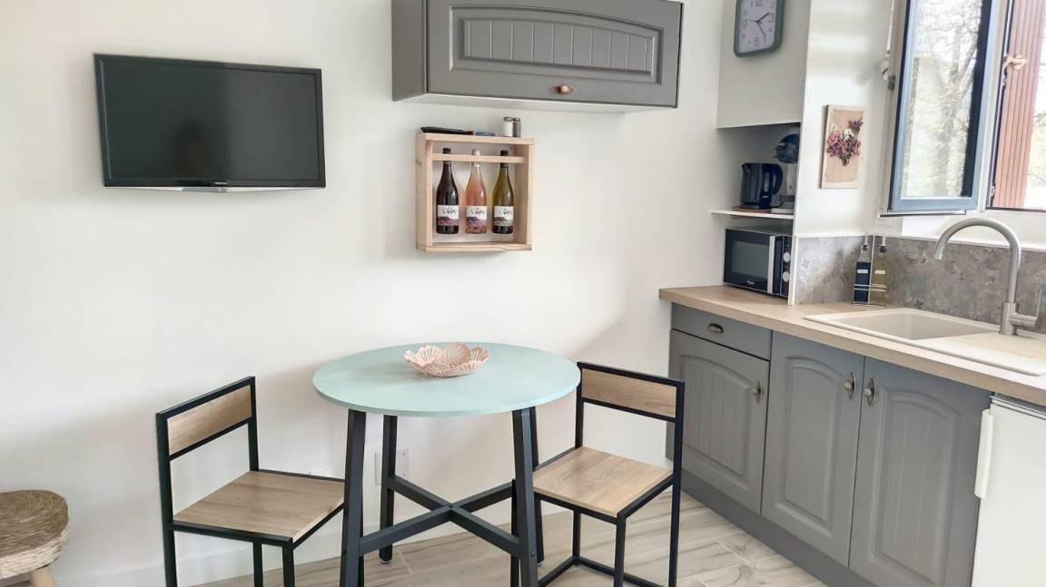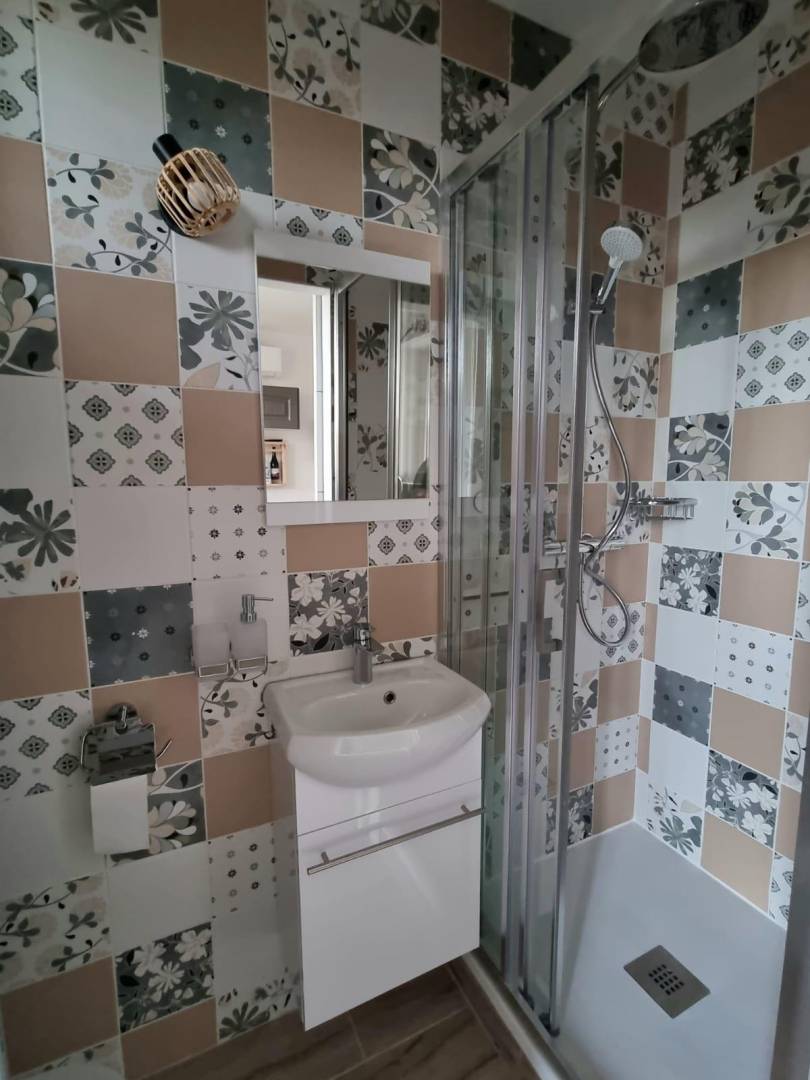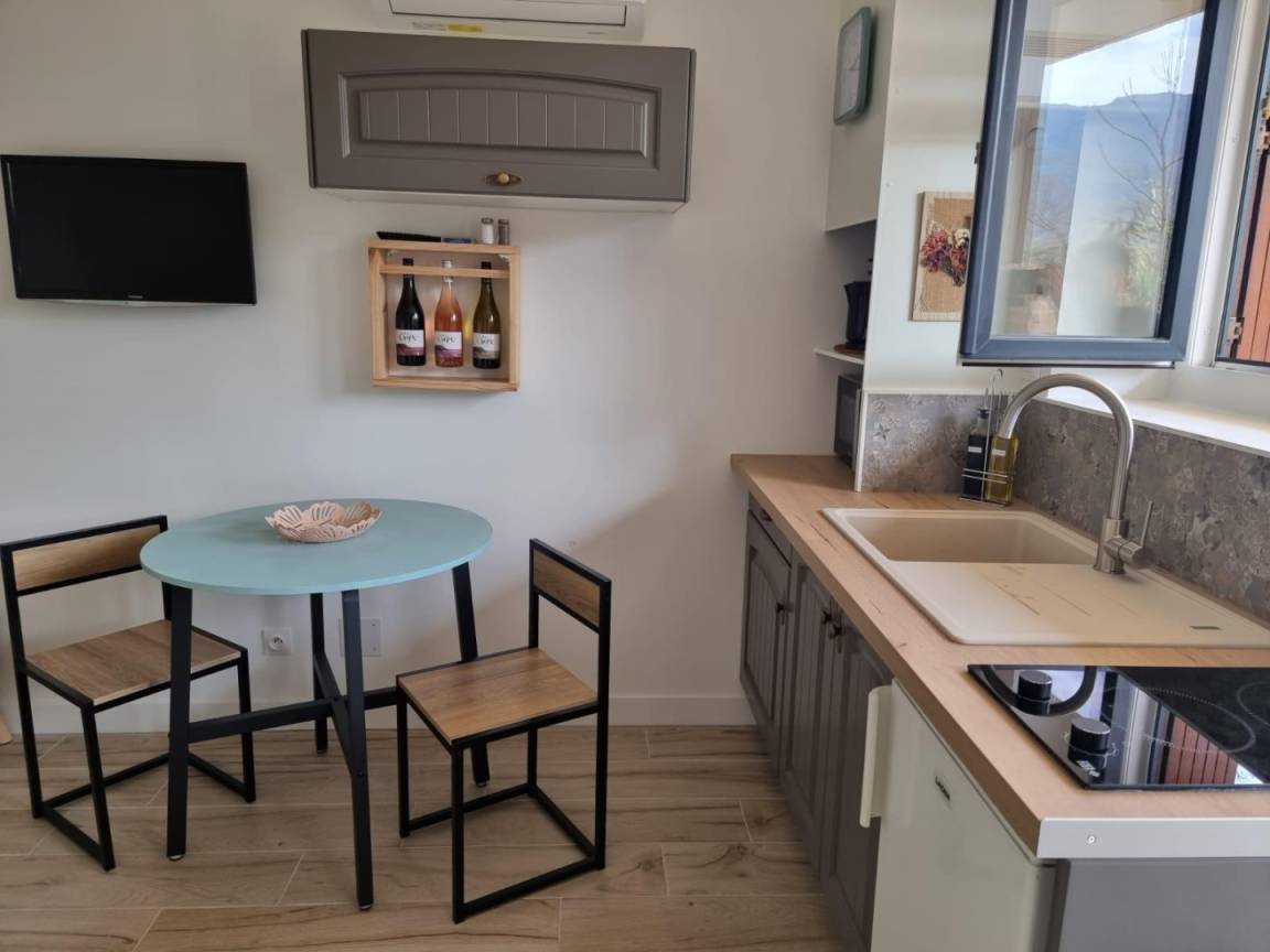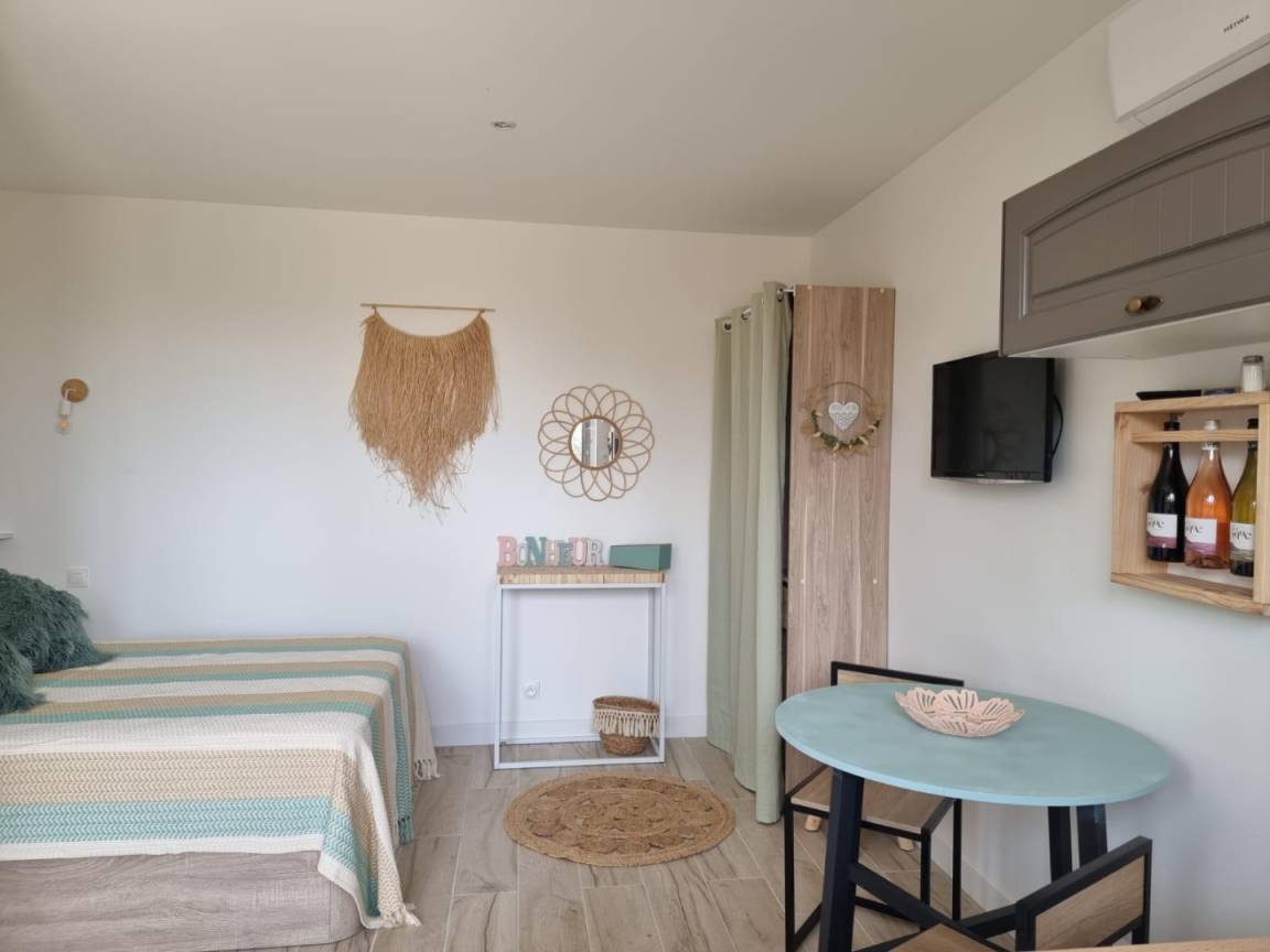 Im Erdgeschoss: Dieses charmante Studio-Apartment bietet eine Küche mit Wohnbereich (ein Doppelbett), ein Duschbad (WC) und Zugang zu einer 18 m² großen Terrasse mit Blick auf das Anwesen.