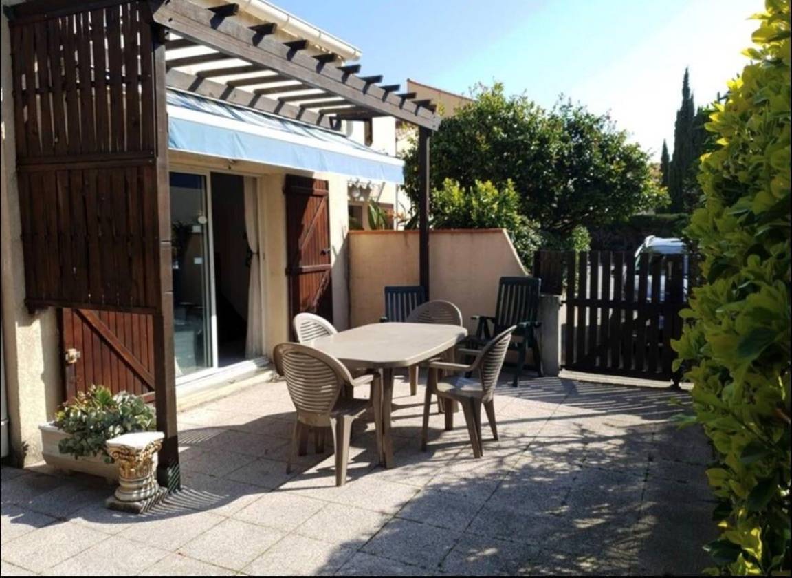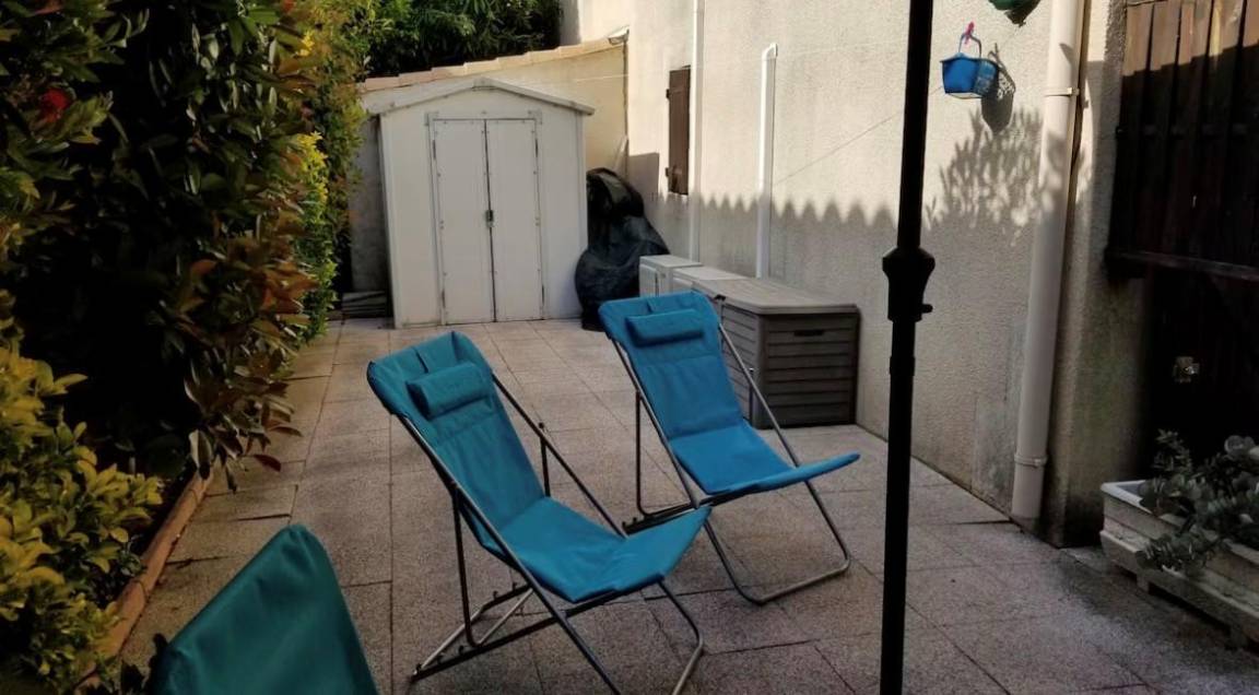 Der private Garten ist mit Gartenmöbeln ausgestattet.