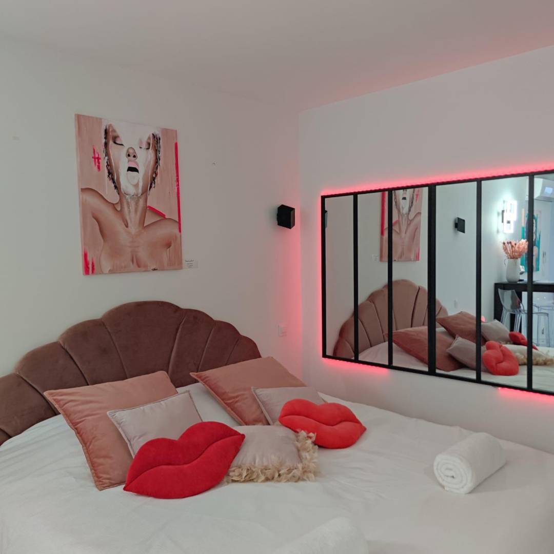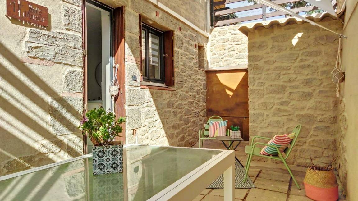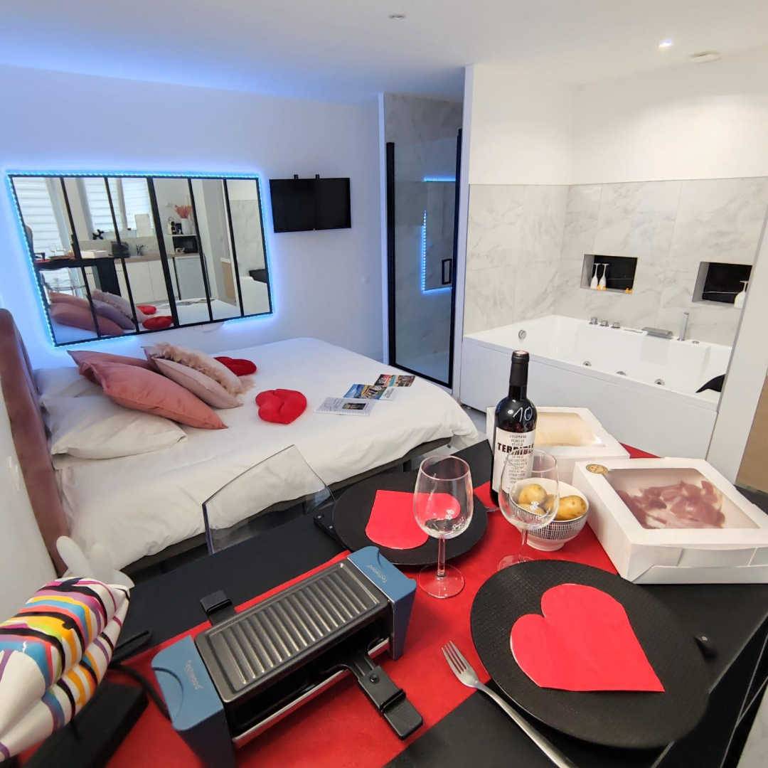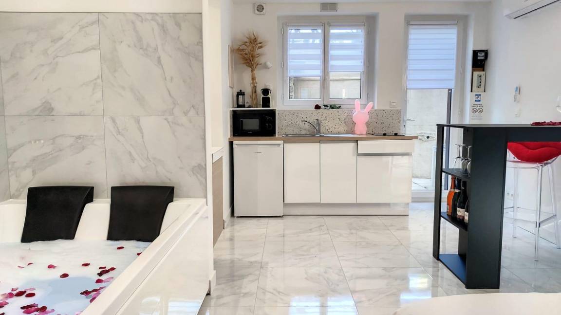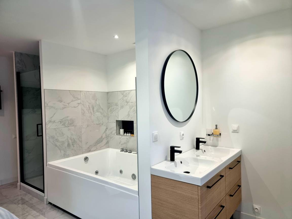 Im Erdgeschoss: Dieses charmante Studio-Apartment bietet eine Küche mit Wohnbereich (mit einem Kingsize-Bett), eine Whirlpool-Badewanne und ein Badezimmer (mit WC). Es öffnet sich zu einer privaten, 27 m² großen Terrasse mit Whirlpool.