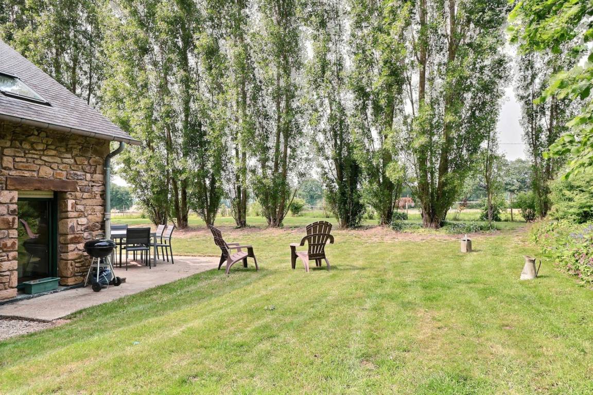 Die einstöckige Gîte verfügt auf der Südostseite über einen Garten mit Rasen und privater Terrasse (Gartenmöbel, Grill).