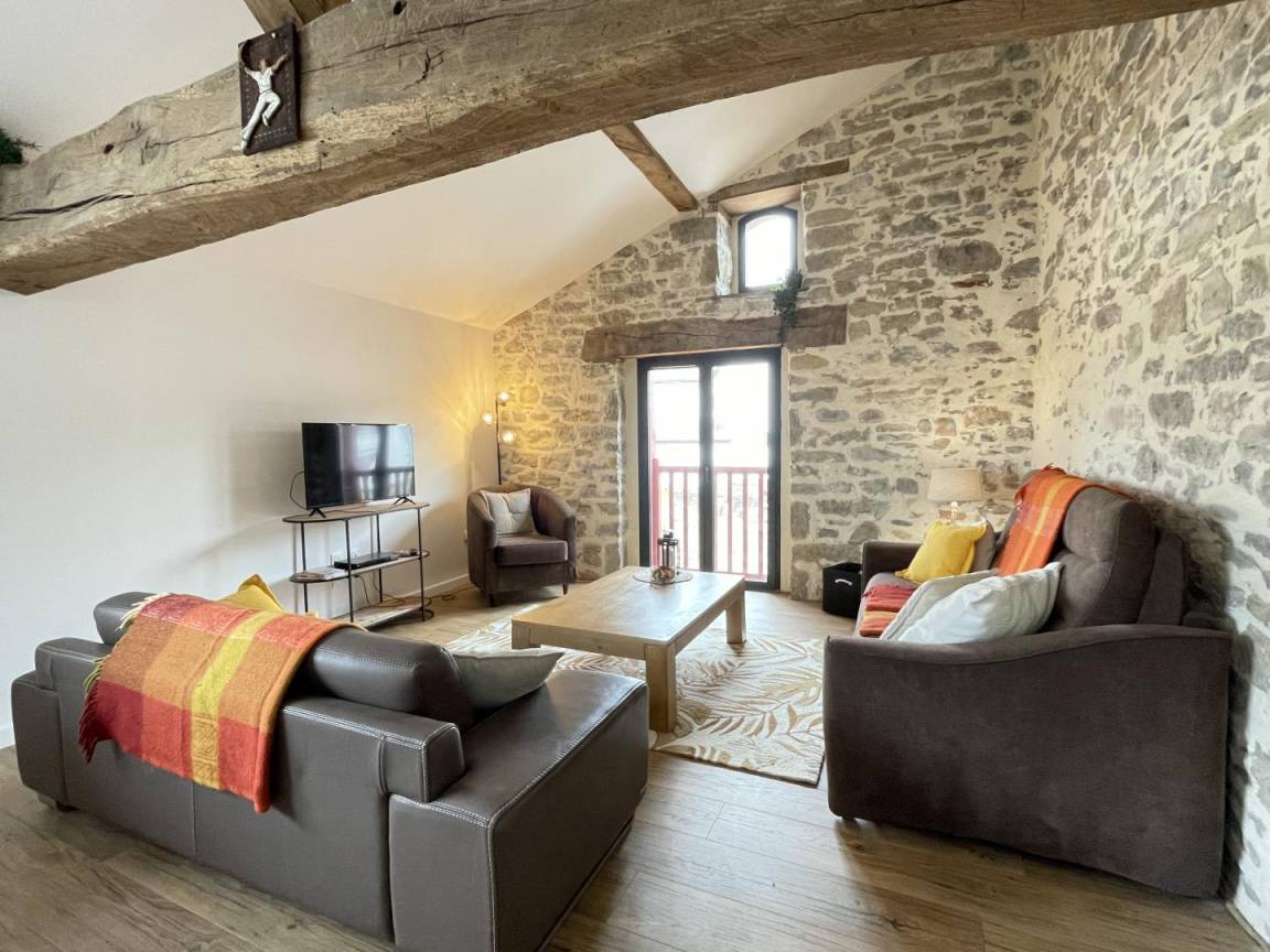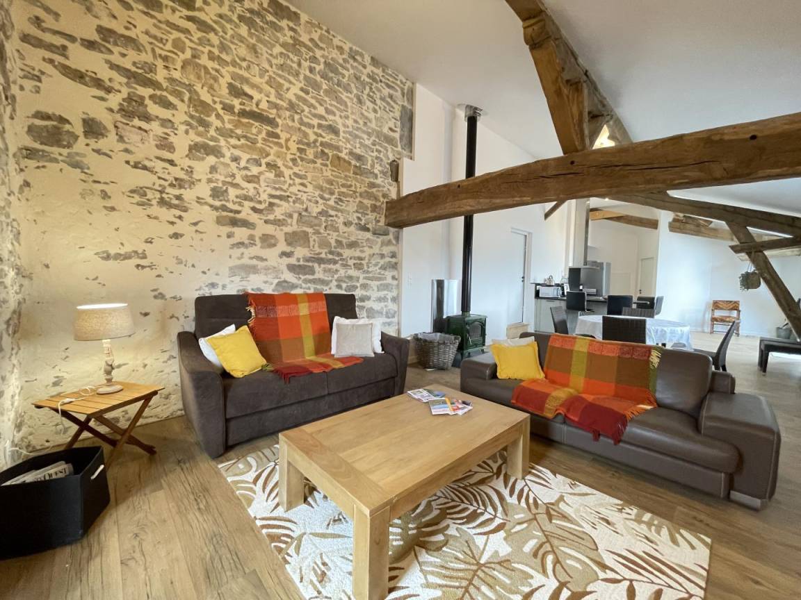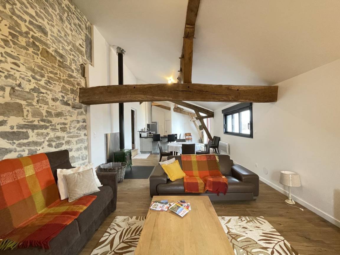Sie betreten direkt das große, helle Wohnzimmer (mit restaurierten Holzbalken und Mauerwerk). Komfort auf Drei-Sterne-Niveau.