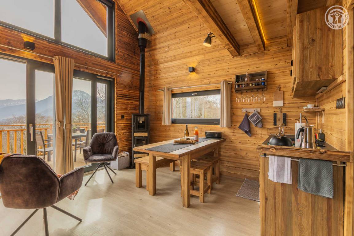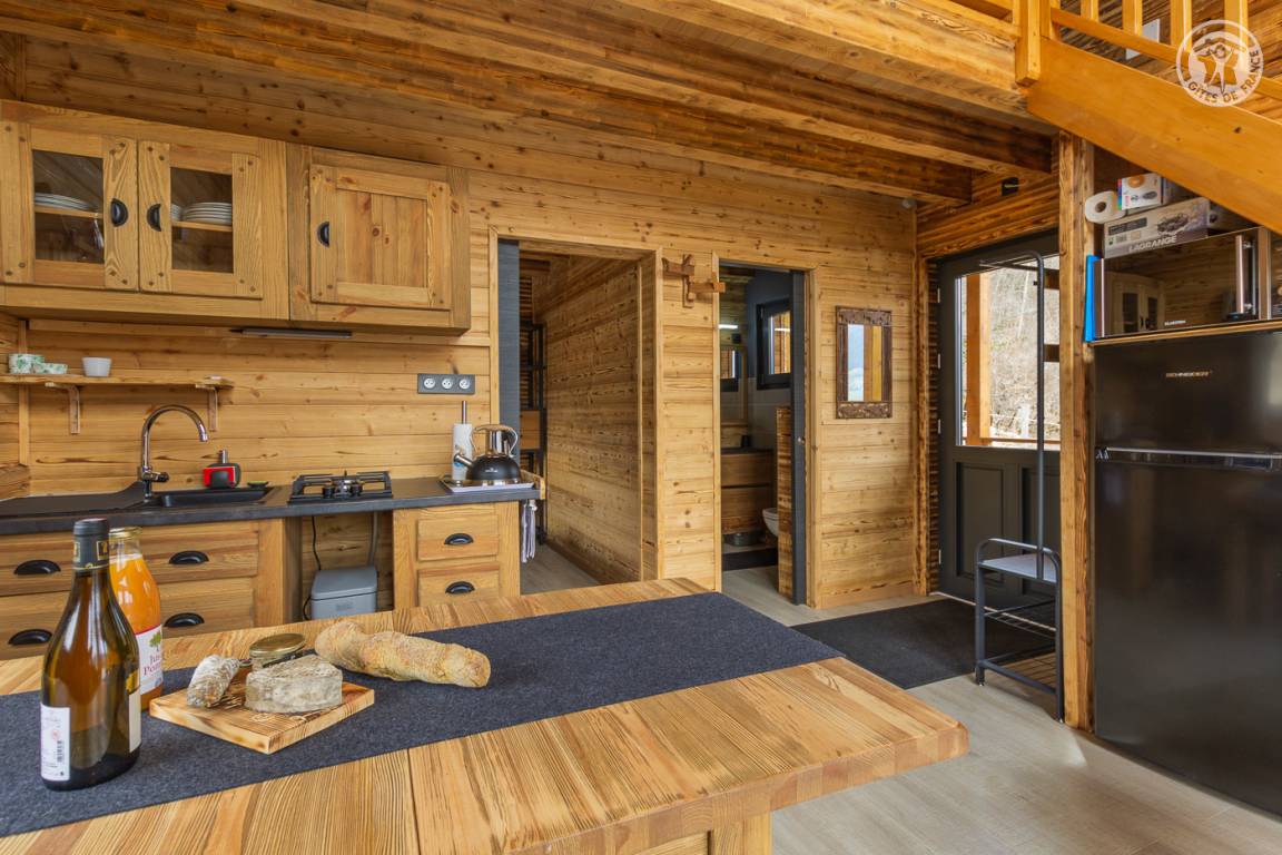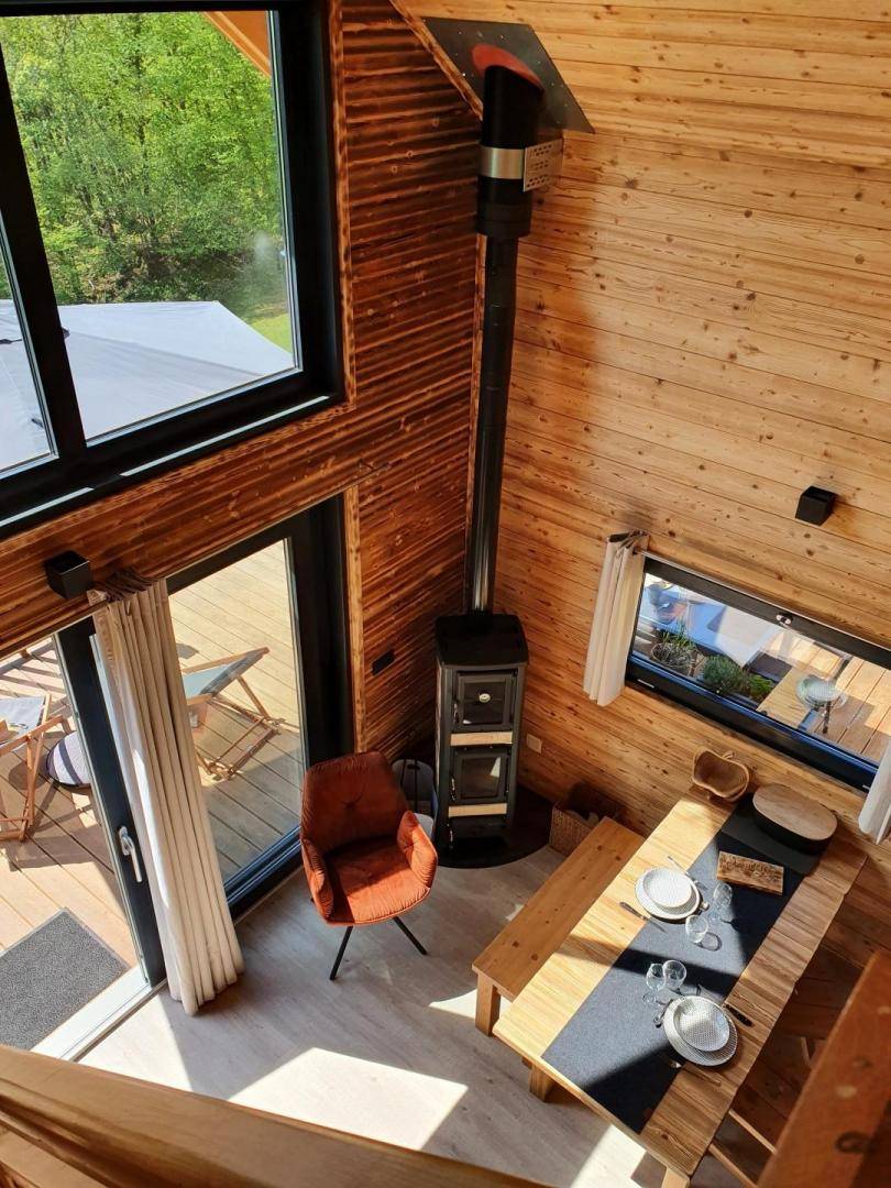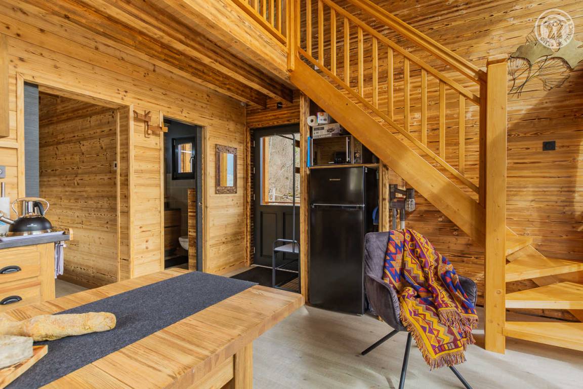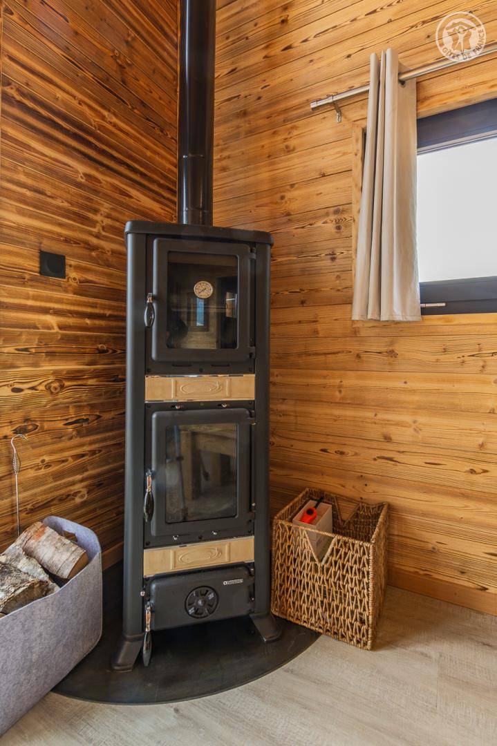 Freistehendes Holzrahmen-Chalet auf 2 Ebenen. Erdgeschoss: Wohnküche (2 Gasflammen, kombinierte Mikrowelle), Holzherd mit integriertem Backofen, Schlafzimmer (1 Doppelbett 160 x 200 cm) mit eigenem Bad (große Dusche und WC). Obergeschoss: Mezzanine mit leerem Wohnzimmer mit Loungebereich (Schlafsofa 130 x 190 cm) mit SmartTV-Fernseher, Bluetooth-Lautsprecher, einem Ventilator und einem Doppelbett (160 x 200 cm). Gesamtwohnfläche: 39 m² Dachgeschoss inklusive. Terrasse mit Nordischem Bad. Land mit Wäldern auf 5ha. Gemeinsame Waschküche (Waschmaschine und Trockner) in einem kleinen Chalet nebenan.