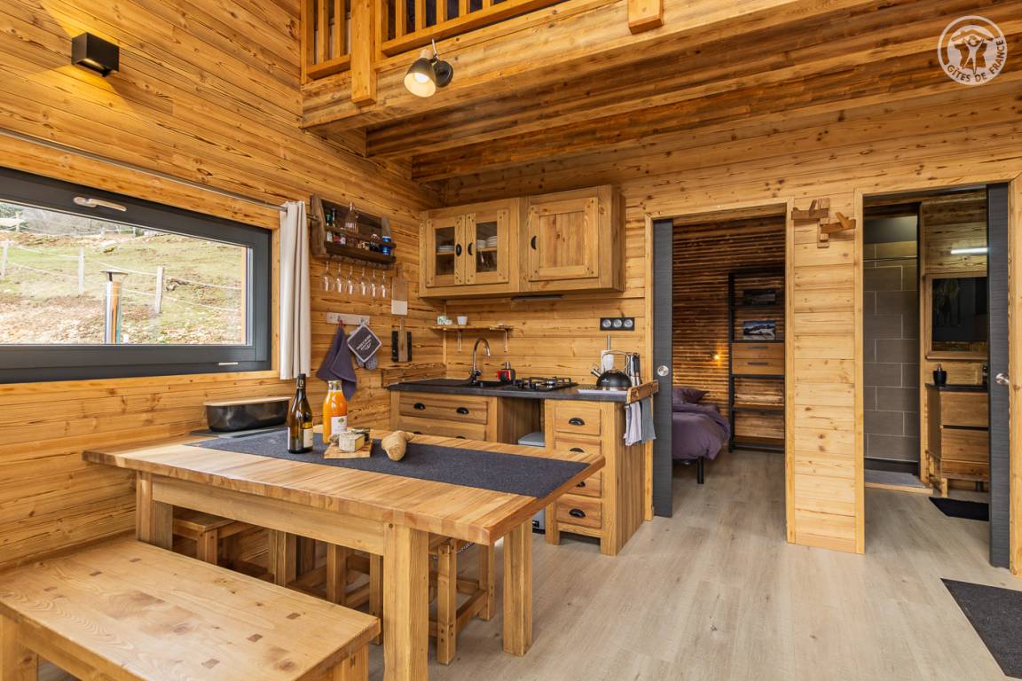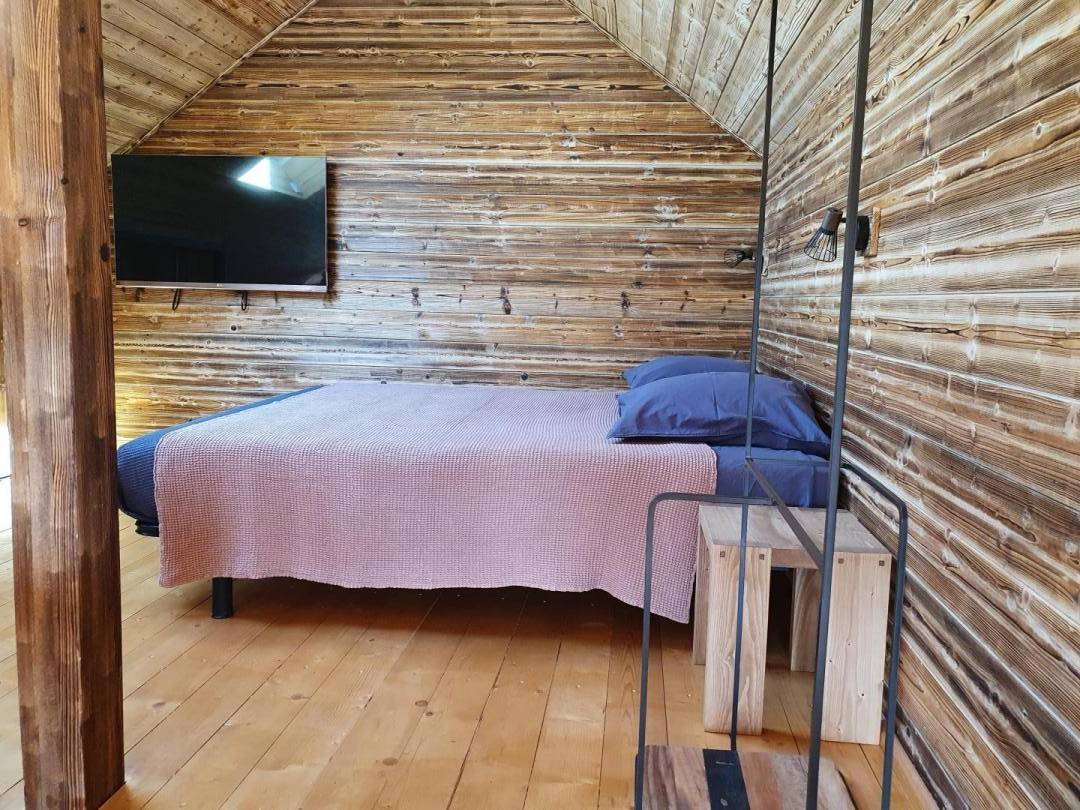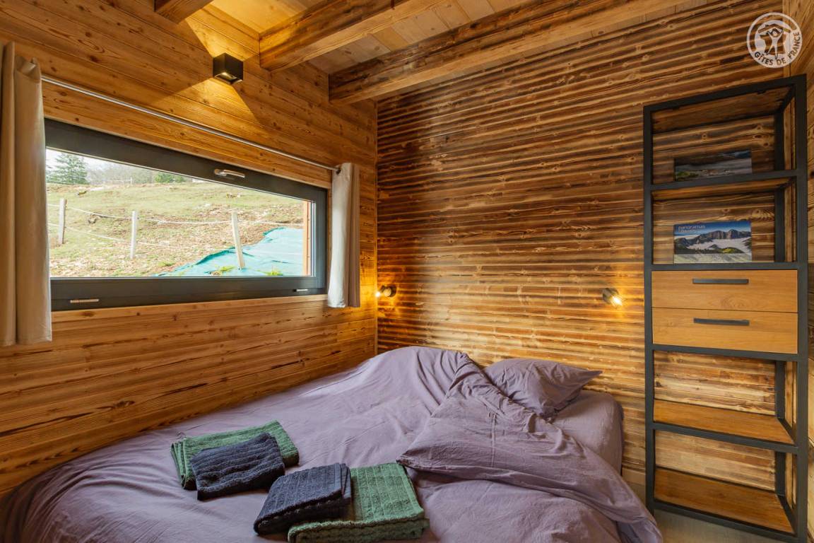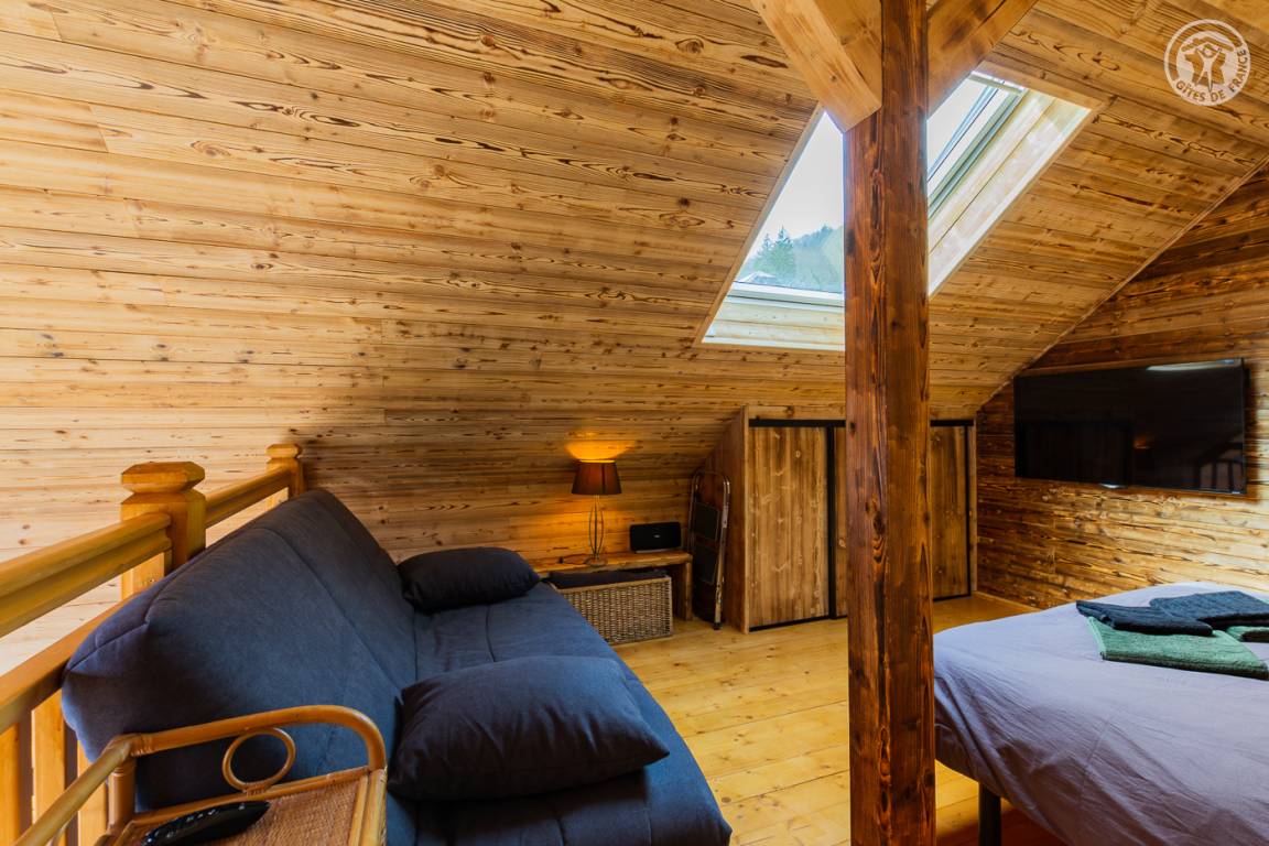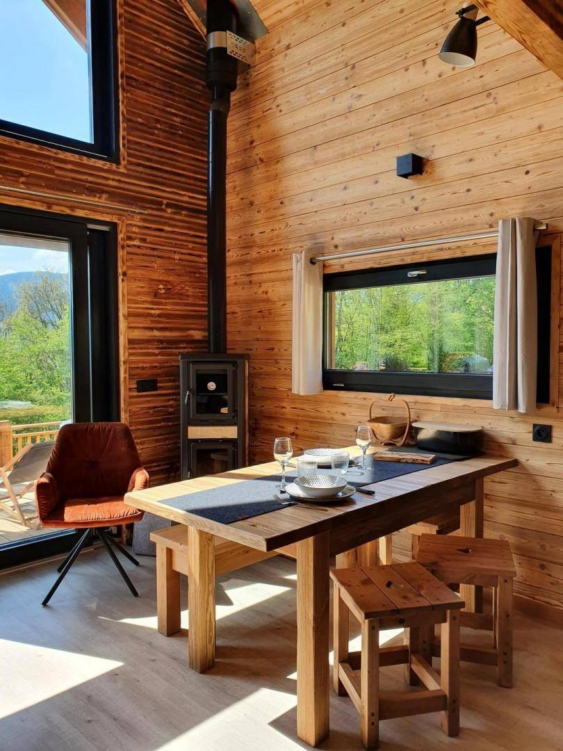 Freistehendes Holzrahmen-Chalet auf 2 Ebenen. Erdgeschoss: Wohnküche (2 Gasflammen, kombinierte Mikrowelle), Holzherd mit integriertem Backofen, Schlafzimmer (1 Doppelbett 160 x 200 cm) mit eigenem Bad (große Dusche und WC). Obergeschoss: Mezzanine mit leerem Wohnzimmer mit Loungebereich (Schlafsofa 130 x 190 cm) mit SmartTV-Fernseher, Bluetooth-Lautsprecher, einem Ventilator und einem Doppelbett (160 x 200 cm). Gesamtwohnfläche: 39 m² Dachgeschoss inklusive. Terrasse mit Nordischem Bad. Land mit Wäldern auf 5ha. Gemeinsame Waschküche (Waschmaschine und Trockner) in einem kleinen Chalet nebenan.