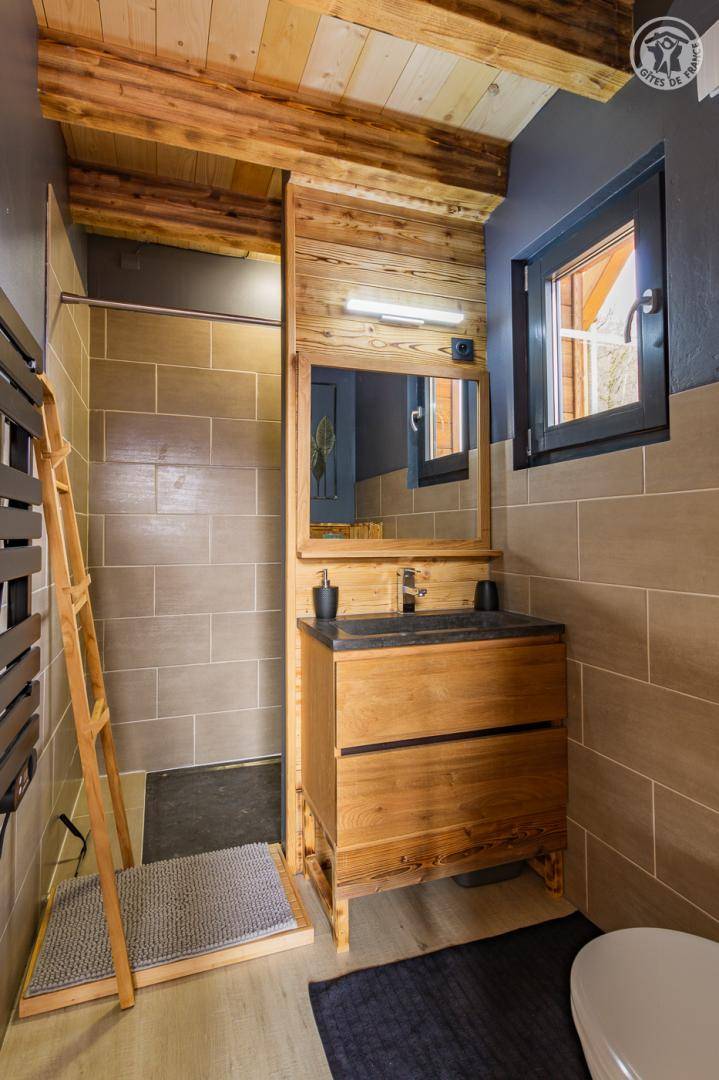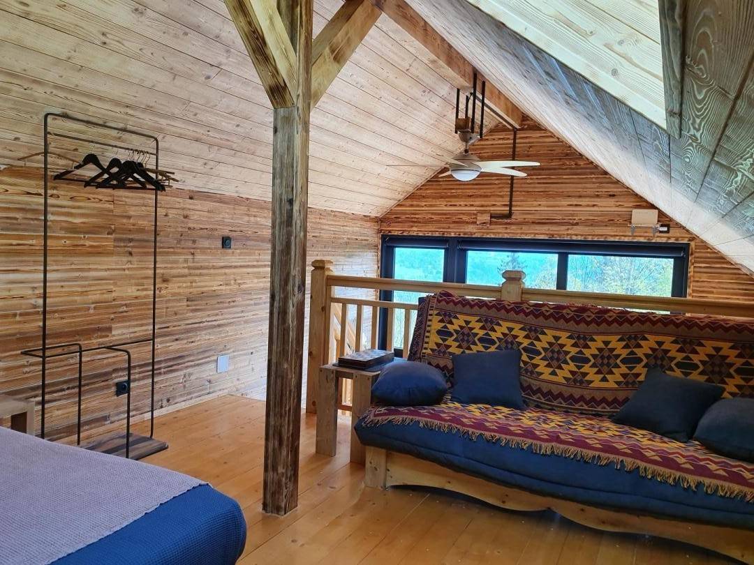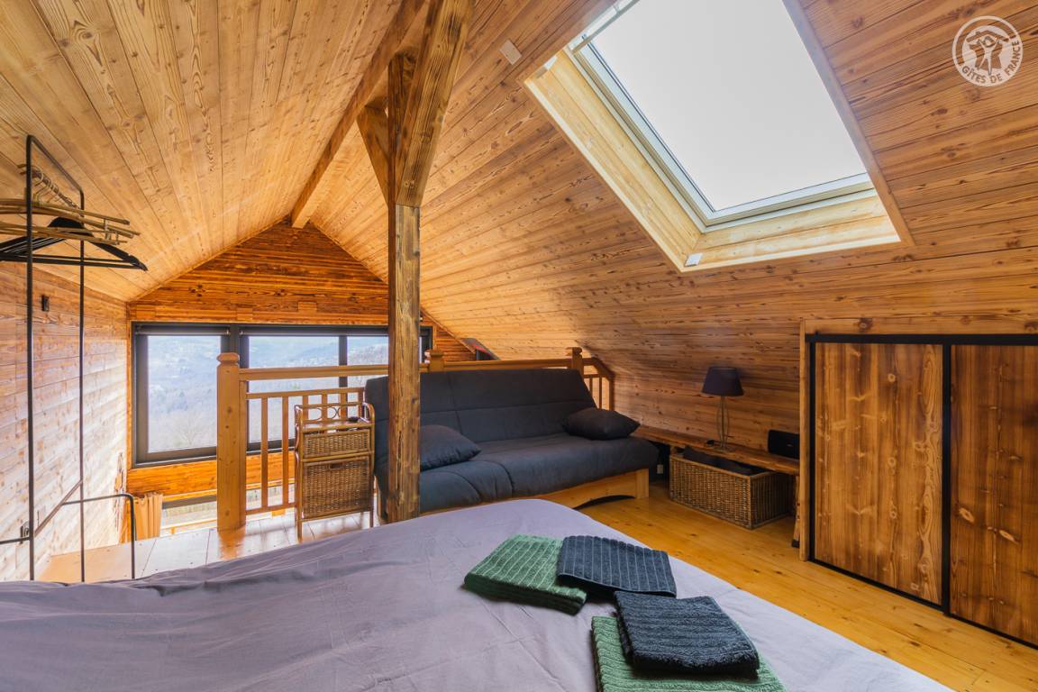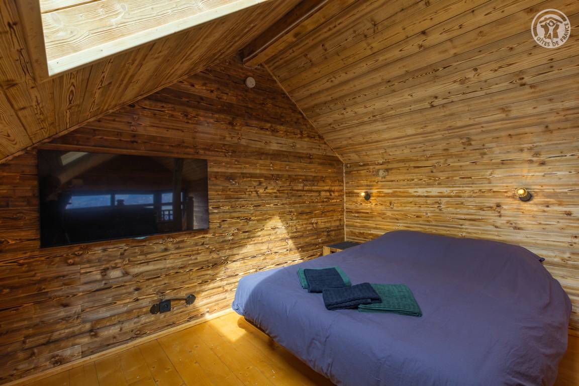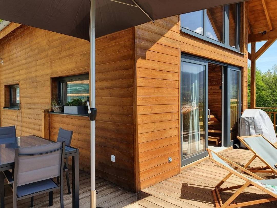 Freistehendes Holzrahmen-Chalet auf 2 Ebenen. Erdgeschoss: Wohnküche (2 Gasflammen, kombinierte Mikrowelle), Holzherd mit integriertem Backofen, Schlafzimmer (1 Doppelbett 160 x 200 cm) mit eigenem Bad (große Dusche und WC). Obergeschoss: Mezzanine mit leerem Wohnzimmer mit Loungebereich (Schlafsofa 130 x 190 cm) mit SmartTV-Fernseher, Bluetooth-Lautsprecher, einem Ventilator und einem Doppelbett (160 x 200 cm). Gesamtwohnfläche: 39 m² Dachgeschoss inklusive. Terrasse mit Nordischem Bad. Land mit Wäldern auf 5ha. Gemeinsame Waschküche (Waschmaschine und Trockner) in einem kleinen Chalet nebenan.