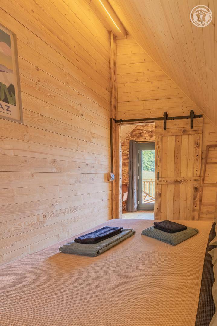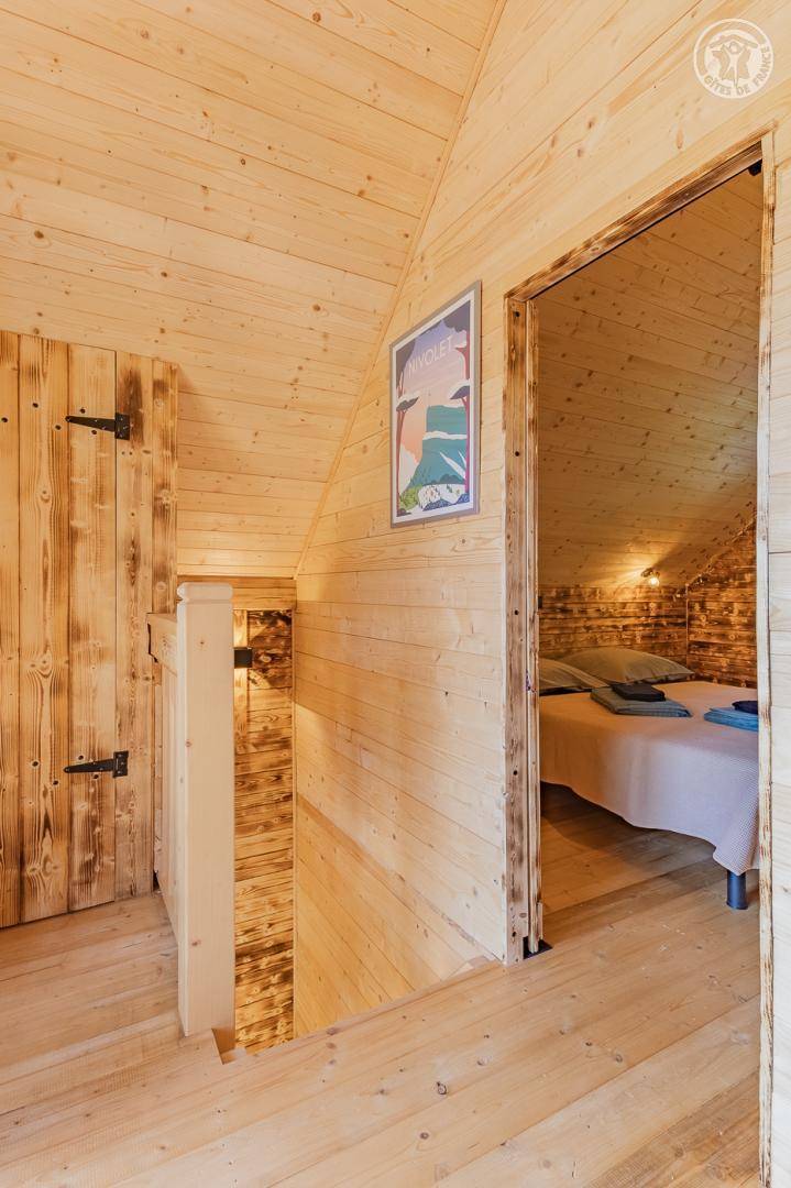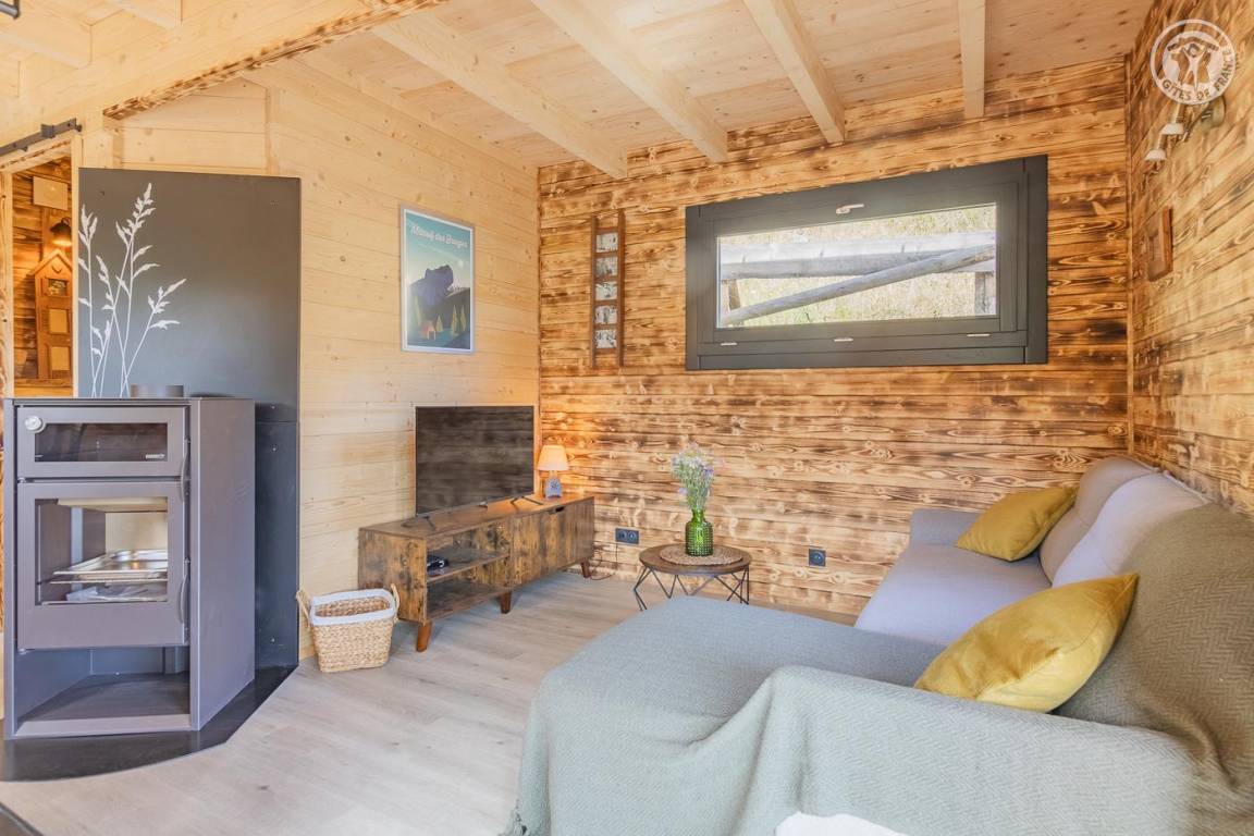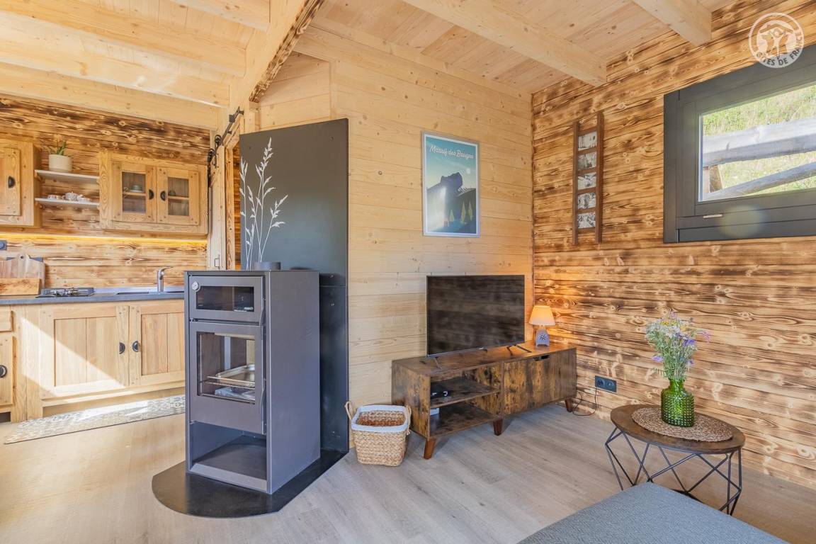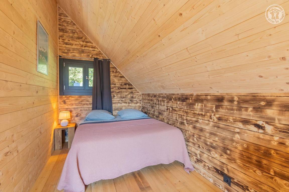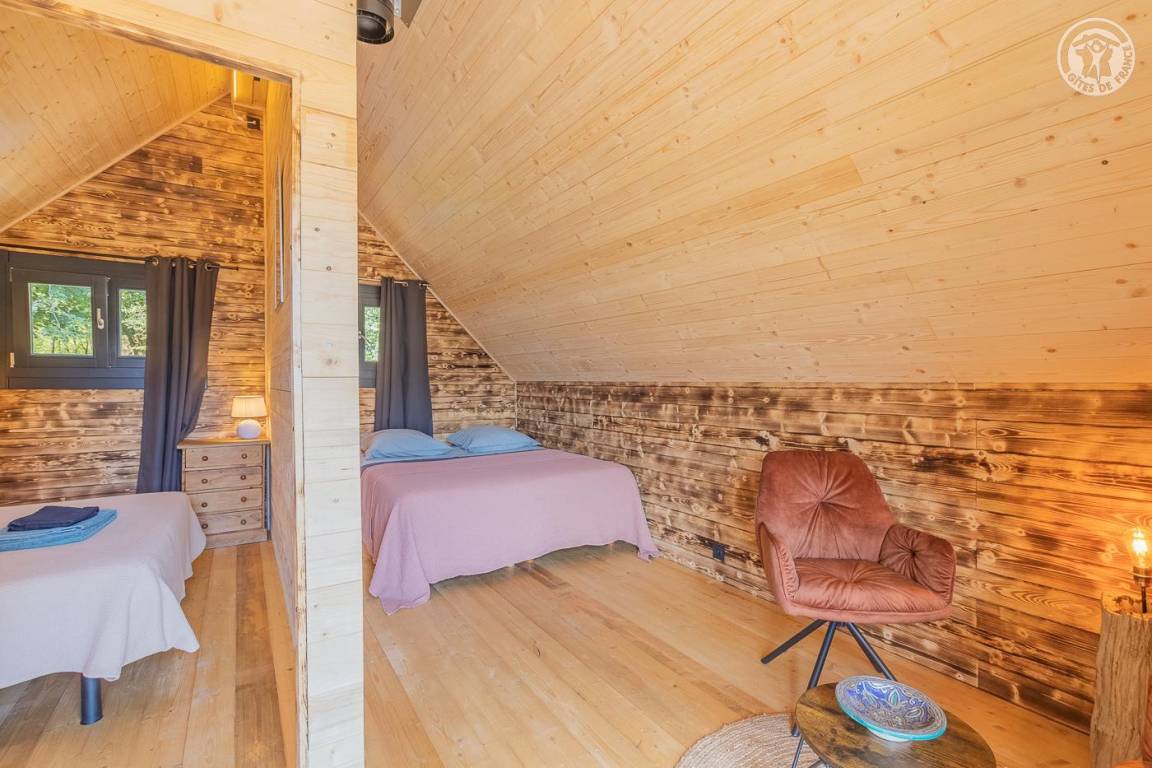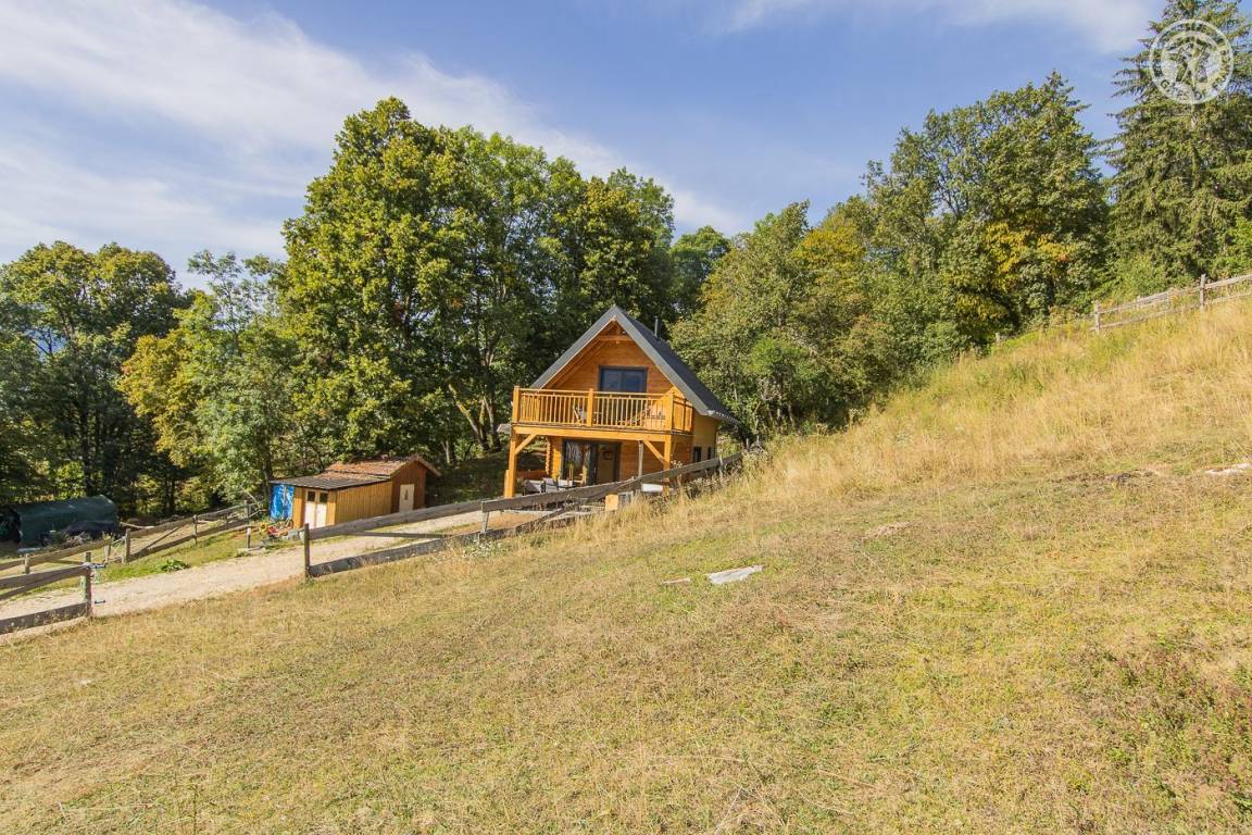 Freistehendes Holzchalet auf 2 Ebenen. Erdgeschoss: Wohnküche (2 Gasbrenner, kombinierter Mikrowellenherd, Holzherd mit integriertem Backofen, ein hoher Tisch mit 4 Barstühlen), Wohnbereich (Smart Connected TV), ein Duschbad (Dusche, 2 Waschbecken und WC) , überdachte Terrasse mit holzbefeuertem Nordic-Bad. Obergeschoss: 1 Schlafzimmer (1 Doppelbett 160x200 cm), Zwischengeschoss mit Schlafbereich unter dem Dach (1 Doppelbett 160x190 cm) und Ruhebereich, Zugang zur Terrasse. Gesamtnutzfläche: 48 m² Dachgeschossteile inklusive. Grundstück mit Wald auf 5ha. Gemeinsamer Waschraum der 3 Chalets (Waschmaschine und Trockner) in einem kleinen Chalet nebenan.