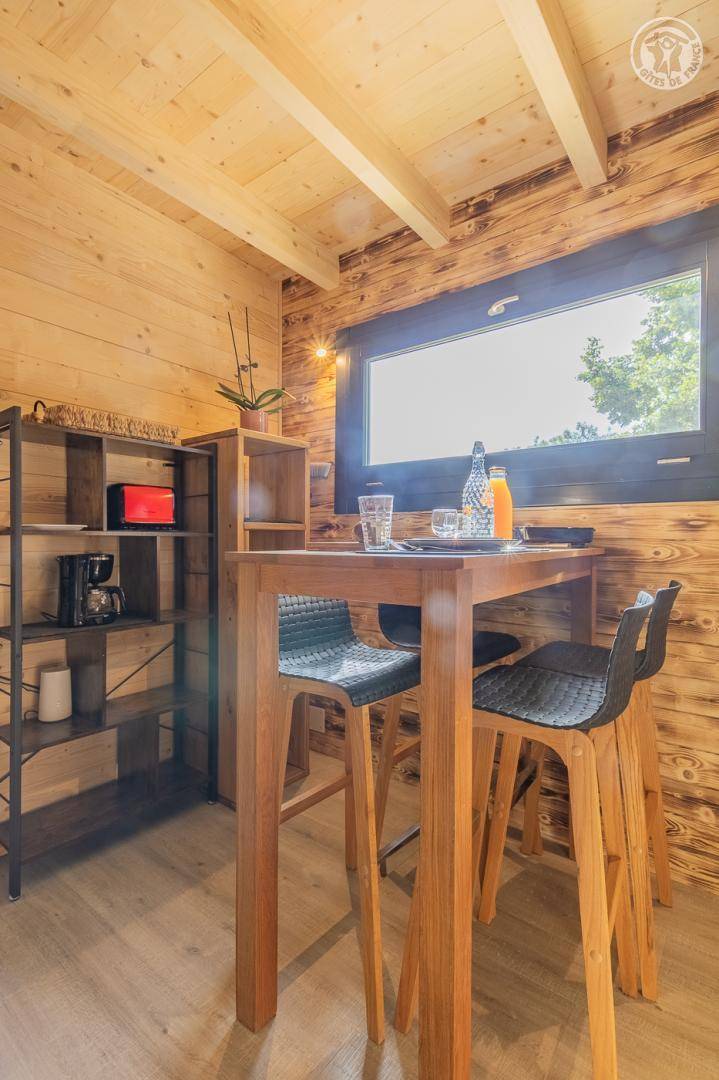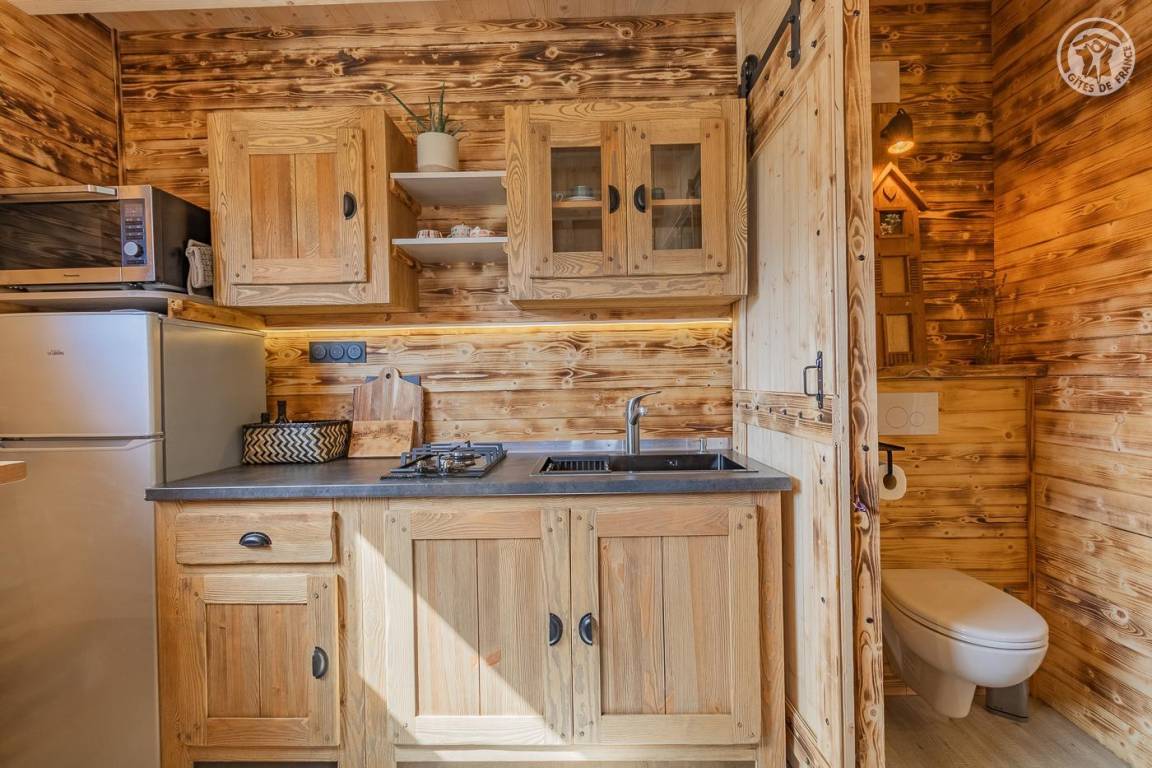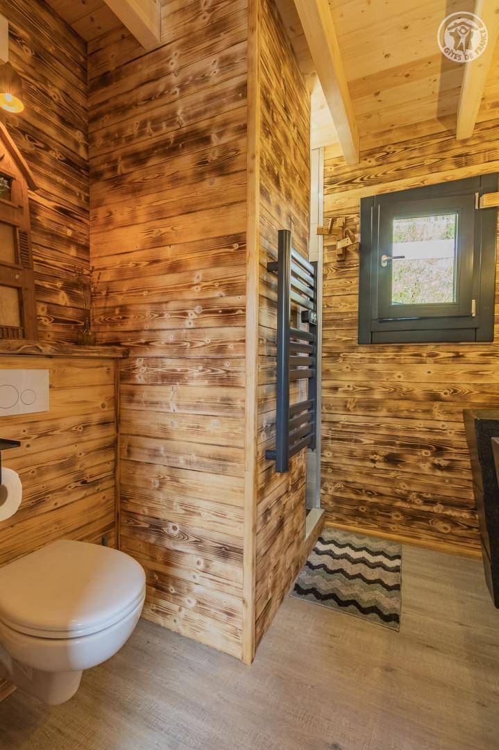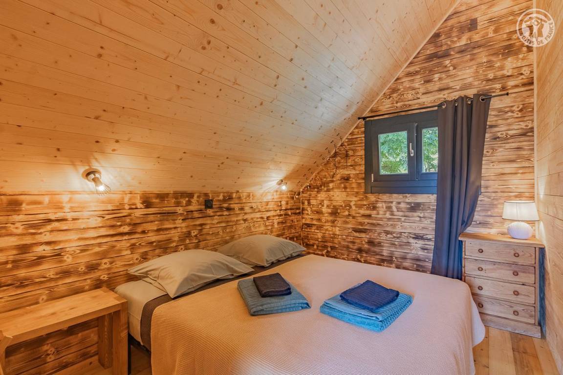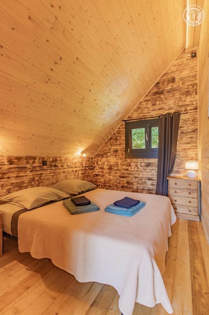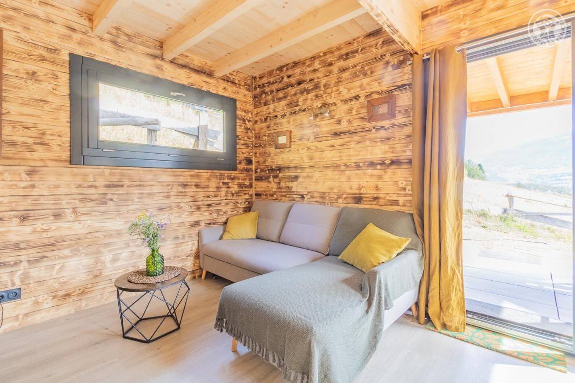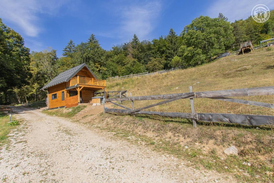 Freistehendes Holzchalet auf 2 Ebenen. Erdgeschoss: Wohnküche (2 Gasbrenner, kombinierter Mikrowellenherd, Holzherd mit integriertem Backofen, ein hoher Tisch mit 4 Barstühlen), Wohnbereich (Smart Connected TV), ein Duschbad (Dusche, 2 Waschbecken und WC) , überdachte Terrasse mit holzbefeuertem Nordic-Bad. Obergeschoss: 1 Schlafzimmer (1 Doppelbett 160x200 cm), Zwischengeschoss mit Schlafbereich unter dem Dach (1 Doppelbett 160x190 cm) und Ruhebereich, Zugang zur Terrasse. Gesamtnutzfläche: 48 m² Dachgeschossteile inklusive. Grundstück mit Wald auf 5ha. Gemeinsamer Waschraum der 3 Chalets (Waschmaschine und Trockner) in einem kleinen Chalet nebenan.