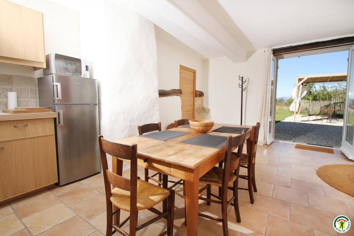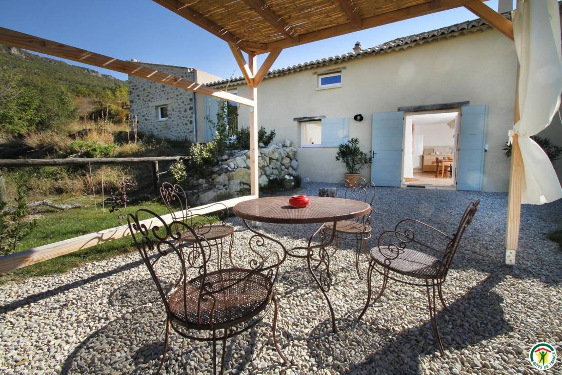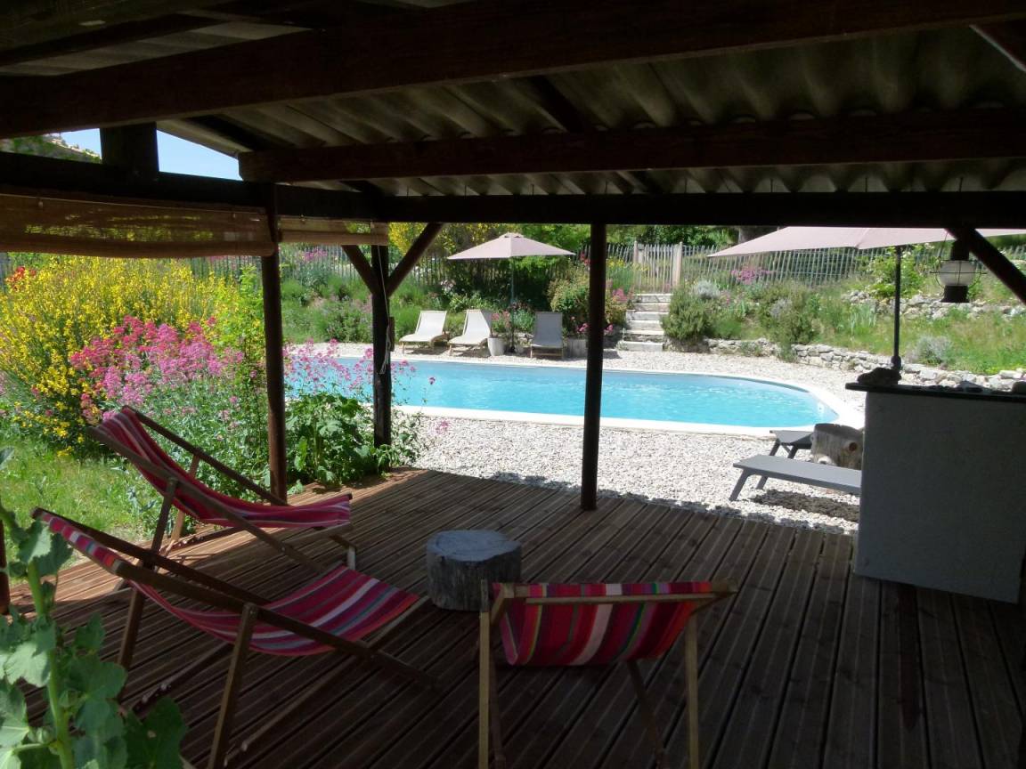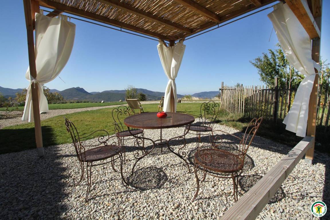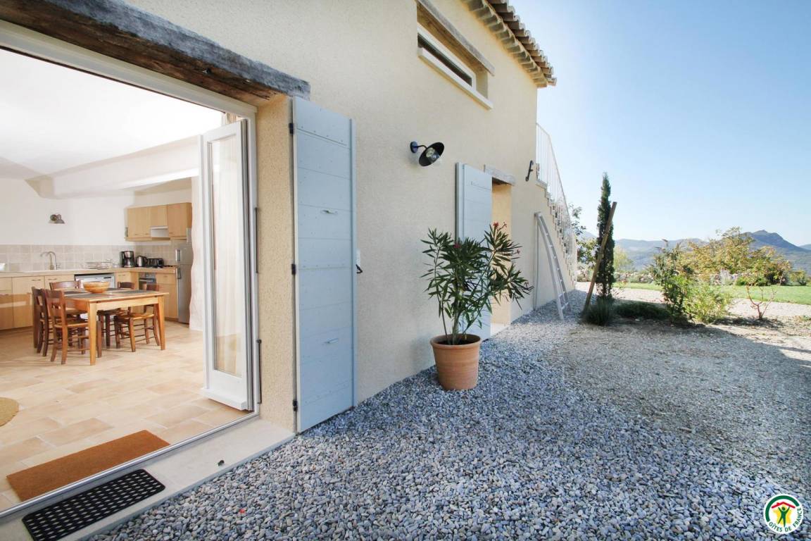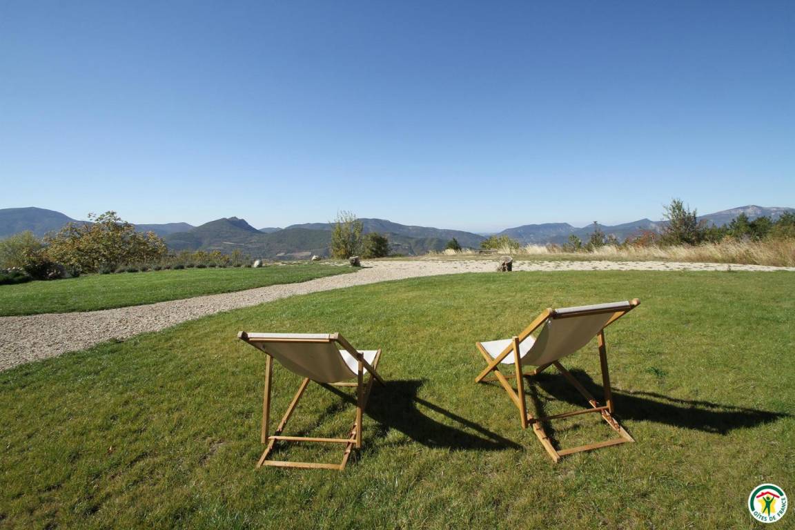 „Devenir paysage et devenir loup. Au bout d'une route en lacets, qui jamais ne finit, sous le Col de Corbière, l'avant dernier mas, planté plein sud (760m) habité par le friselis de l'eau. Vue à 360° - ou presque- Ventoux, Cols d'Ey, d'Onglon, des 3 Pommiers, la Lance et les rondeurs d'Angèle (la Montagne) cachées par la serre Chapeau et la forêt du Coucou. Ste-Jalle et la vallée de l'Ennuyé, porte vers la vallée de l'Eygues, celle de l'Ouvèze (Buis-les-B) et de la Méouge (au sud-est). Idéal pour courir les massifs, pister l'invisible -la meute dite du casset- et goûter l'ombre des tilleuls au débourrage dans les villages. Le bonheur, si près du ciel !“