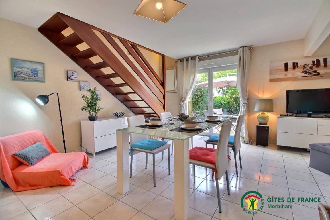 Arradon ist ein sehr beliebter Badeort mitten im Golf von Morbihan, einer der schönsten Buchten der ganzen Welt. Arradon heißt auch "Golf-Riviera" - die Landschaften sind so schön wie auf Postkarten, 15 km Wanderwege, kleine Buchten und Strände, ideal für Angler und für Liebhaber von Badespaß und Wassersport. Ein angenehmer Urlaub in Perspektive! Ferienhaus anliegend an eine andere Unterkunft. Wohnbereich 35m² mit Küche/Wohn- und Esszimmer (1 Bett 140), WC, Bad mit Dusche. 1. Stock: 2 Zi. (1 Bett 180, 1 Bett 160 auseinanderstellbar in 2 Betten), Bad mit Dusche/WC. Ein Ort zum Wohlfühlen, geschlossener Garten mit Südausrichtung und mit Blumen und Bäumen.
