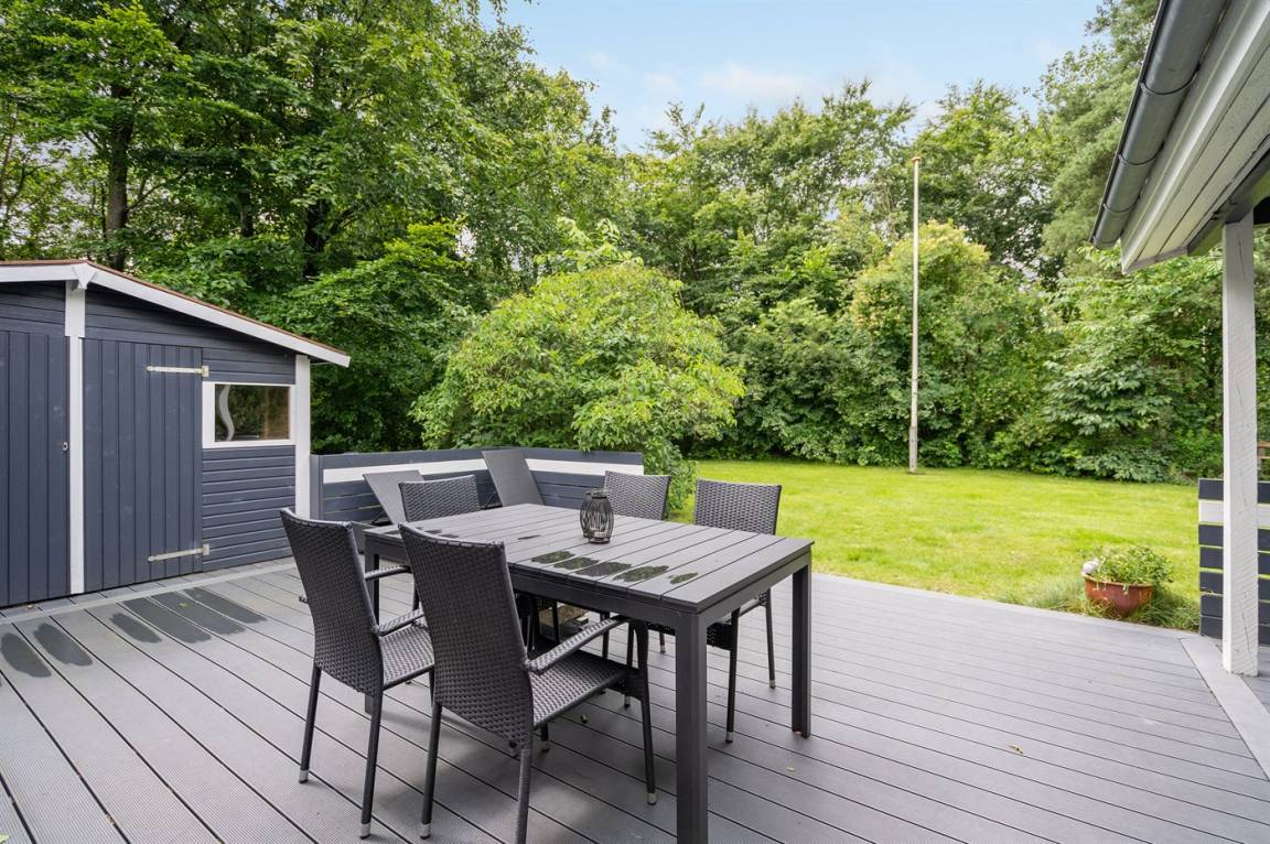 DraußenDie Ferienunterkunft liegt auf einem 850 m² großen Naturgrundstück. Das Grundstück ist eingezäunt. Die Entfernung zum Meer beträgt 30000 m.Die Entfernung zum Wattenmeer beträgt 17000 m. Die nächste Einkaufsmöglichkeit liegt 600 m entfernt. Es steht ein 55 m² Terrassenareal zur Verfügung. Außerdem gibt es 15 m² überdachte Terrasse. Es steht ein Grill zur Verfügung. Parkplatz auf dem Grundstück.