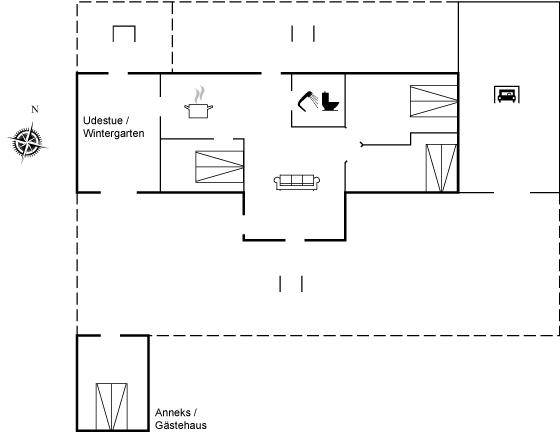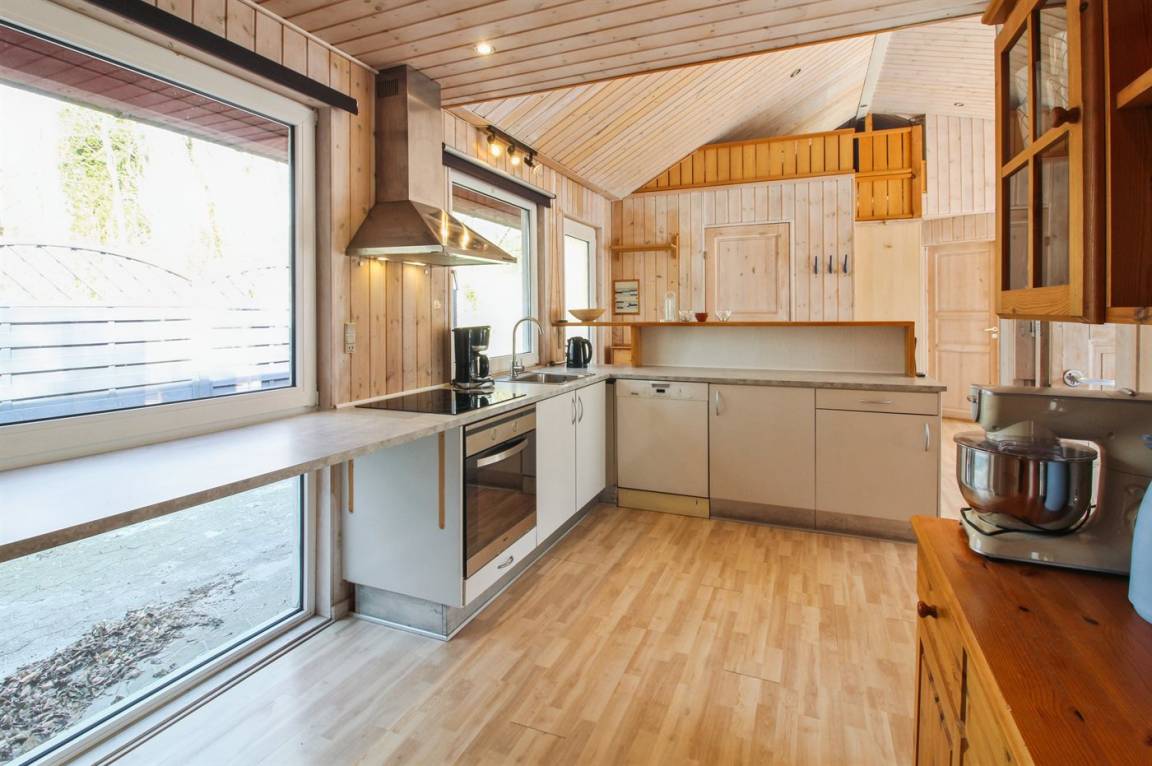 Ferienhaus mit spannender Einrichtung und viel Platz für 6 Personen. Das Haus ist mit einer offenen Küche und einem Wohnzimmer ausgestattet und ein Zimmer kann geöffnet werden, so dass es auch Teil der Wohnküche ist. Zum Haus gehört auch einen Gästehaus mit 2 Betten.