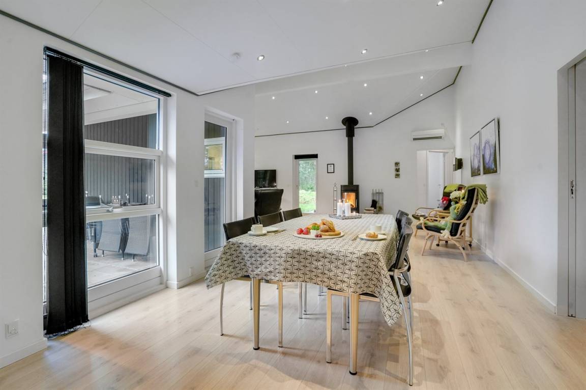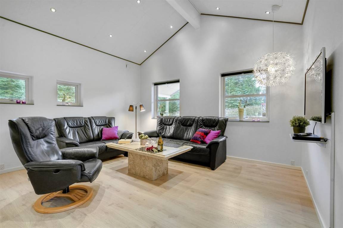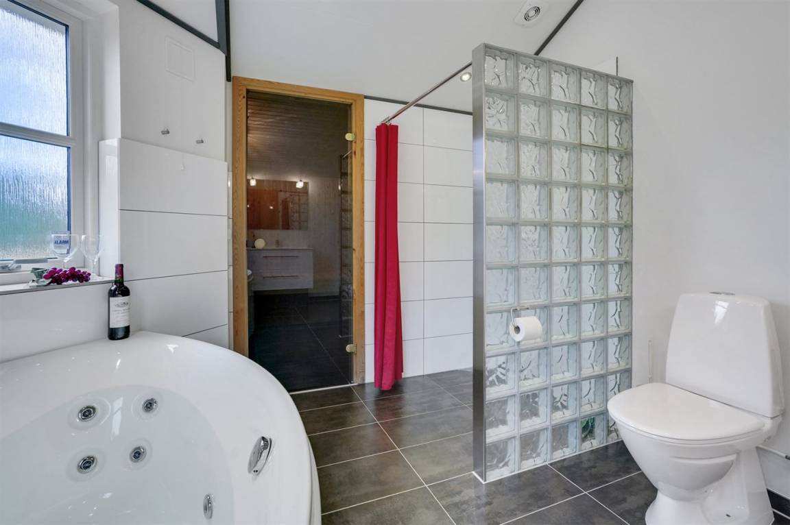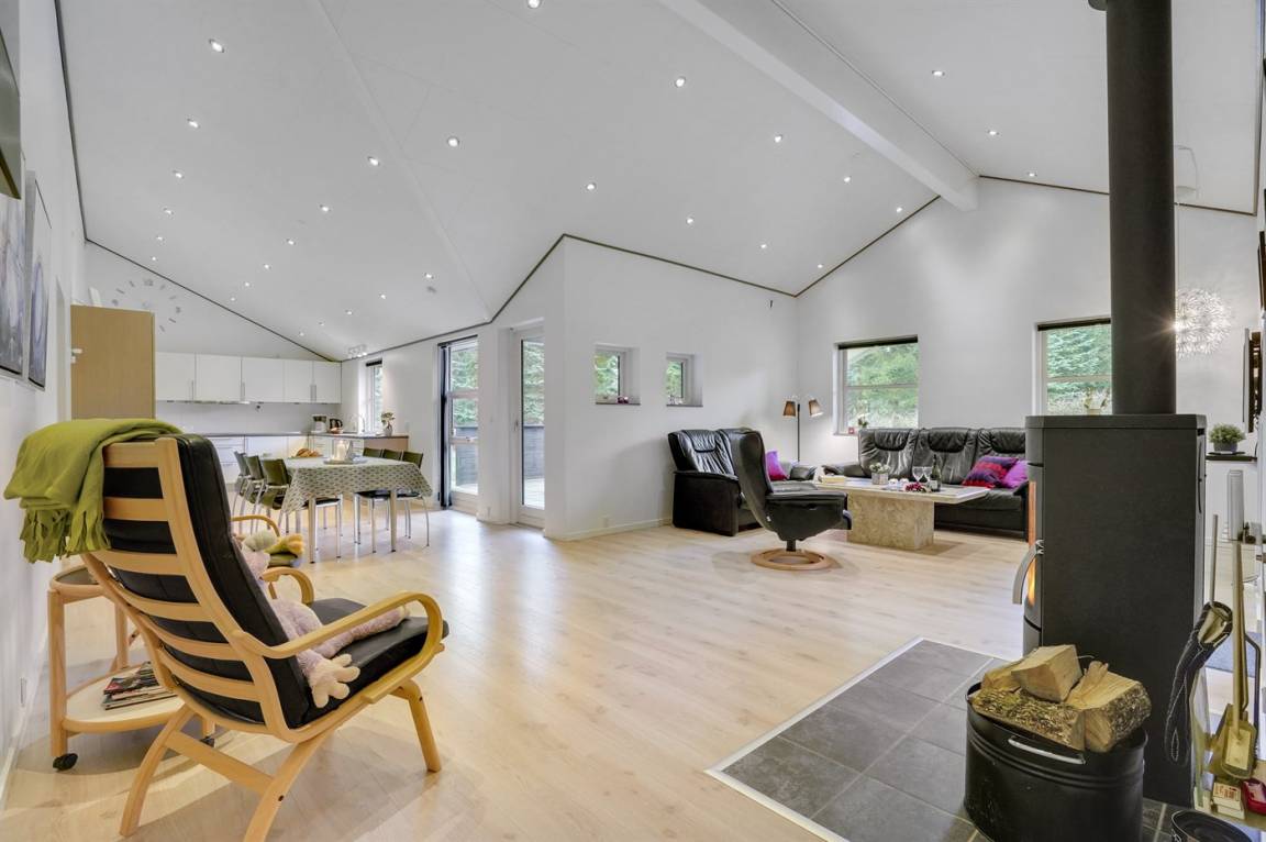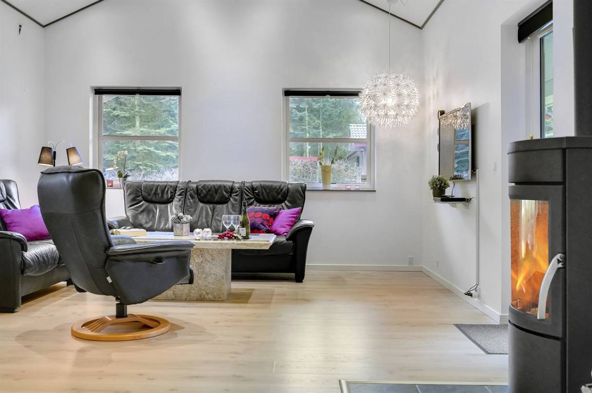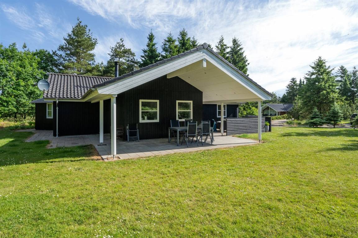 Ein gut ausgestattetes Luksus-Ferienhaus aus besten Materialien. Das Haus verfügt über 2 Badezimmer, von denen das eine einen großen Whirlpool und eine Sauna enthält. Das Wohnzimmer ist geschmackvoll eingerichtet - hier finden Sie Möbel von hoher Qualität und einen Kaminofen. All dies trägt dazu bei dem Haus das ganz richtige Ambiente zu verleihen. Zum Haus gehört eine teilweise überdachte Terrasse, auf der Sie die Sonne und die Natur in vollen Zügen genießen können.
