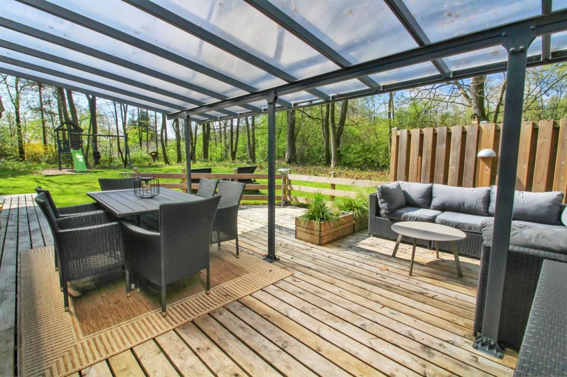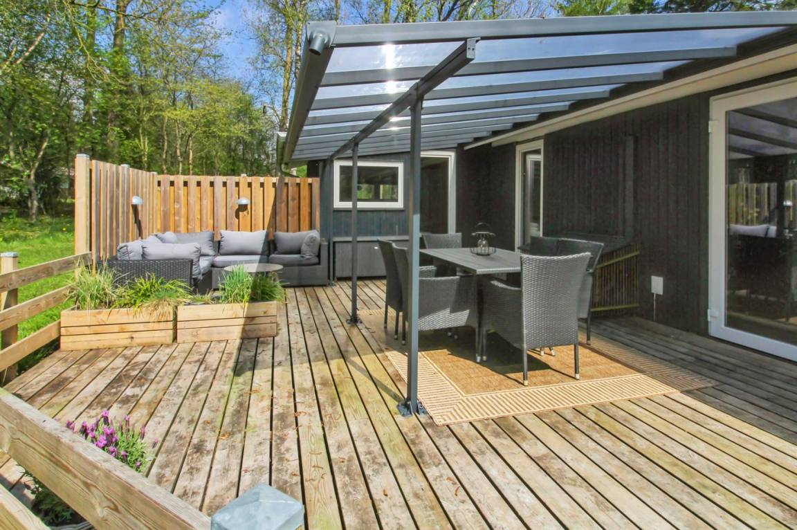 Das Ferienhaus liegt auf einem schönen Grundstück mit Platz für Ballspiele und andere Aktivitäten im Freien. Vom Küchen-/Essbereich aus gibt es Zugang zu den Terrassen des Hauses, die sowohl nach Osten als auch nach Westen hin ausgerichtet sind. Auf der Terrasse steht ein Hot-Tub zur Verfügung – hier kann man sich im warmen Wasser entspannen, während man am Abendhimmel die Sterne betrachtet.