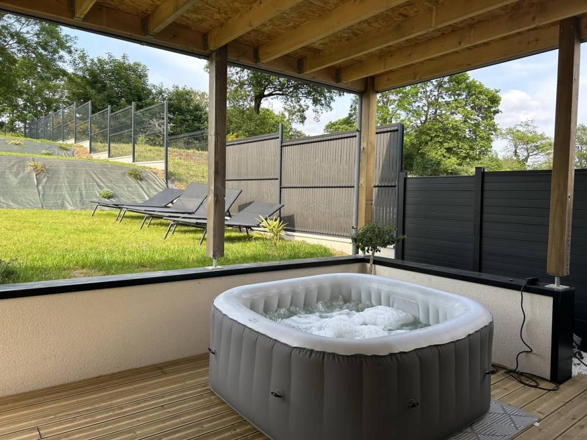 Draußen: ein Garten, eine Betonterrasse mit aufblasbarem Whirlpool für 4 Personen (ganzjährig zugänglich), Plancha, Gartenmöbel und Liegestühle. Vor der Hütte: ein geschotterter Hof zum Parken von Autos. Garten in Entwicklung - Foto steht noch aus. Gite in einer neuen Unterteilung mit einigen Häusern, die fertiggestellt werden.