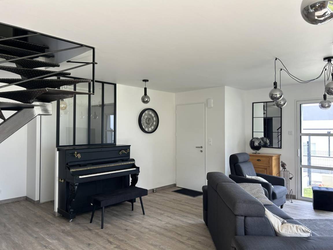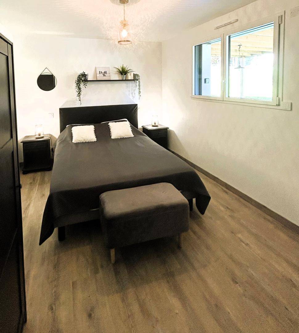 - Im Erdgeschoss: ein großes Wohnzimmer mit voll ausgestatteter Küche, Wohnzimmer und Lounge. Eine Elternsuite (1 Bett 160x200) mit eigenem Duschraum/WC, dann eine separate Toilette und eine Garage mit Waschküche.