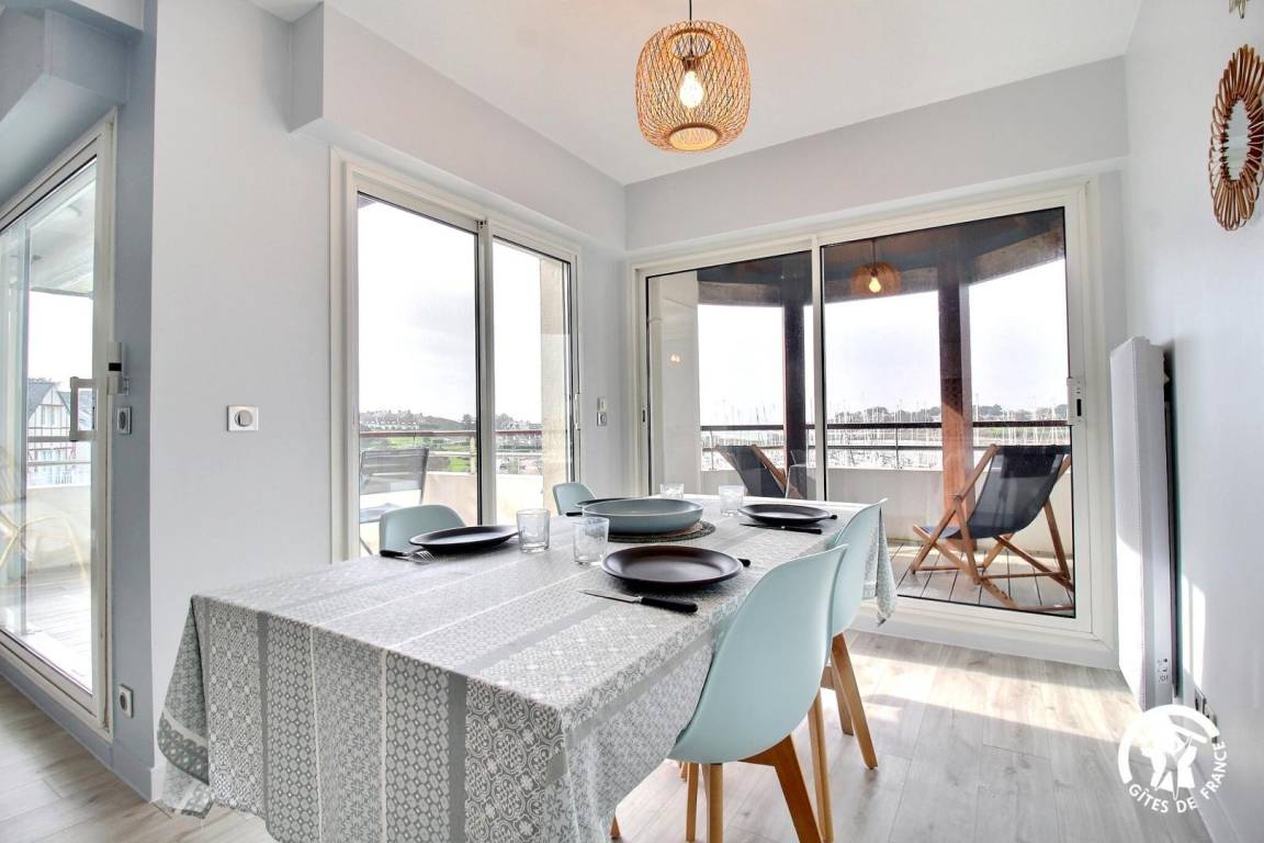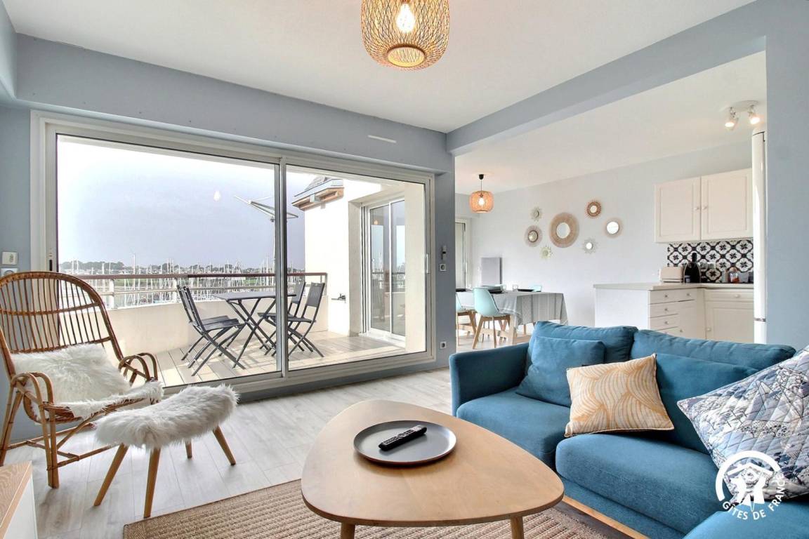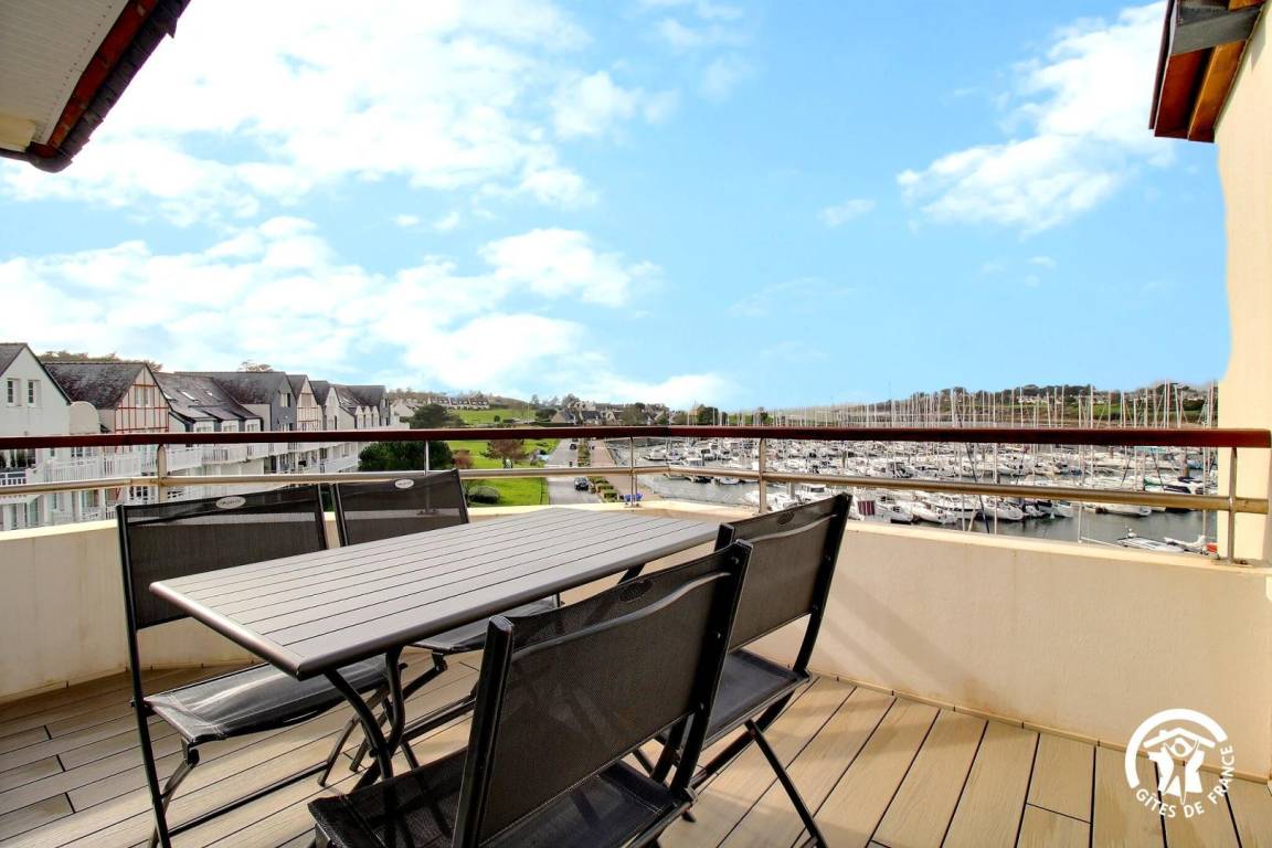 Zwei Balkone (vom Wohnzimmer aus zugänglich) mit Blick auf den Hafen von Crouesty, ausgestattet mit Esstisch und Liegestühlen.