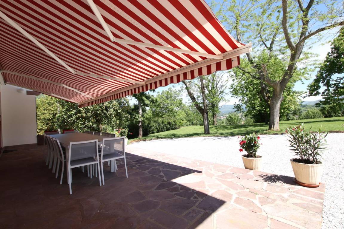 Terrasse mit Gartenmöbeln, beschattet durch Markise, Grill.