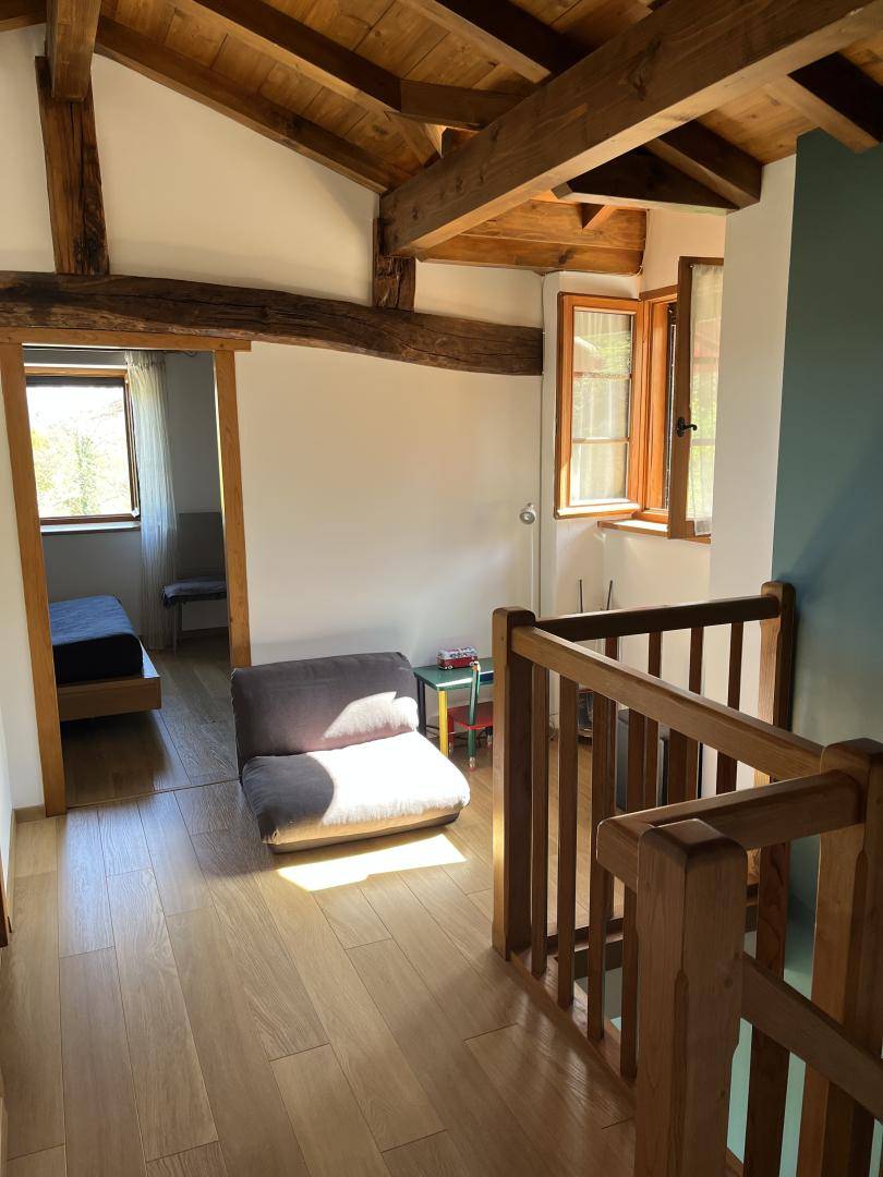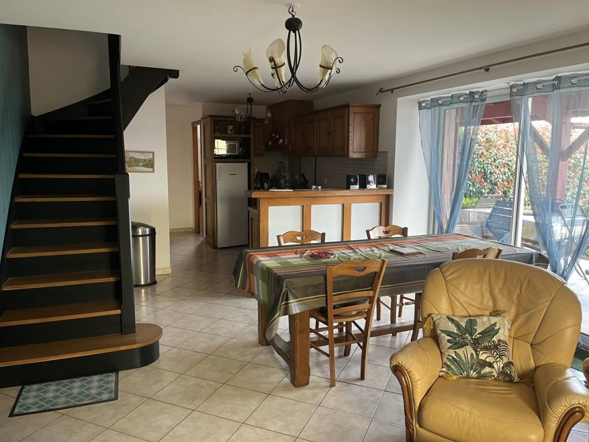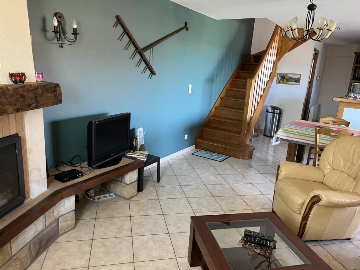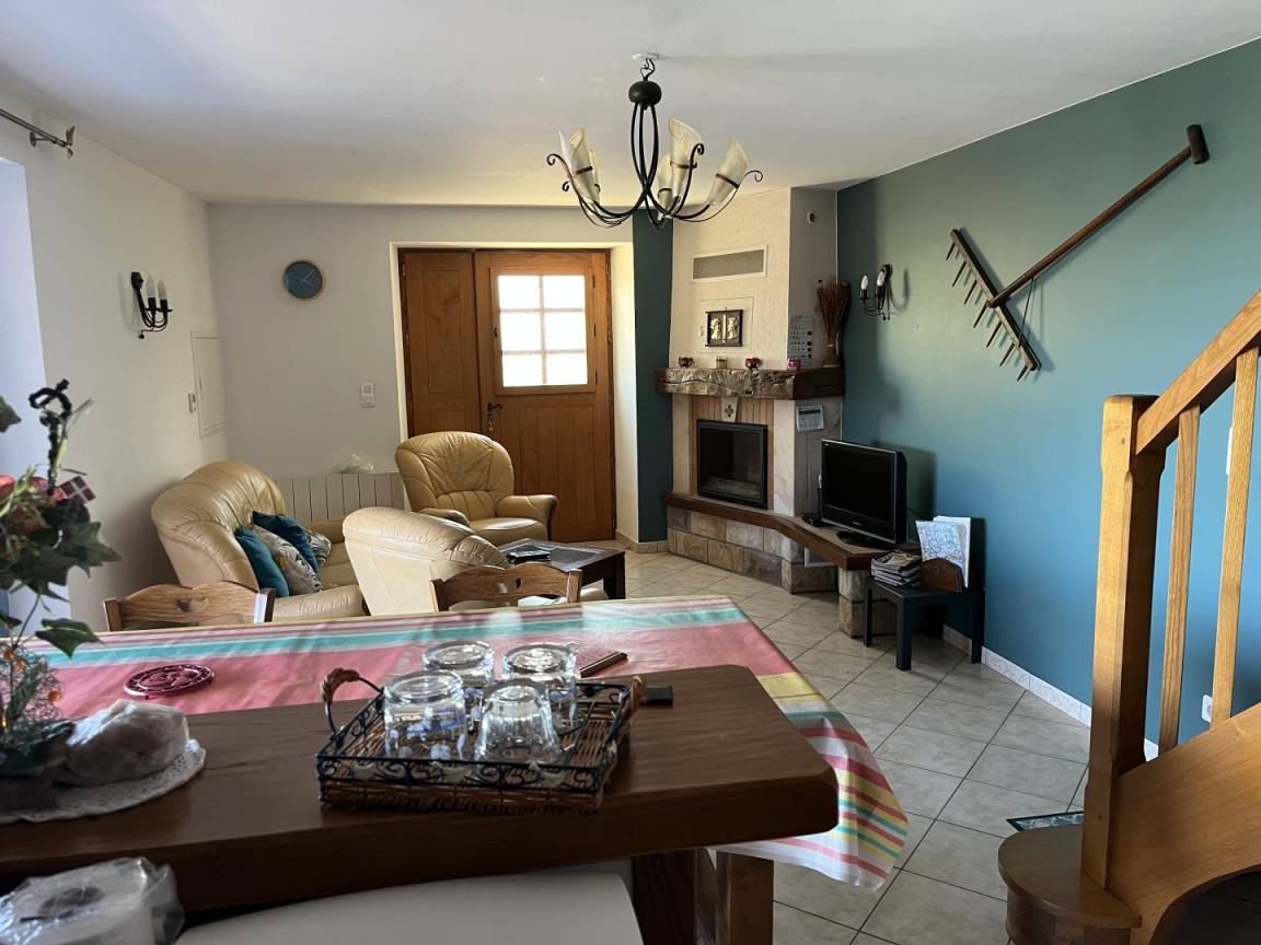 Erdgeschoss: ausgestattete Küche (Mikrowelle, Induktionskochfeld), Wohnzimmer, Wohnzimmer (Kamin), Speisekammer, Toilette.