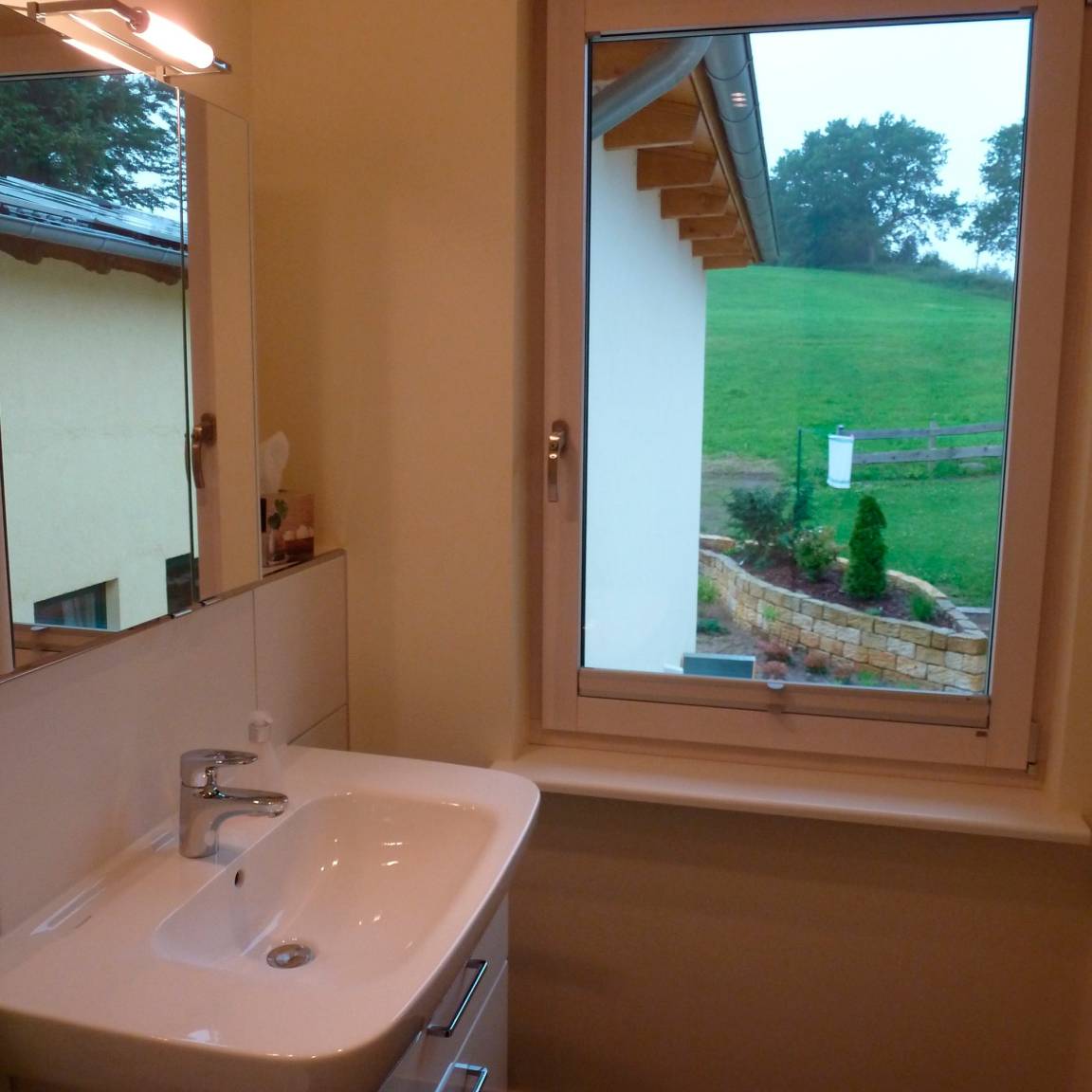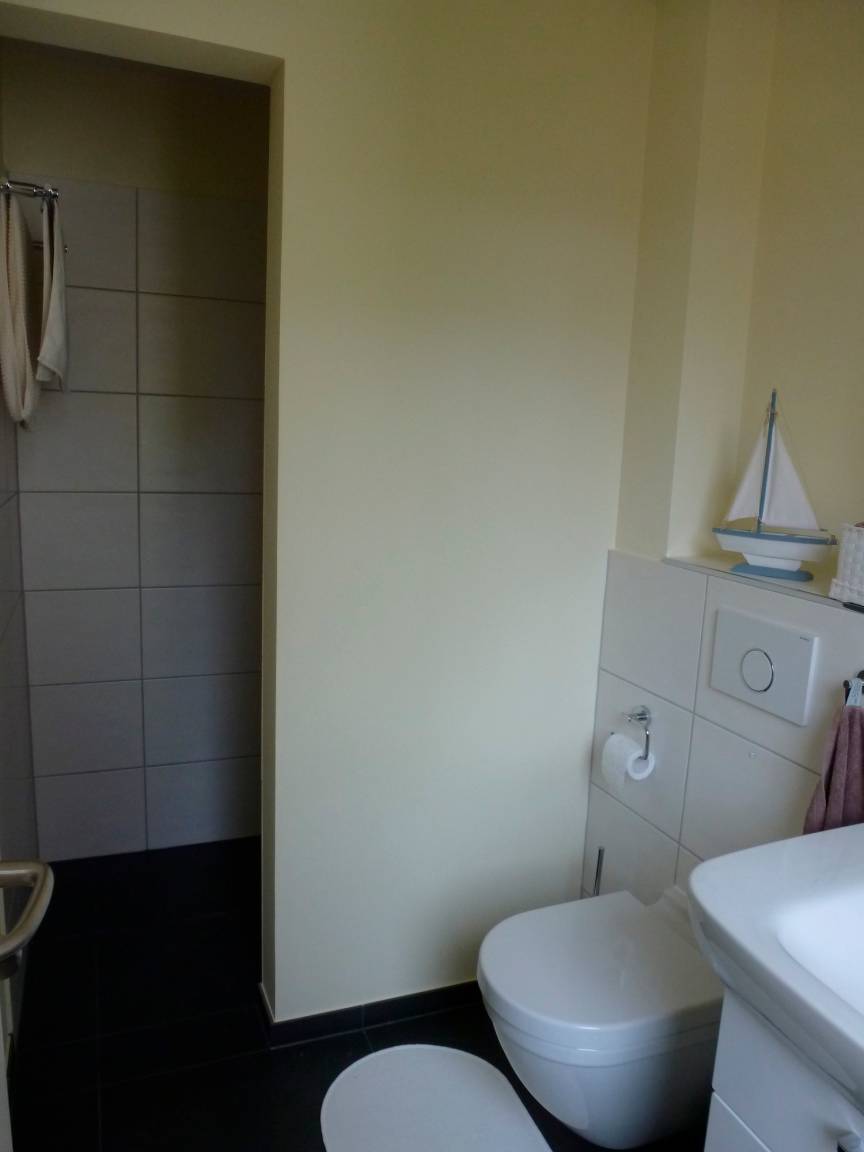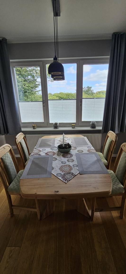 Unsere große Ferienwohnung ist ausgelegt für maximal 5 Personen. Die Wohnung ist 90m² groß und hat selbstverständlich einen separaten Eingang und einen PKW-Stellplatz. Aus dem Eingangsbereich mit Garderobe im Erdgeschoß gelangst Du in die separate Essküche, das große Wohnzimmer, das Schlafzimmer sowie das geräumige Tageslichtbad mit Dusche und WC. Die Ausstattung beinhaltet neben der komplett eingerichteten Küche (Spülmaschine, Backofen, Kochstelle, Kühlschrank mit Eisfach, Mikrowelle, Kaffeemaschine) auch SAT-TV, Audiosystem mit Radio und CD-Player, Internetzugang, 1 sehr bequemes Schlafsofa (Doppelbett 160cm, aufklappbar, 1 Schlafsessel (aufklappbar) im Wohnzimmer, Doppelbett (200cmx200cm) im Schlafzimmer, Fön im Bad. Auf Wunsch zustellbares Kinderbett. Die Wohnung wird komplett über Fußbodenheizung beheizt. Sie haben hier auch eine schöne, überdachte Terrasse mit Blick ins Grüne.